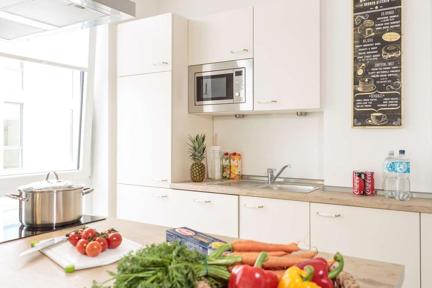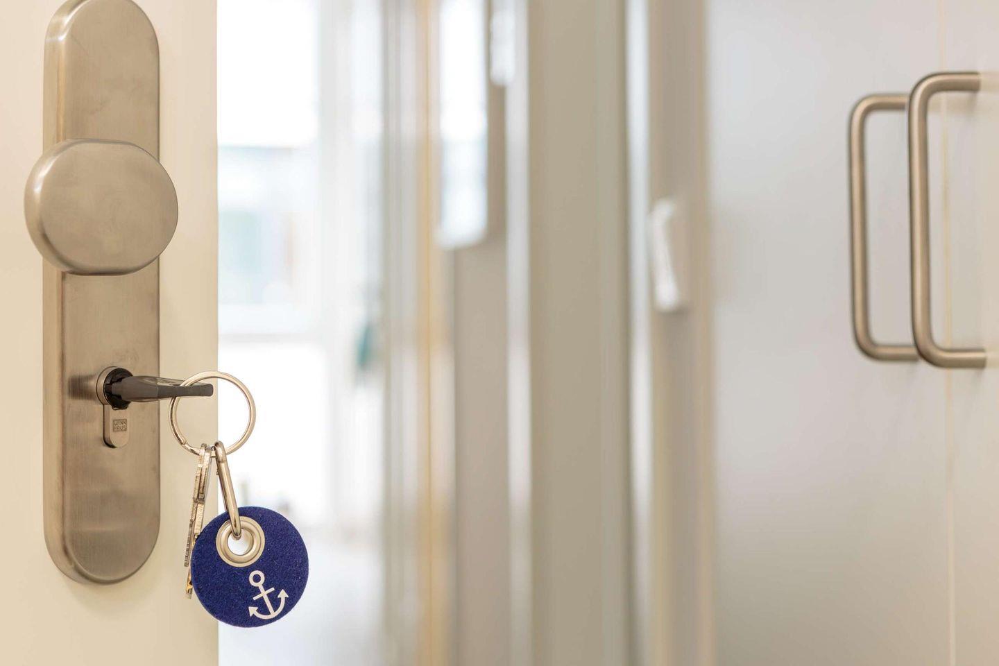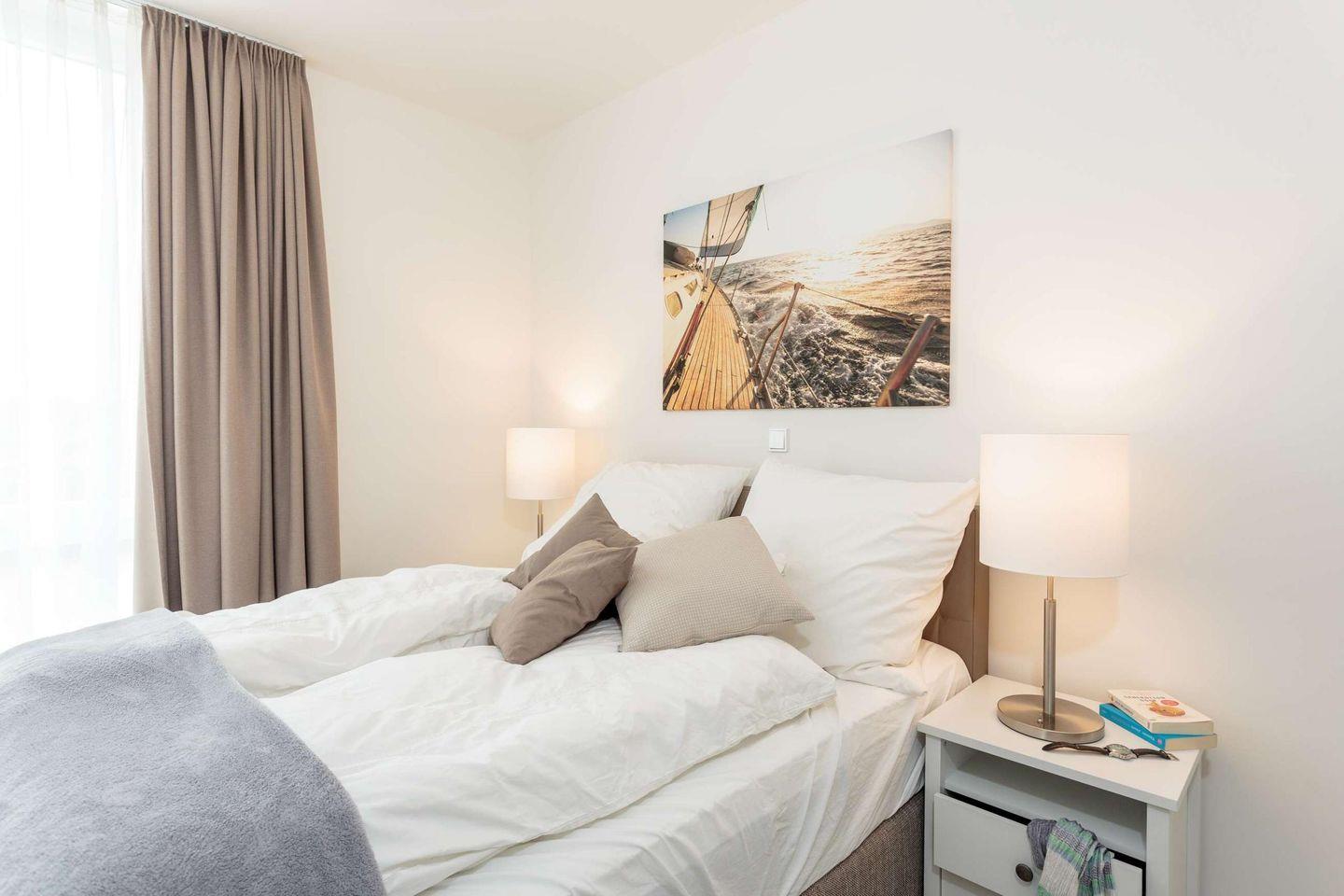 Das 3-Zimmer-Apartment befindet sich im 1. Obergeschoss des Hauses D und bietet Platz für bis zu 4 Personen. Ihr Auto können Sie bequem auf dem zur Wohnung gehörenden Tiefgaragenstellplatz parken. Sie erreichen das Apartment entweder mit dem Aufzug oder über die Treppe.