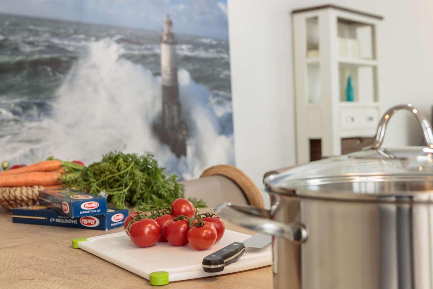 Aufgrund der Hanglage verfügen Sie dennoch über eine ebenerdige Terrasse mit teilweisem Meerblick, wo Sie wundervolle Stunden verbringen können. Zwei Sonnenliegen, ein Strandkorb sowie ein Tisch mit 6 Stühlen warten auf Sie! Der Strand liegt nur wenige Schritte von Ihrer Ferienunterkunft entfernt.