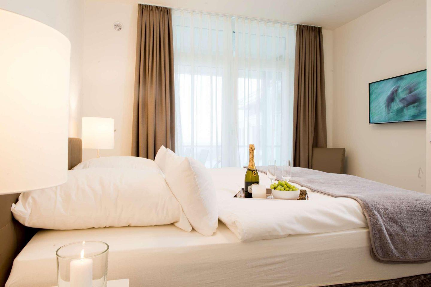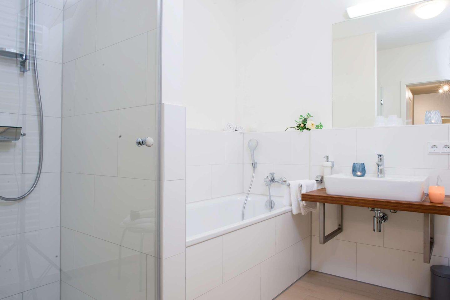 Der einladende Flur führt Sie linkerhand in das Badezimmer mit Dusche und Badewanne. Zurück auf dem Flur führt Sie Ihr Weg direkt in das Herzstück des Apartments - den Wohnbereich. Eine offene Einbauküche, ein Essbereich, eine Sofaecke sowie eine große Fensterfront mit Meerblick laden zum Verweilen ein. Das Sofa bietet eine Schlaffunktion für zwei Personen. Weiterhin gibt es ein Schlafzimmer mit Boxspring-Doppelbett.
