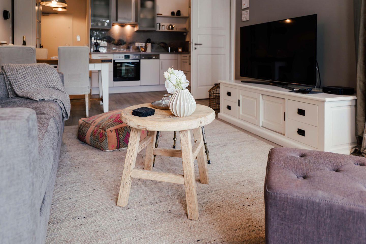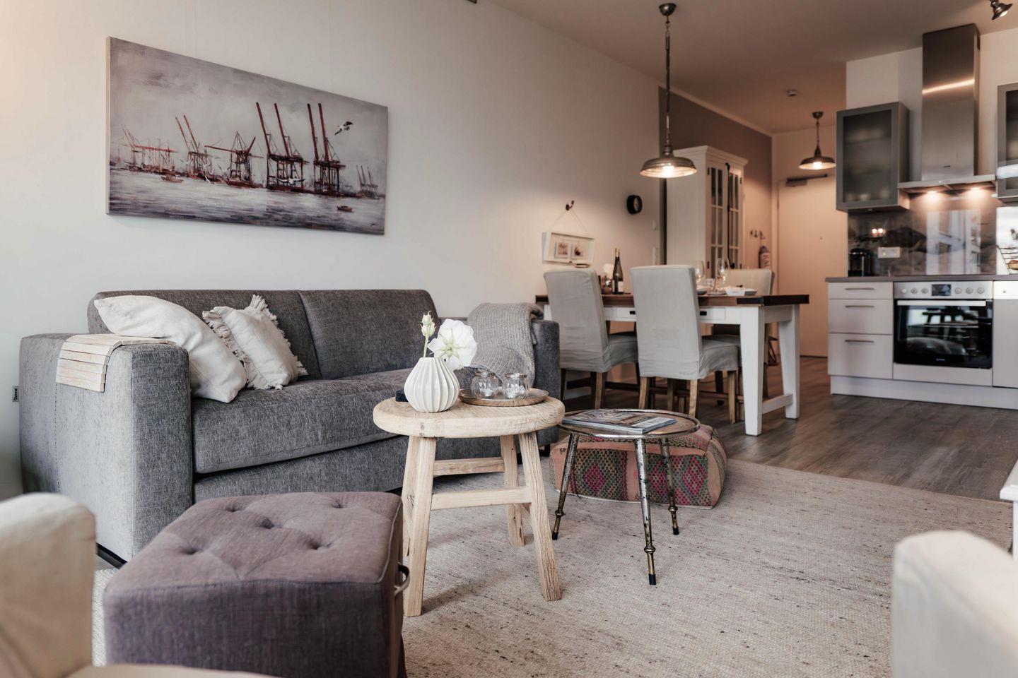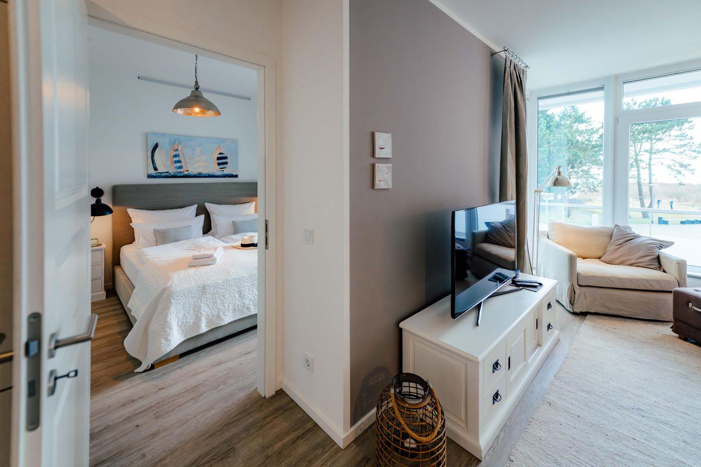 Verweilen Sie im lichtdurchfluteten Wohnzimmer auf dem Sofa oder genießen Sie den Meerblick aus der Fensterfront. Das Sofa bietet eine weitere Schlafmöglichkeiten für zwei Personen. Angrenzend an das Wohnzimmer finden Sie einen Essbereich sowie eine offene, gut ausgestattete Küchenzeile mit einer Nespresso-Maschine. Des Weiteren gibt es ein modernes Badezimmer mit Dusche und Badewanne sowie ein Schlafzimmer mit einem Boxspring-Doppelbett.