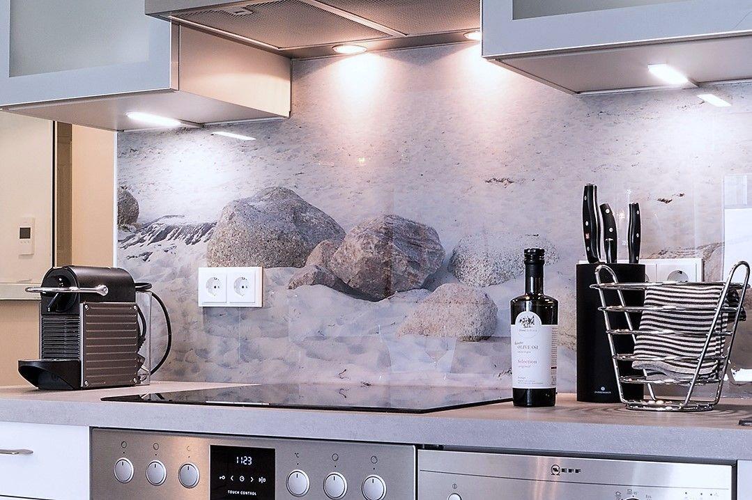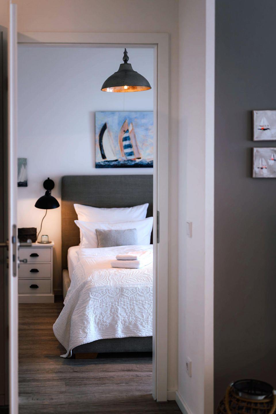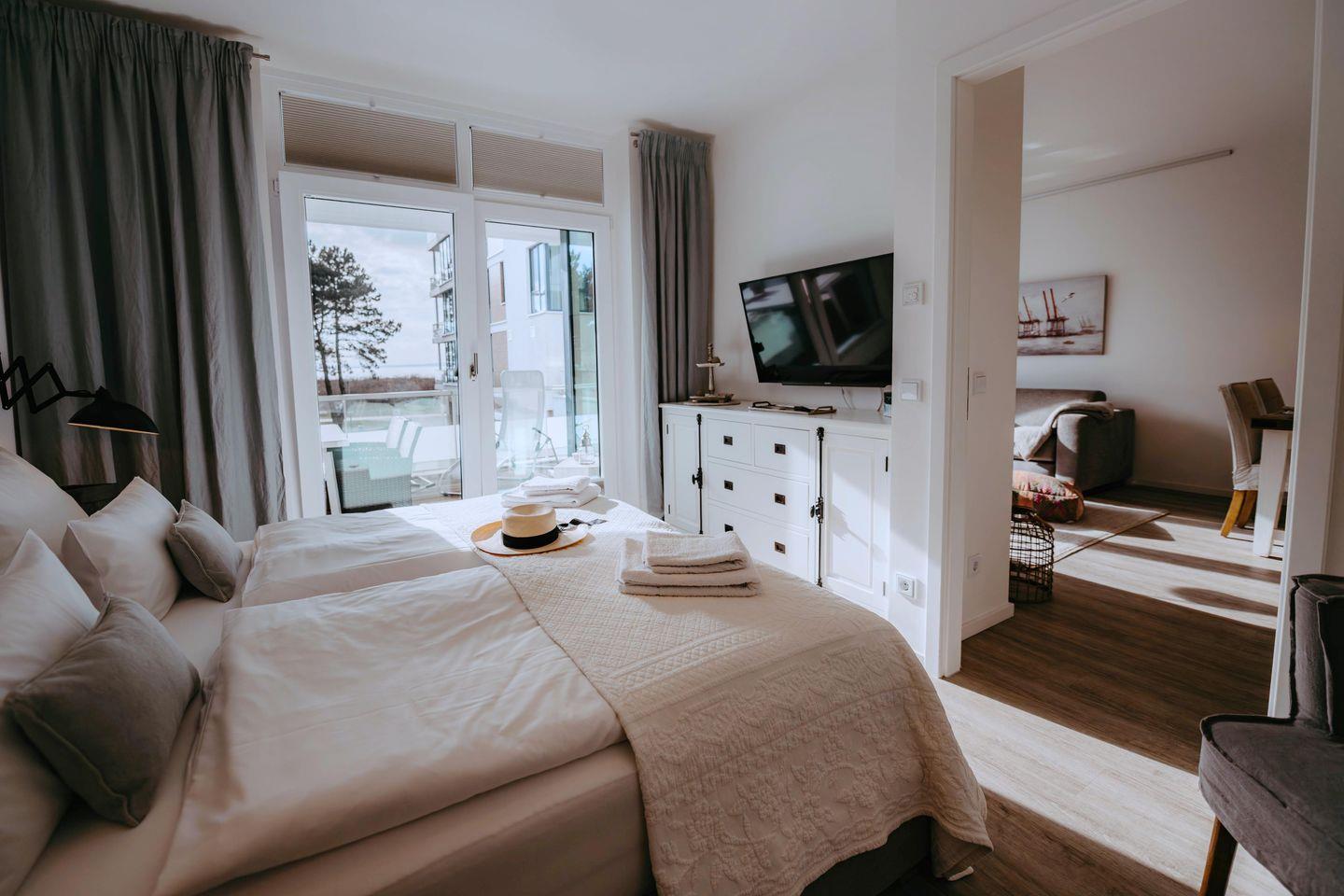 Verweilen Sie im lichtdurchfluteten Wohnzimmer auf dem Sofa oder genießen Sie den Meerblick aus der Fensterfront. Das Sofa bietet eine weitere Schlafmöglichkeiten für zwei Personen. Angrenzend an das Wohnzimmer finden Sie einen Essbereich sowie eine offene, gut ausgestattete Küchenzeile mit einer Nespresso-Maschine. Des Weiteren gibt es ein modernes Badezimmer mit Dusche und Badewanne sowie ein Schlafzimmer mit einem Boxspring-Doppelbett.