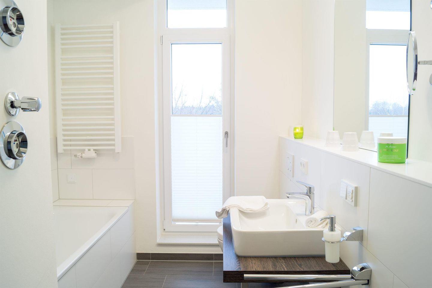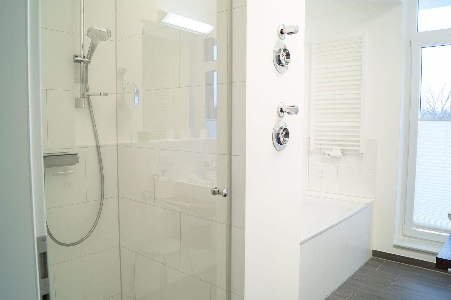 Der einladende Flur führt Sie rechterhand in das Badezimmer mit Dusche und Badewanne. Zurück auf dem Flur führt Sie Ihr Weg direkt in das Herzstück des Apartments - den Wohnbereich. Eine offene Einbauküche, ein Essbereich, eine Sofaecke sowie eine große Fensterfront mit Meerblick laden zum Verweilen ein. Das Sofa bietet eine Schlaffunktion für zwei Personen. Weiterhin gibt es ein Schlafzimmer mit Boxspring-Doppelbett.