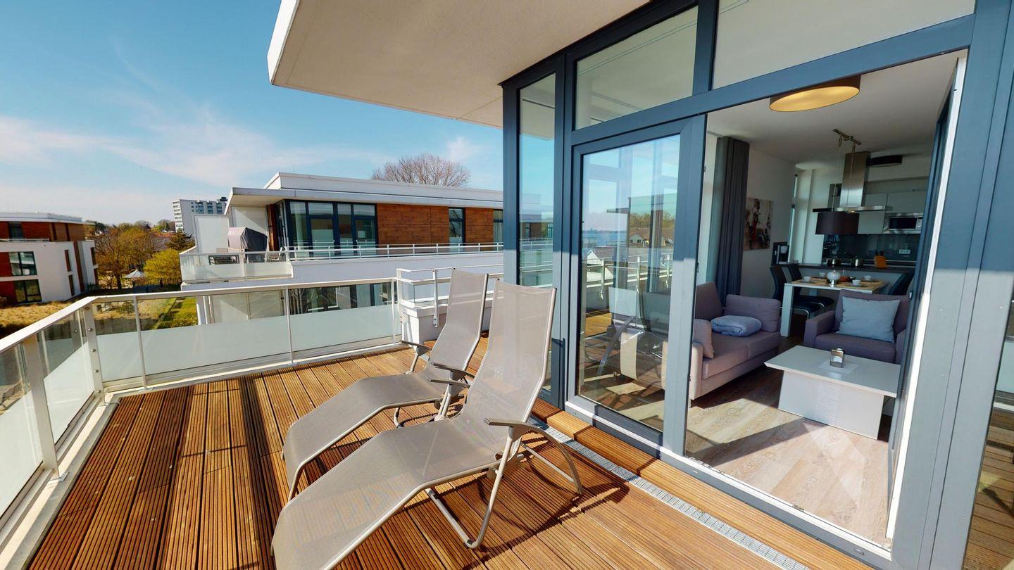 Luxuriöses Penthouse in Pelzerhaken mit Balkon und eingeschränktem Meerblick, nur wenige Schritte vom Strand entfernt.