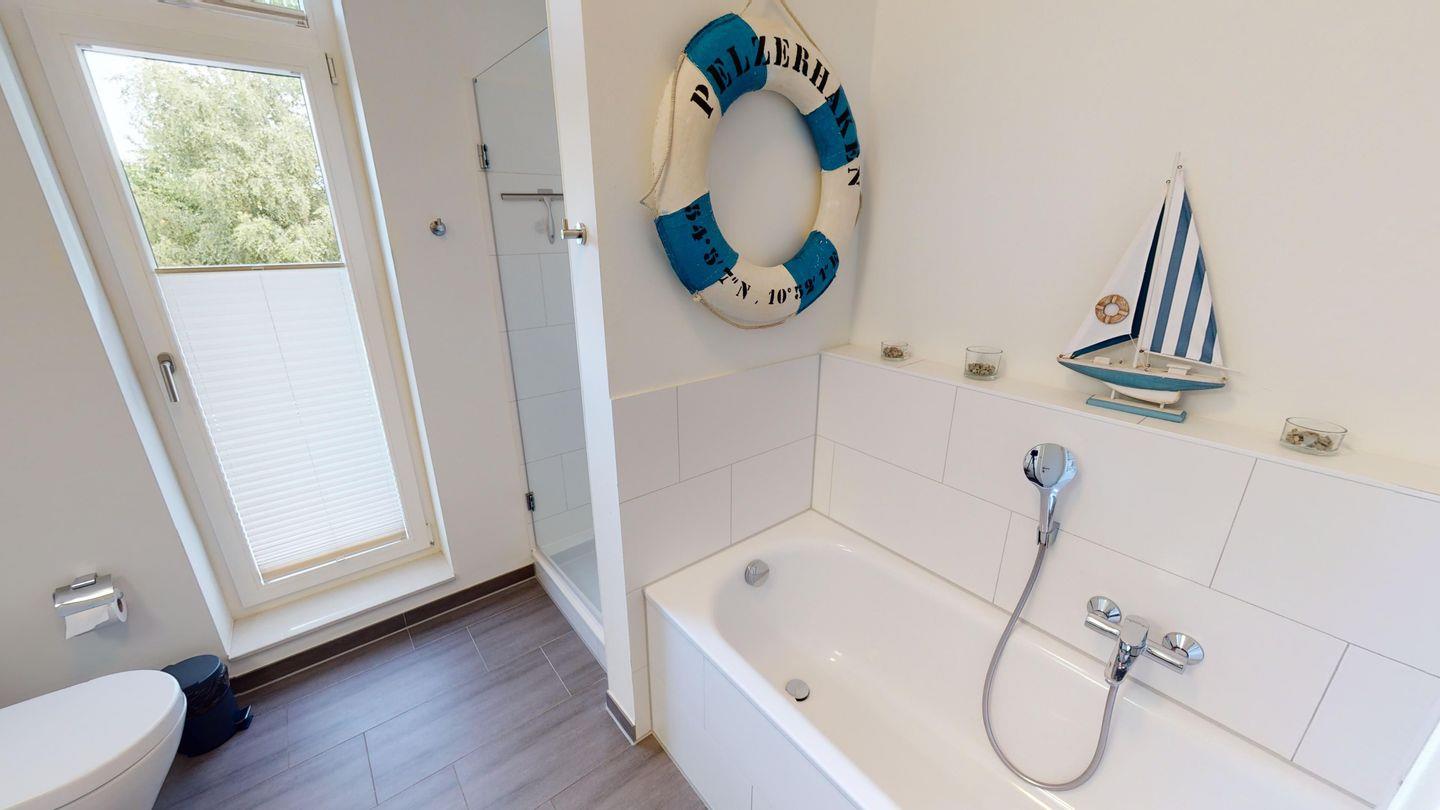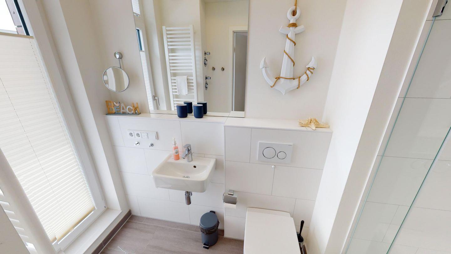 Das Badezimmer bietet großzügige Ablageflächen, eine Dusche und eine zusätzliche Badewanne. Beide Badezimmer sind exklusiv ausgestattet und haben Tageslicht. Das kleine Badezimmer bietet sogar einen kleinen Meerblick. Das zweite Schlafzimmer der Ferienwohnung ist mit zwei hochwertigen Boxpring-Einzelbetten, einem Kleiderschrank, einem Schminktisch und einem dritten wandhängenden SMART TV ausgestattet. Auch von diesem Zimmer aus kann man einen Ostseeblick auf die Lübecker Bucht genießen. In der Ferienwohnung befinden sich außerdem ein eingebauter Safe und diverse Haushaltsutensilien wie ein Dyson Akku-Staubsauger, Wischmop, Besen, Handfeger, Bügelbrett und Bügeleisen. Ein Föhn ist natürlich ebenfalls vorhanden.