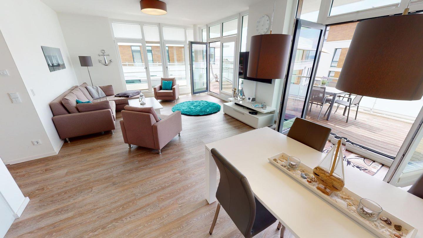 Im lichtdurchfluteten Wohnzimmer, das wie der Rest der Ferienwohnung mit viel Liebe zum Detail modern maritim eingerichtet wurde, befindet sich eine hochwertige Wohnlandschaft mit zwei Sesseln und einem großen, bequemen Ecksofa.