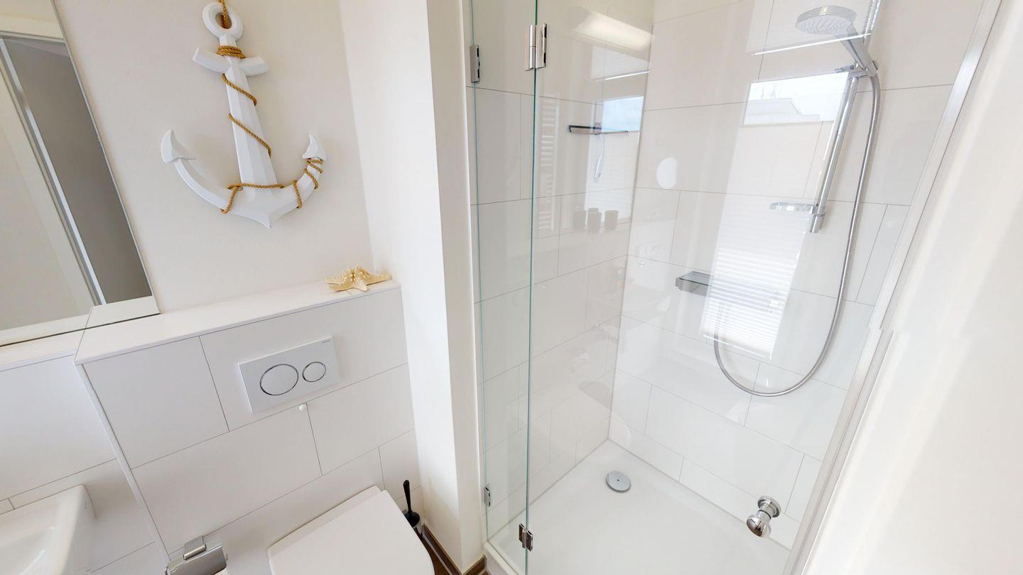 Feriengäste finden außerdem eine umfangreiche Ausstattung an hochwertigem Geschirr, Besteck und Kochzubehör. Auch von der offenen Küche der Ferienwohnung Himmel und Meer hat man einen schönen Blick auf die Ostsee. Im großen Schlafzimmer mit Meerblick befindet sich ein 1,80 m breites Boxspring Doppelbett mit durchgehender Matratze und Schlaraffia Geltex Topper, ein großer Kleiderschrank und ein weiterer wandhängender SMART TV. Vom Schlafzimmer aus gibt es einen direkten Zugang zum kleinen Badezimmer mit Duschbad.