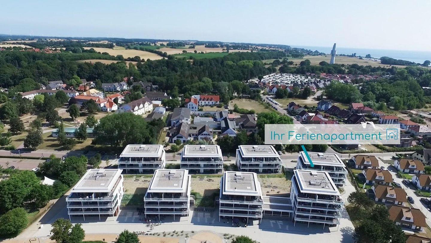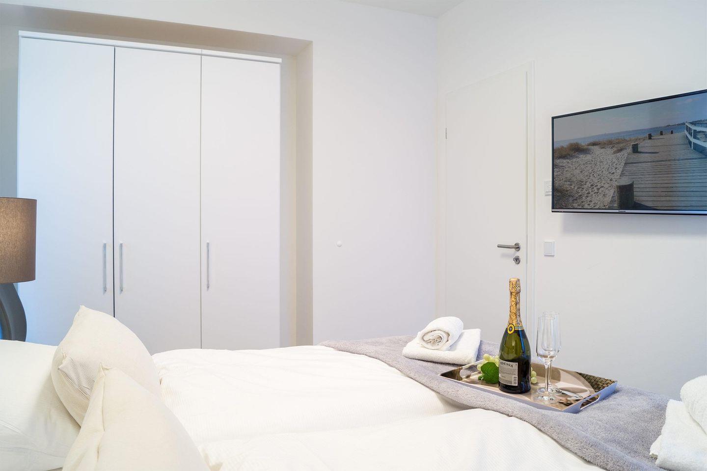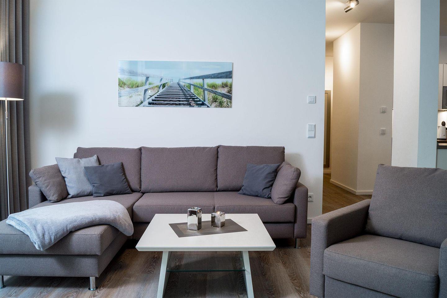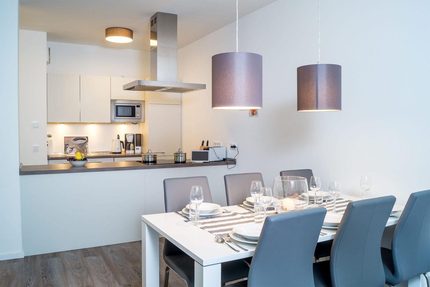 Das moderne 3-Zimmer-Apartment befindet sich im 3. OG des Hauses D. Es ist für eine Belegung mit 4 Personen ausgelegt, und auch ein Hund ist willkommen! Parken Sie auf dem wohnungseigenen PKW-Tiefgaragenstellplatz. Mit dem Aufzug oder über die Treppe gelangen Sie zum Apartment.