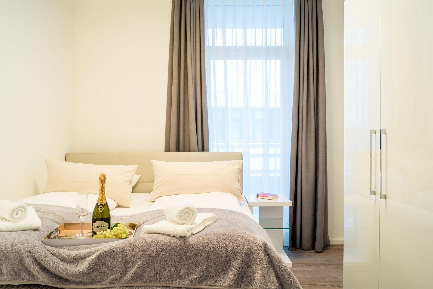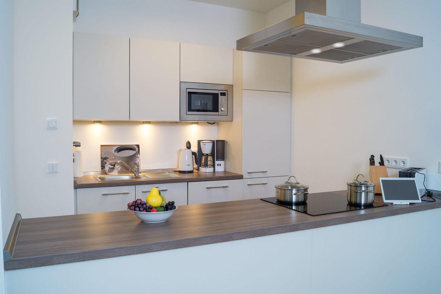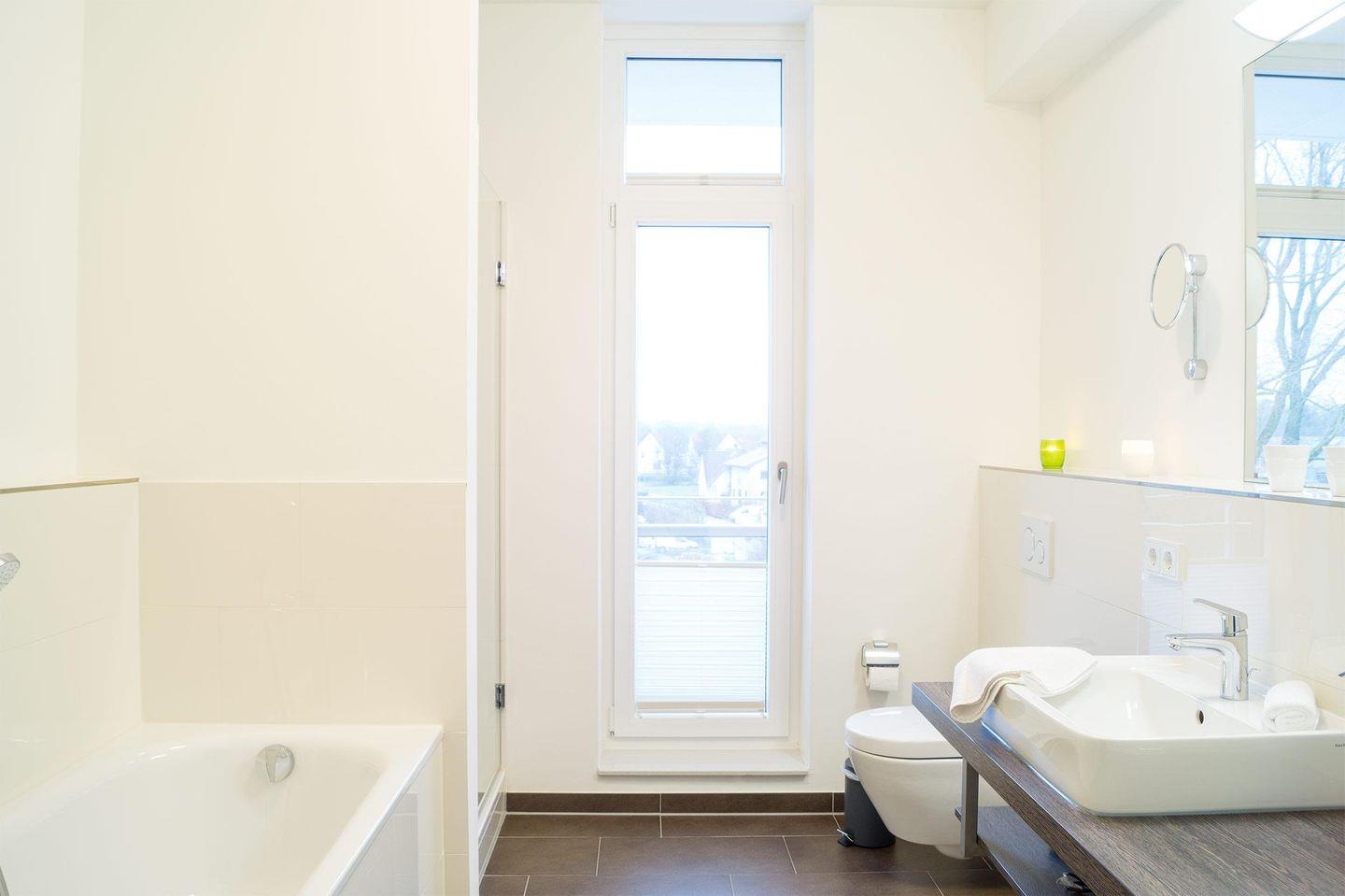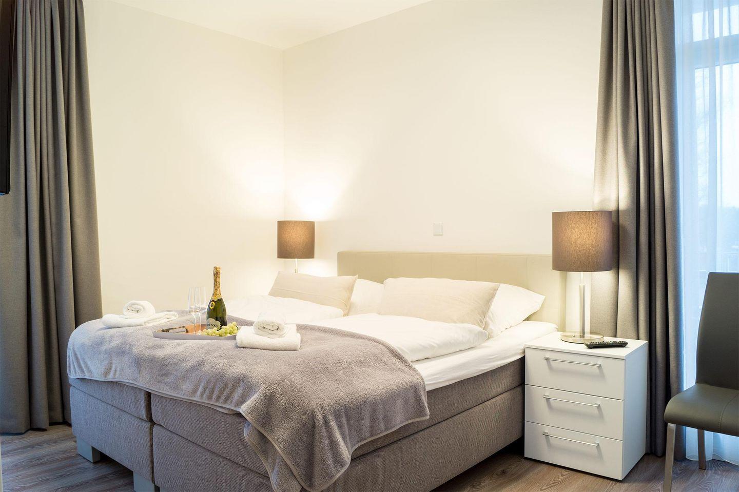 Das moderne 3-Zimmer-Apartment befindet sich im 3. OG des Hauses D. Es ist für eine Belegung mit 4 Personen ausgelegt, und auch ein Hund ist willkommen! Parken Sie auf dem wohnungseigenen PKW-Tiefgaragenstellplatz. Mit dem Aufzug oder über die Treppe gelangen Sie zum Apartment.