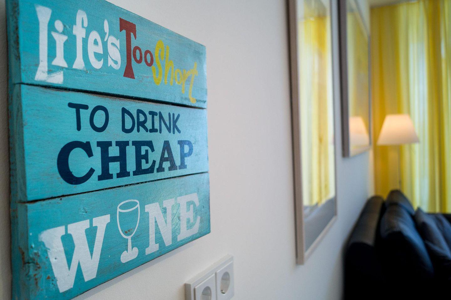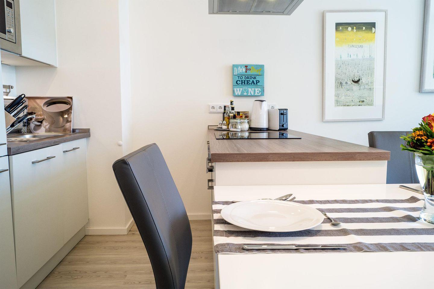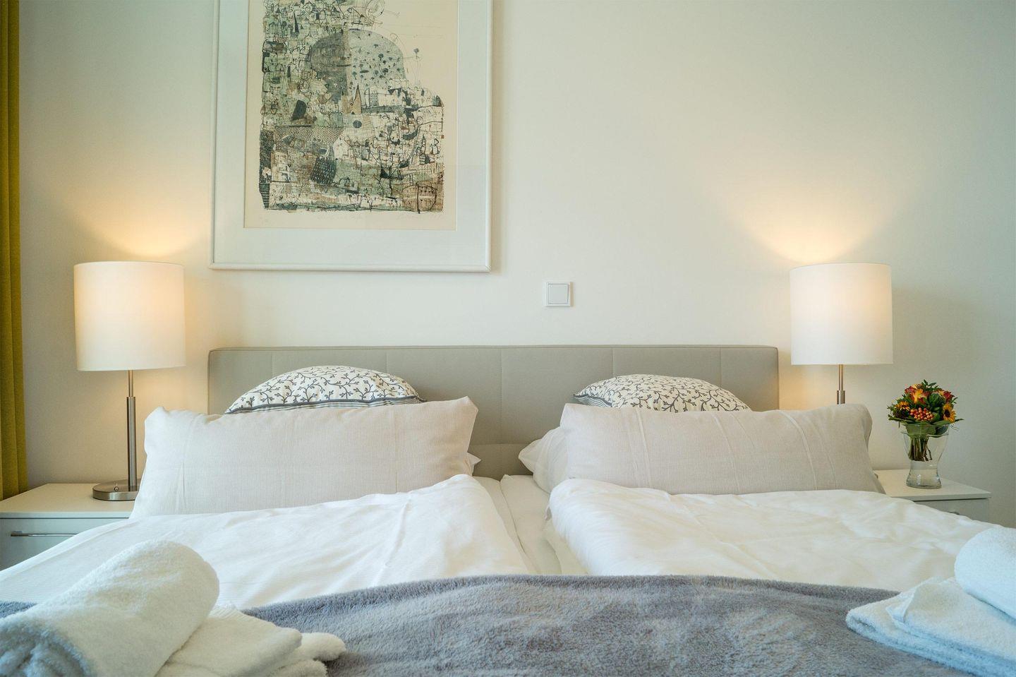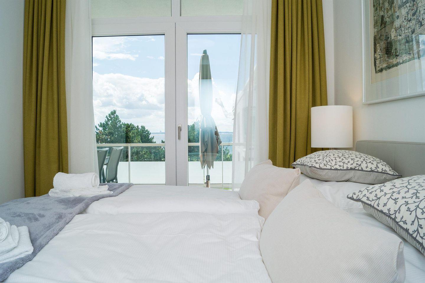 Im Schlafzimmer steht ein komfortables Boxspring-Doppelbett, ein geräumiger Kleiderschrank und ein Flachbildfernseher für Sie bereit. Auf den schönen Balkon gelangen Sie sowohl über das Wohnzimmer, als auch über das Schlafzimmer. Zur Ausstattung gehört eine Sonnenliege sowie ein Balkontisch mit vier Stühlen.