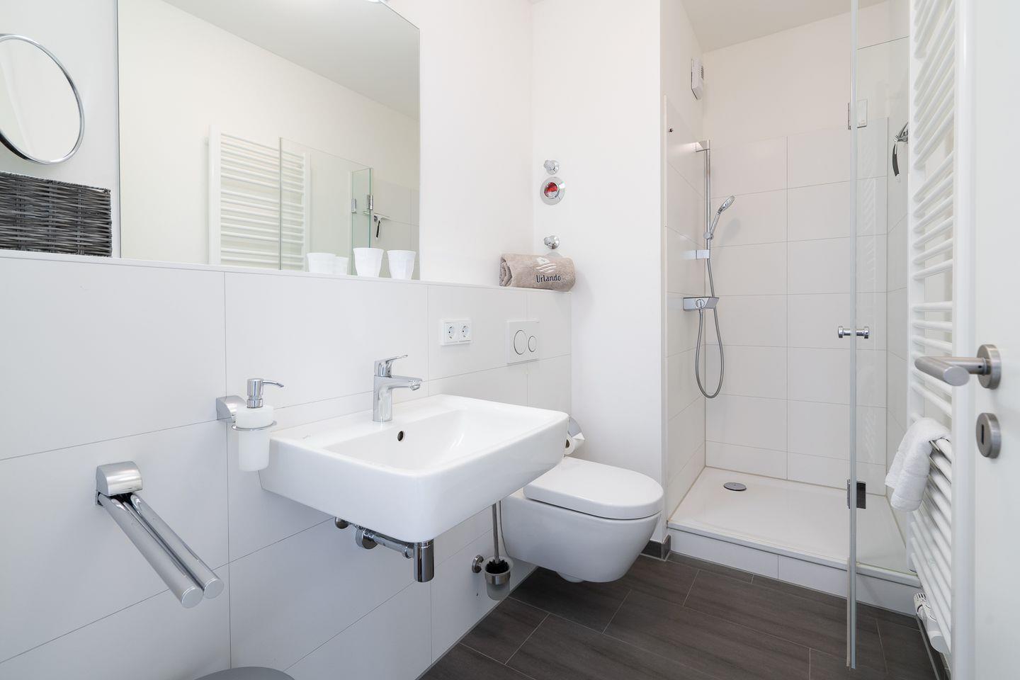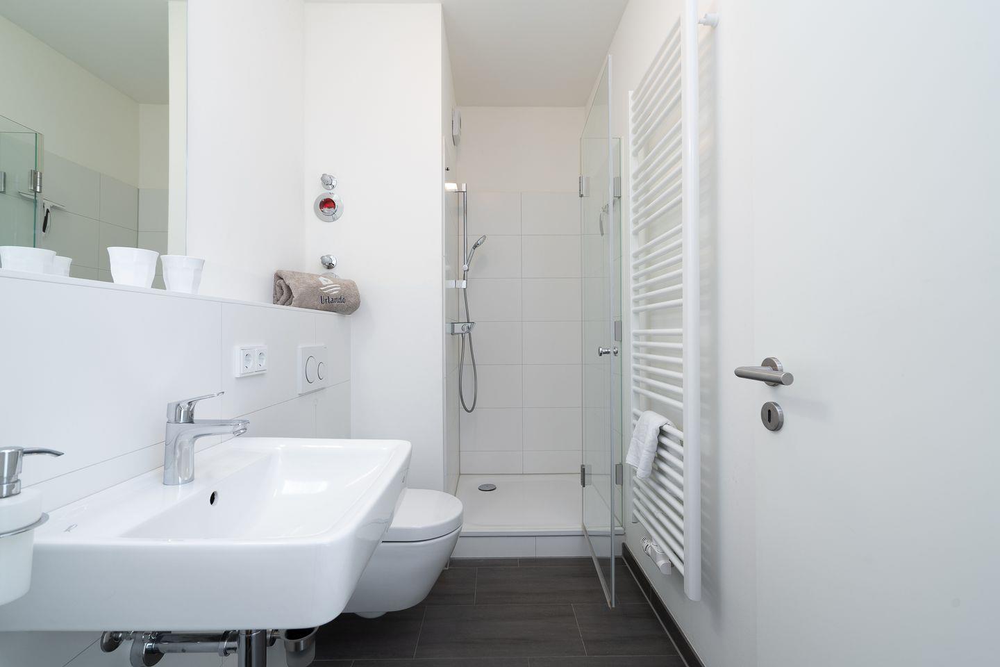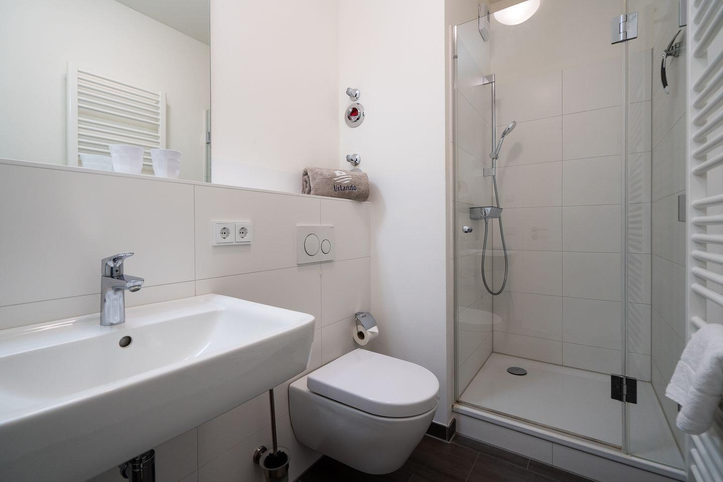 Weiter über den Flur gelangen Sie wiederum linkerhand in das zweite, etwas kleinere Schlafzimmer mit einem Einzelbett, das über eine Ausziehfunktion verfügt und sich somit einen vierten Schlafplatz eröffnet. Direkt gegenüber befindet sich das Duschbad des Apartments.