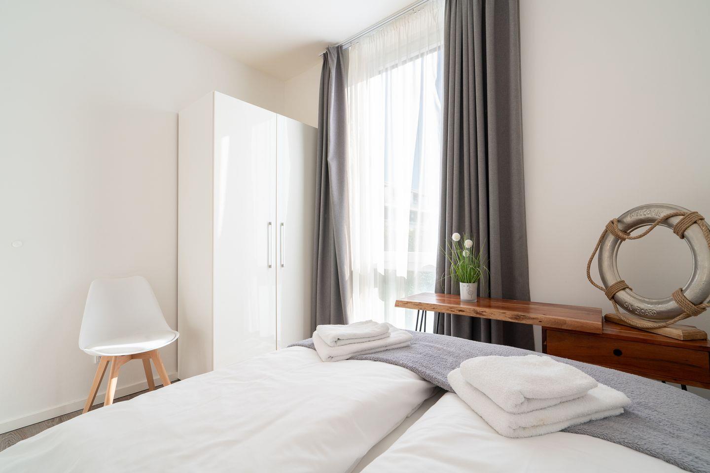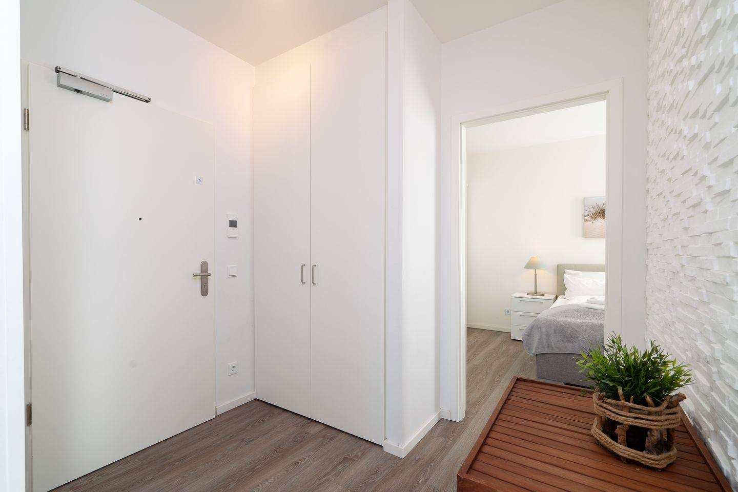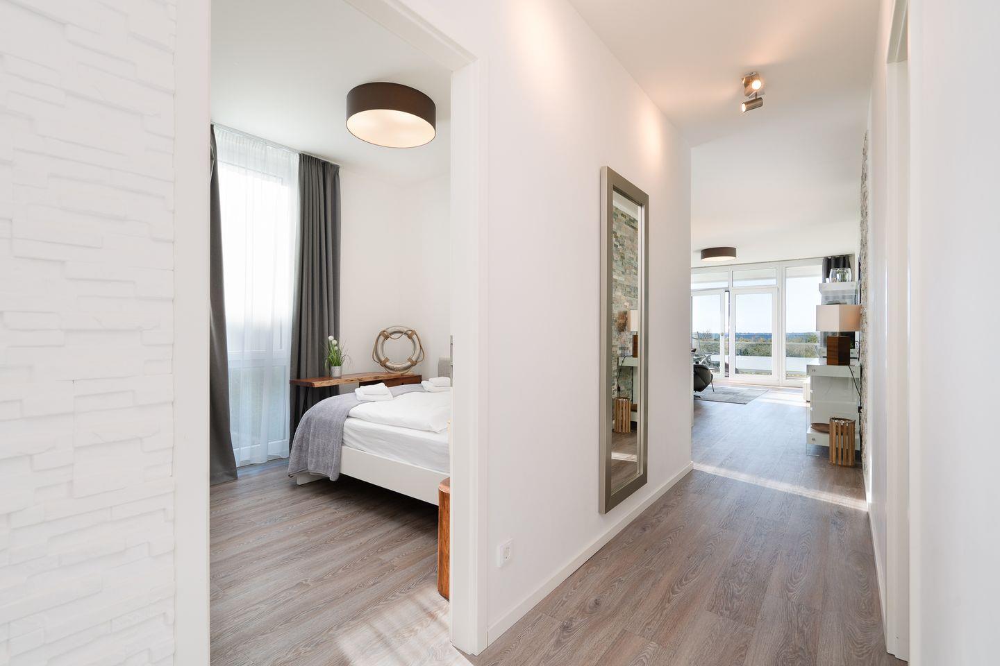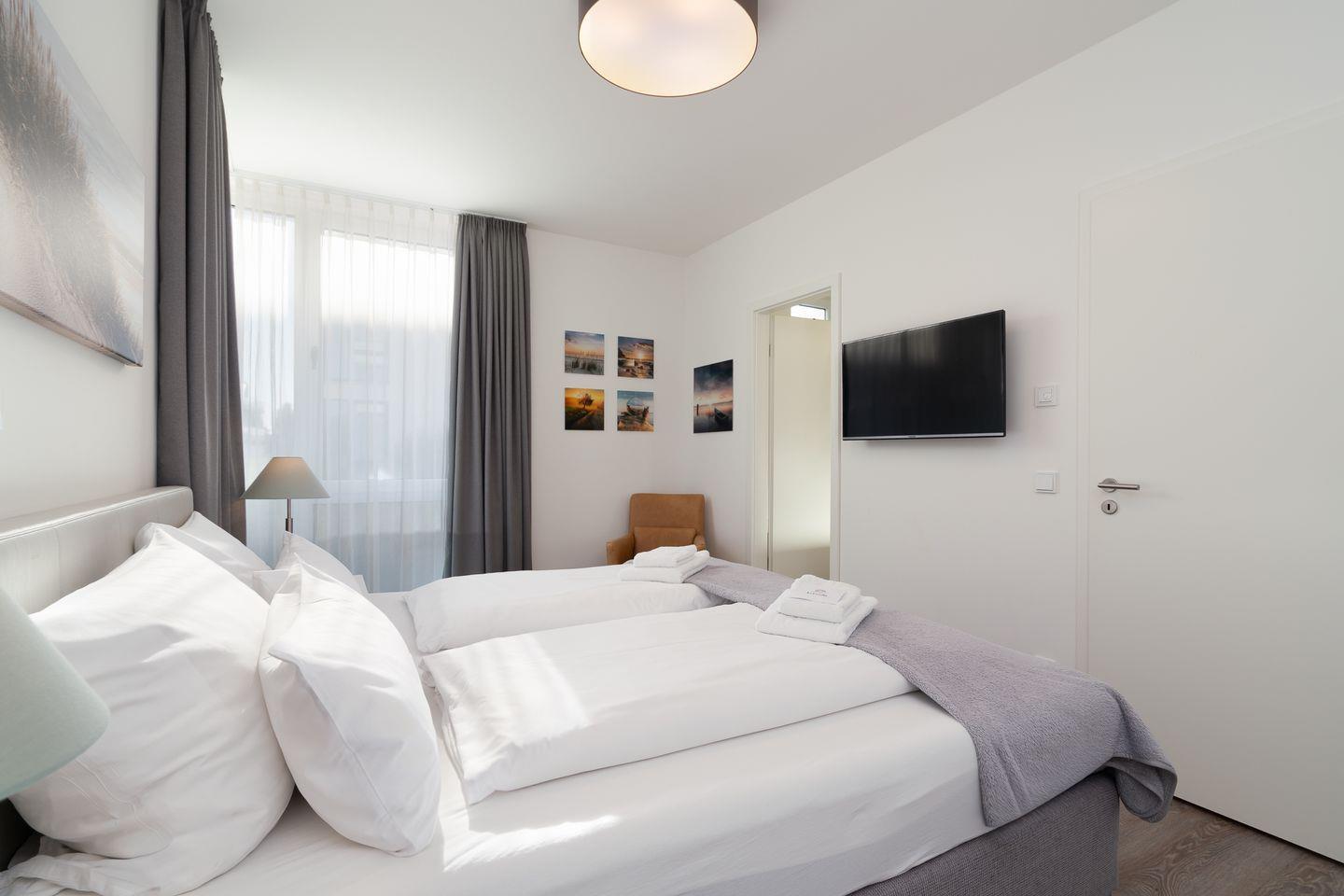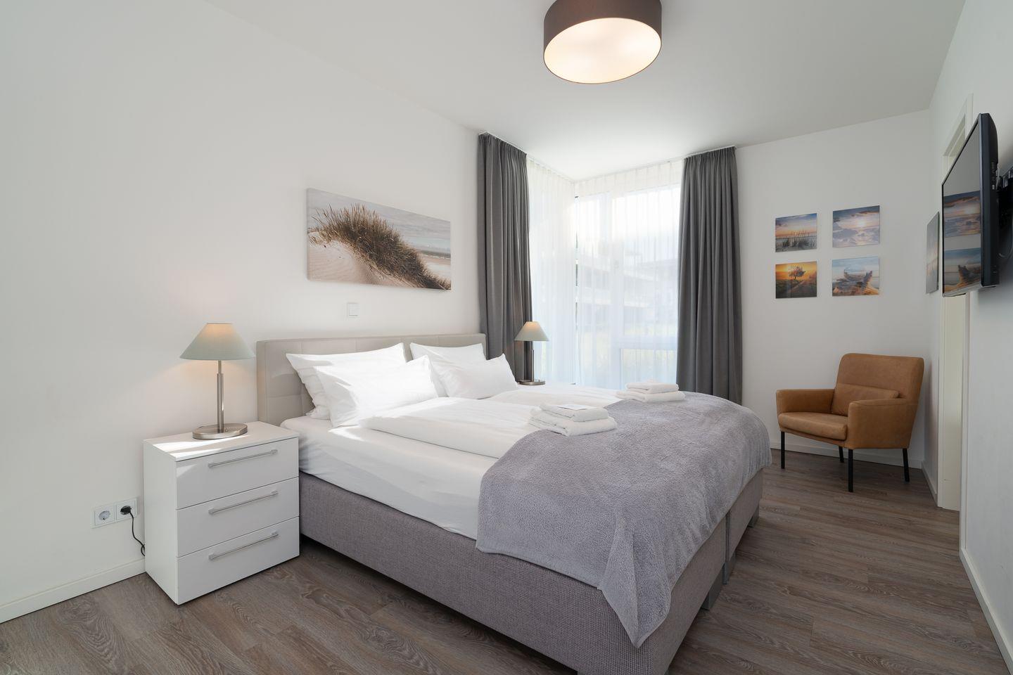 Der einladende Flur mit Garderobe und großem Spiegel führt Sie linkerhand direkt in das erste der beiden hellen und freundlichen Schlafzimmer. Die Ausstattung besteht aus einem Boxspring-Doppelbett, einem Kleiderschrank und einem Flachbildfernseher. Von hier aus gelangen Sie außerdem in das Vollbad mit Wellnessfaktor.
