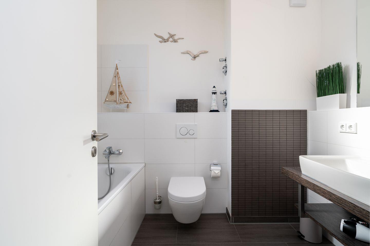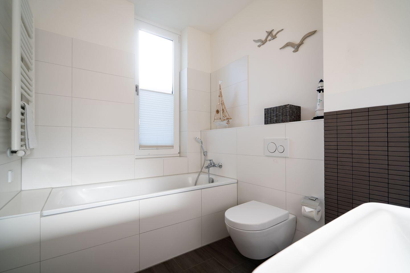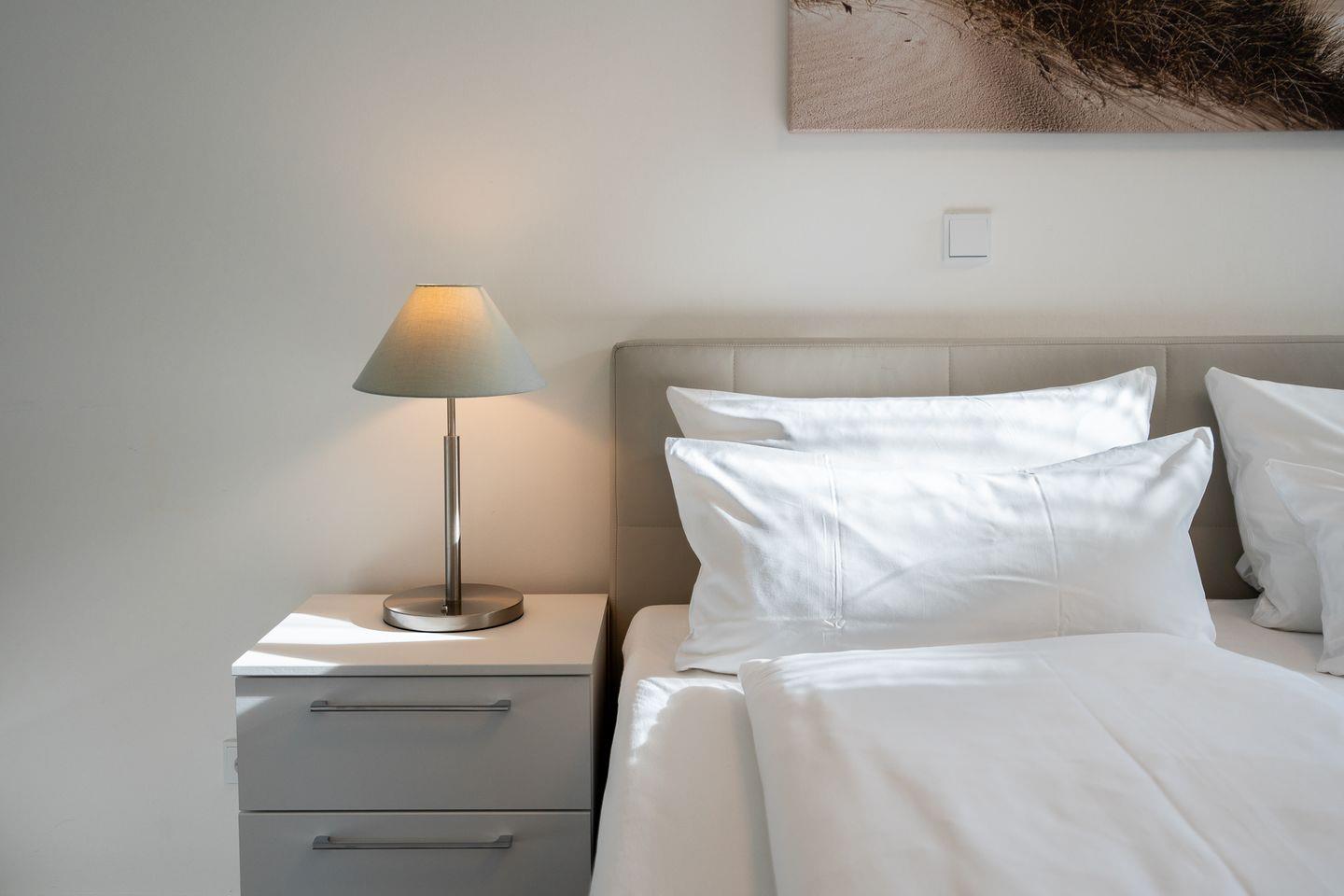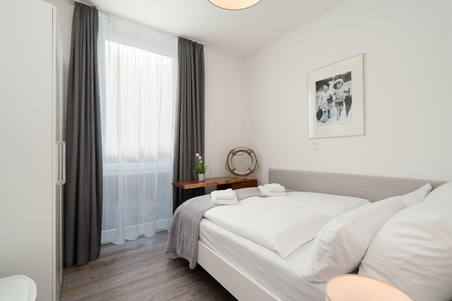 Der einladende Flur mit Garderobe und großem Spiegel führt Sie linkerhand direkt in das erste der beiden hellen und freundlichen Schlafzimmer. Die Ausstattung besteht aus einem Boxspring-Doppelbett, einem Kleiderschrank und einem Flachbildfernseher. Von hier aus gelangen Sie außerdem in das Vollbad mit Wellnessfaktor.
