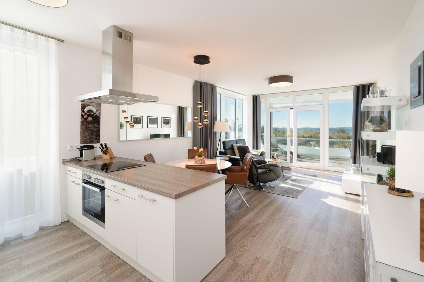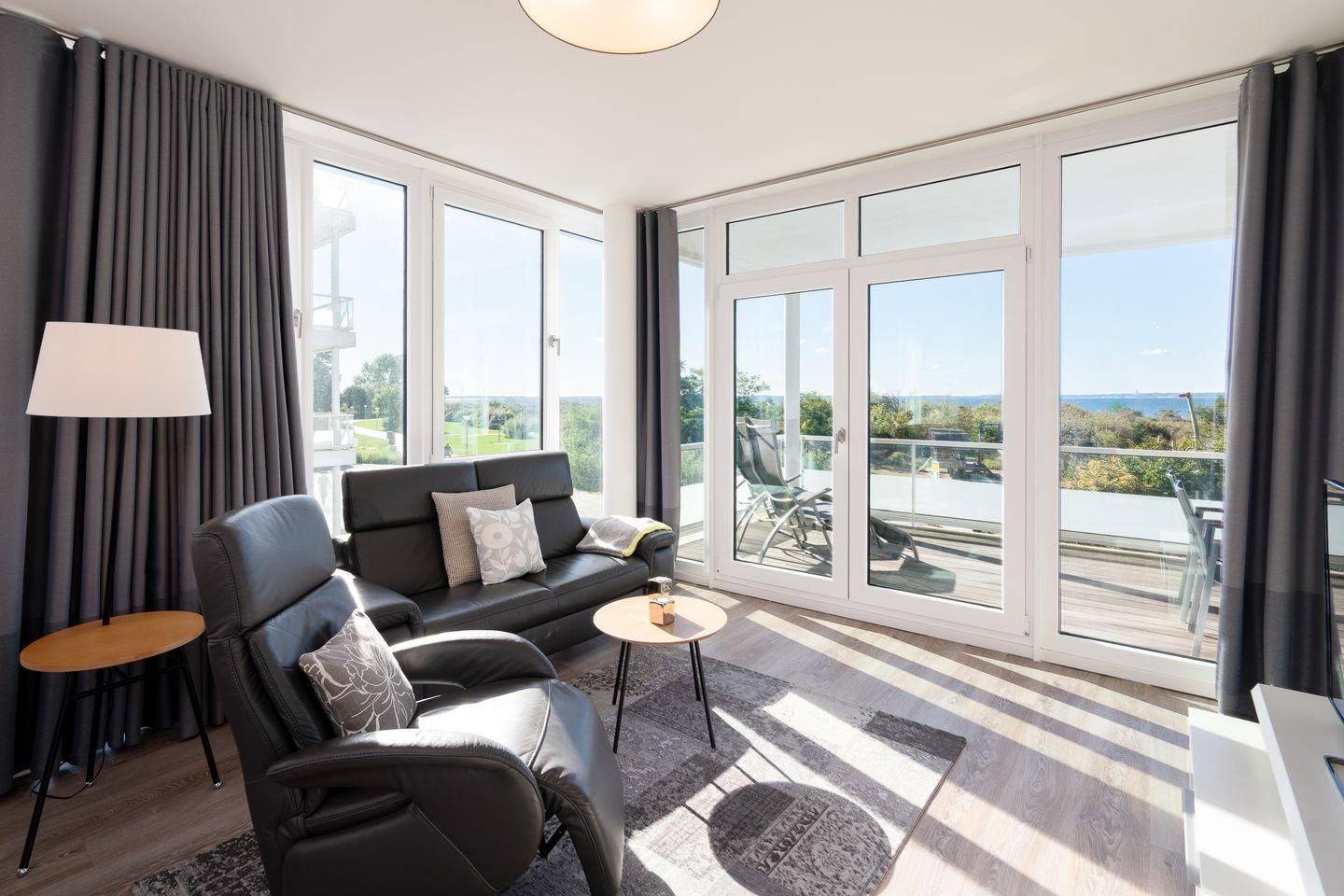 Doch das Herzstück wartet noch auf Sie - der Wohnbereich! Dieser verfügt über eine offene, moderne Einbauküche, einen schönen Essplatz mit vier Stühlen und eine gemütliche Sofaecke. Aus dem Wohnzimmer genießen Sie einen tollen Meerblick aus 1. Reihe. Sie haben somit die Möglichkeit den Blick aus der großen Fensterfront zu genießen oder den Tag mit einem spannenden Film, auf dem großen Flachbildfernseher ausklingen zu lassen! Den schönen Balkon erreichen Sie außerdem über den Wohnbereich. Zwei Sonnenliegen und ein Tisch mit vier Sitzplätzen warten auf Sie!