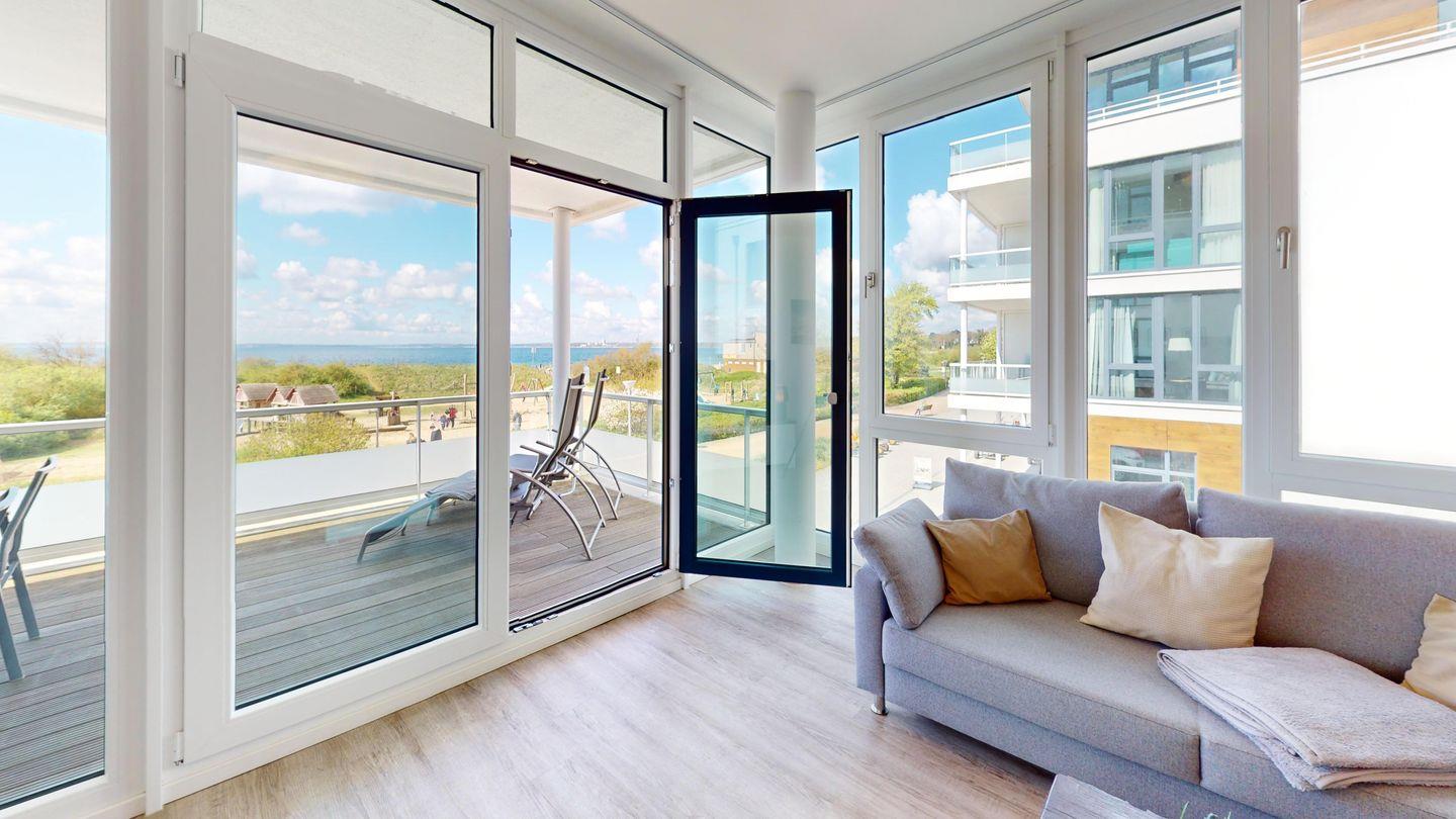 Sowohl aus der Wohnung als auch von Ihrem Balkon aus haben Sie durch die vielen Fensterflächen einen fantastischen Blick auf die Lübecker Bucht.