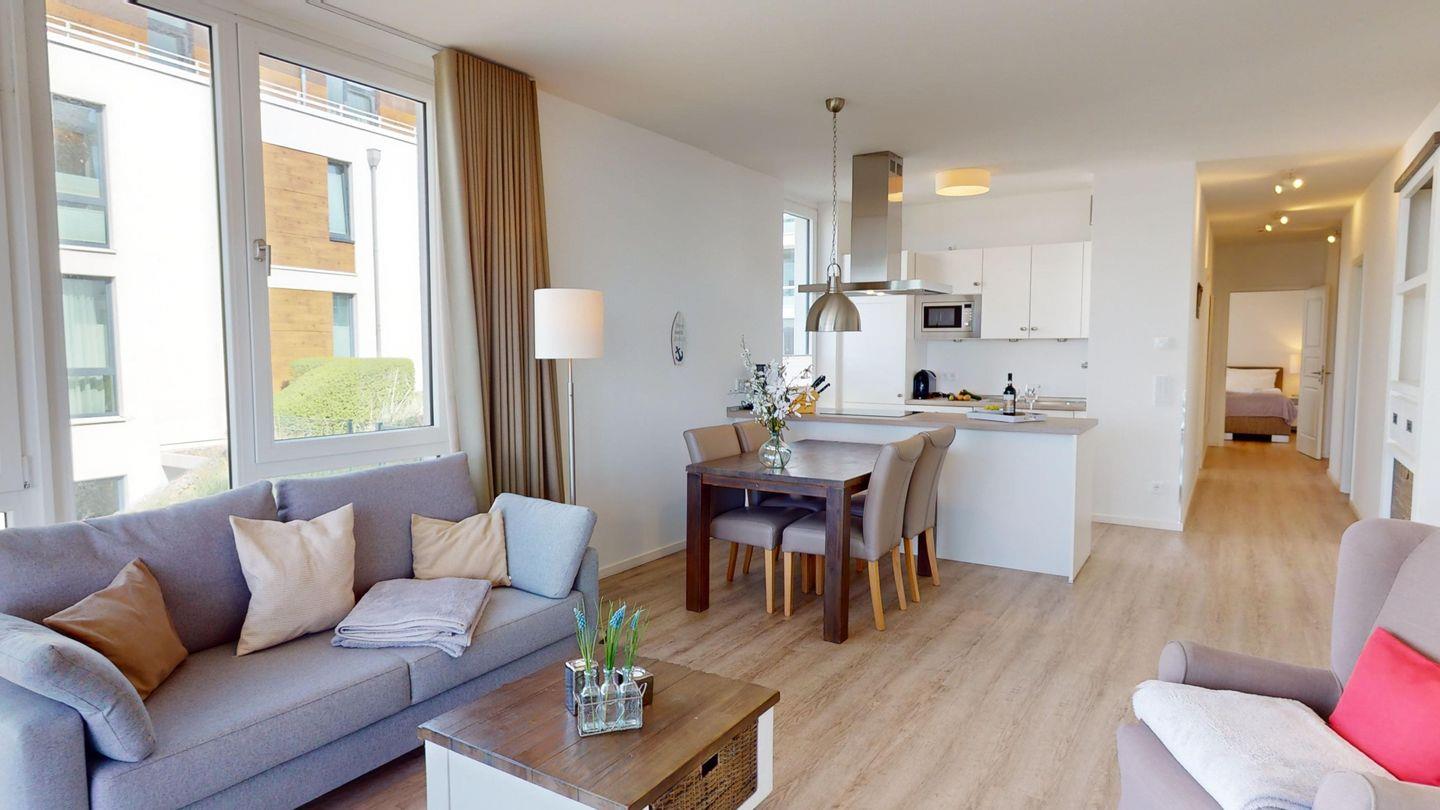 Der helle Wohn-/Essbereich hat eine voll ausgestattete, offene Küche sowie eine gemütliche und moderne Einrichtung.