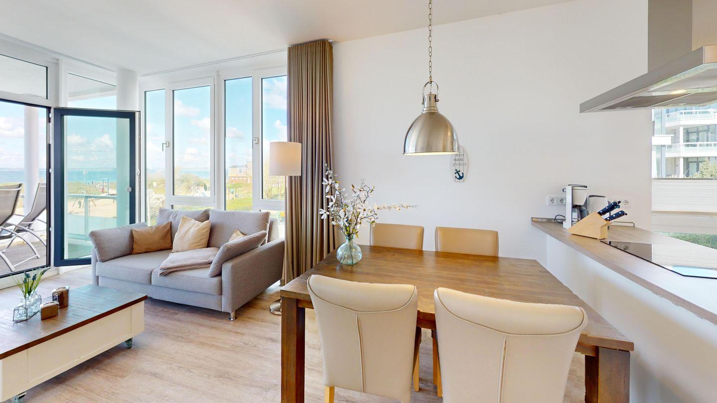 Diese moderne Ferienwohnung in erster Reihe am Strand liegt im ersten Obergeschoss der Ferienanlage Südkap Pelzerhaken.