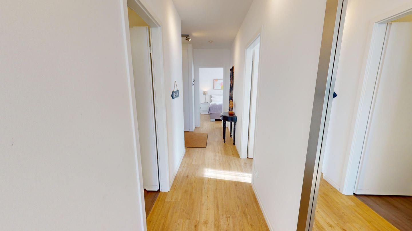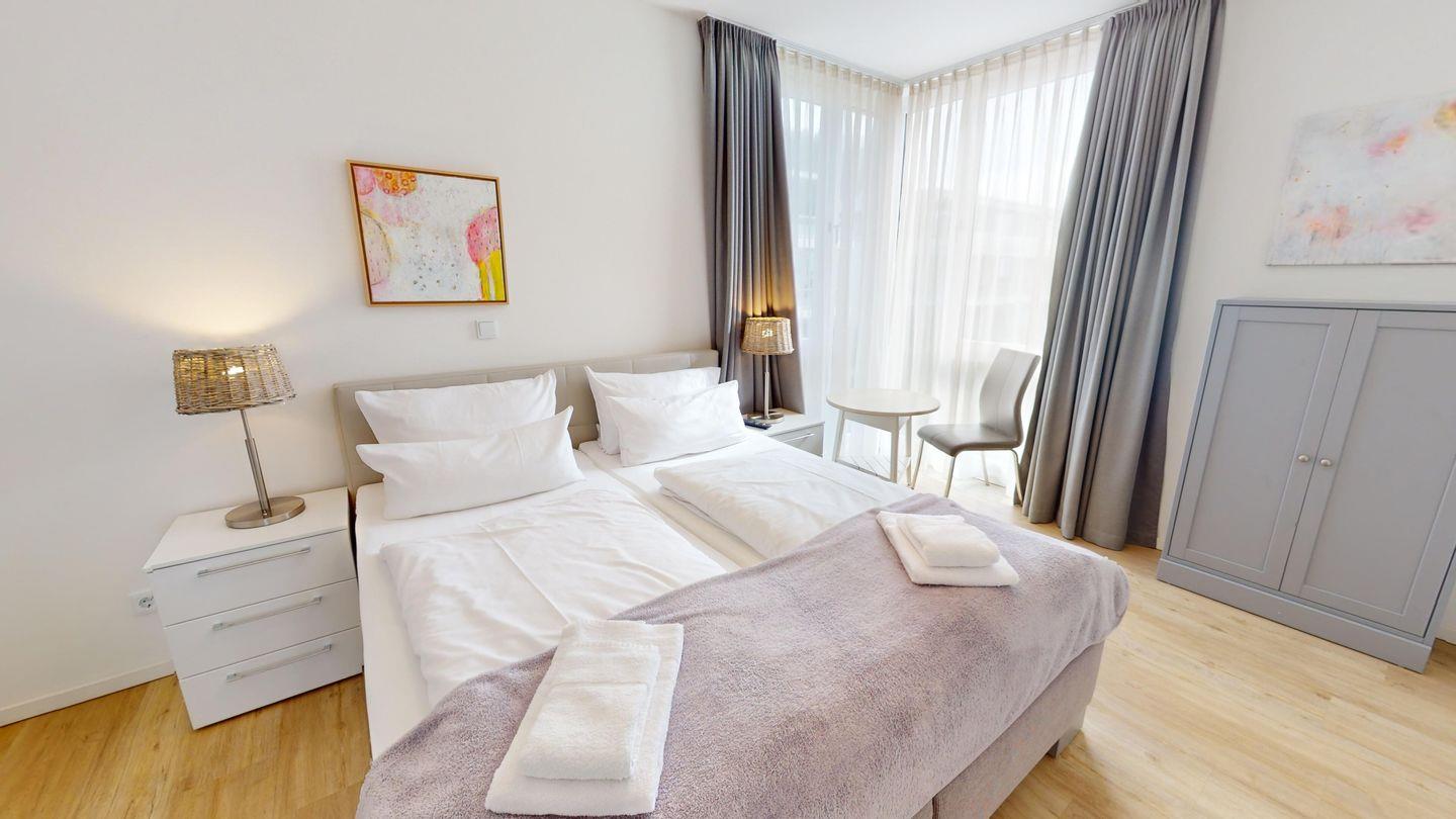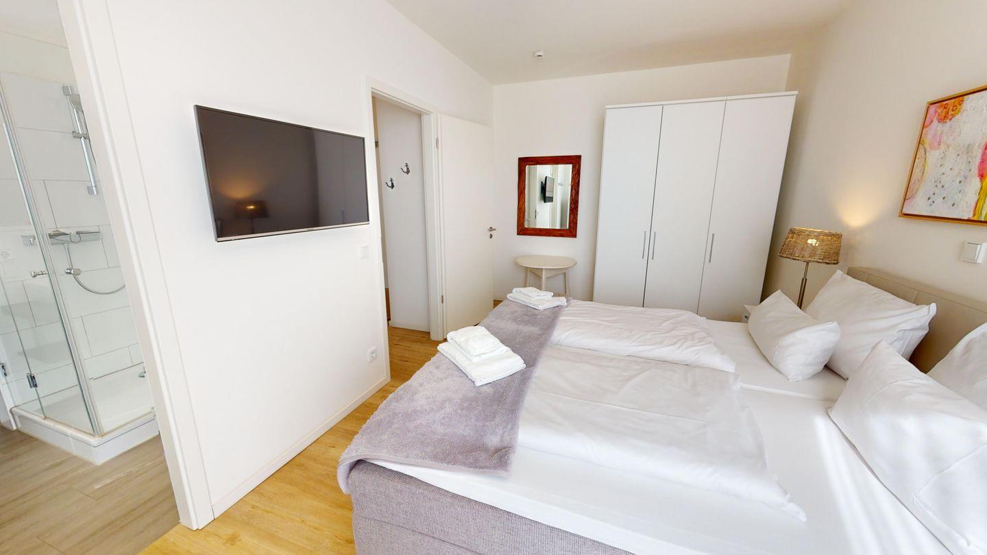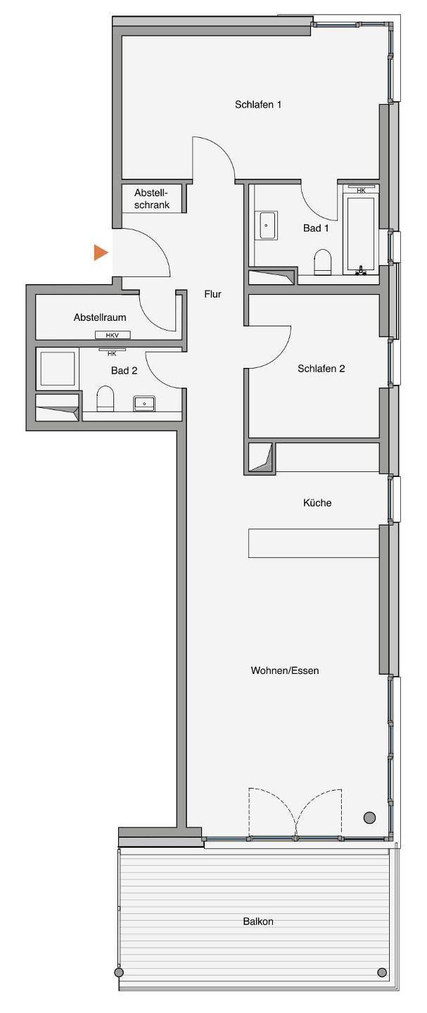 Die Wohnung hat zwei separate Schlafzimmer, eins davon ist verbunden mit einem eigenen Badezimmer mit Badewanne. Vom Flur aus haben Sie Zugang zu einem weiteren Bad mit Dusche.