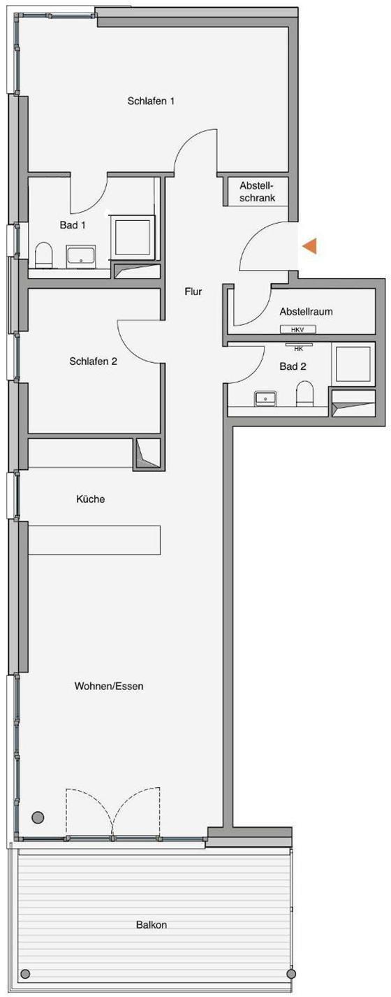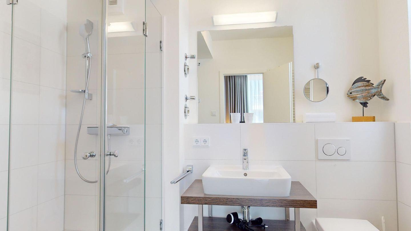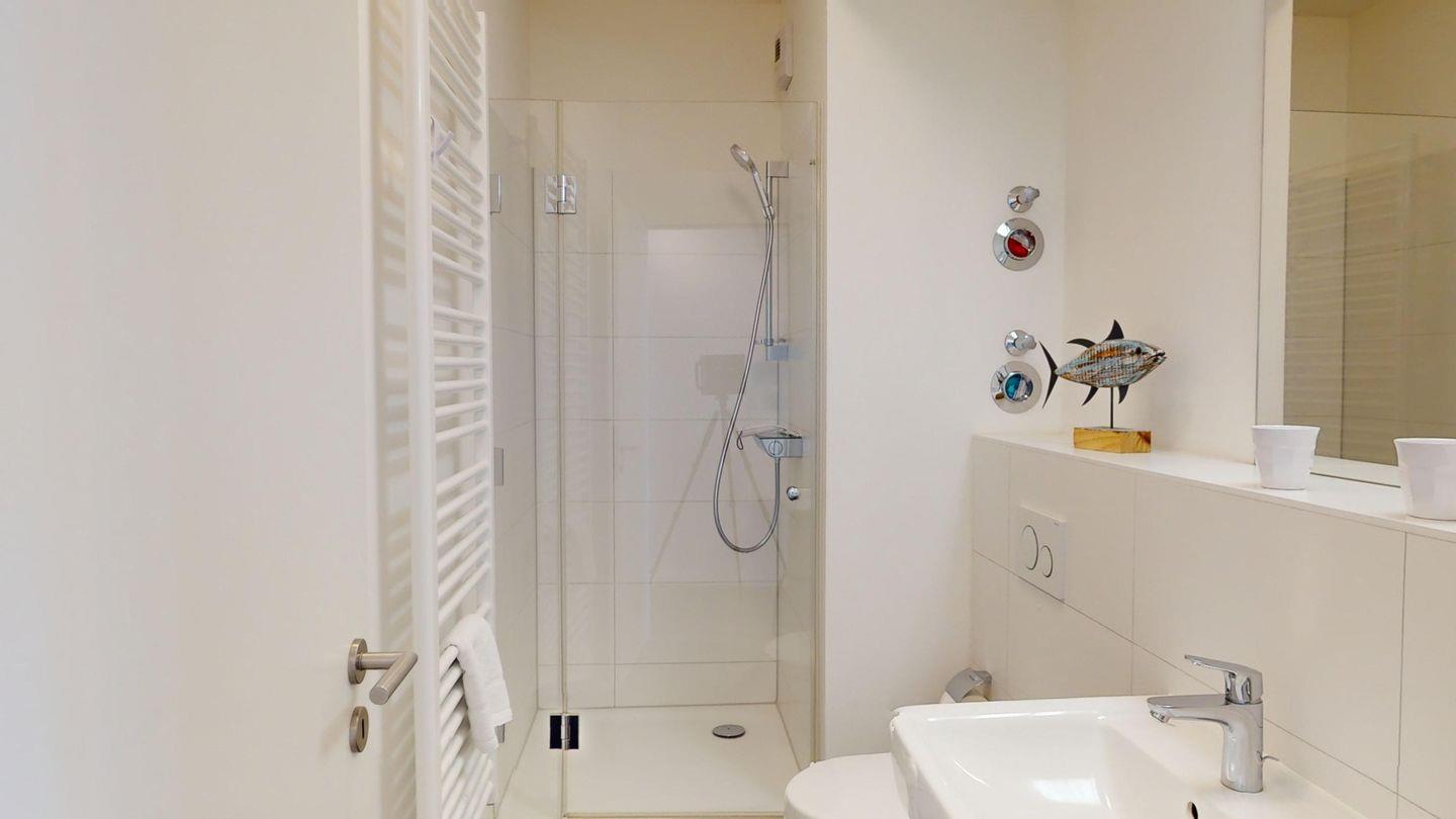 Die Ferienwohnung hat zwei getrennte Schlafzimmer, eins davon mit einem eigenen Badezimmer mit Dusche. In der Wohnung ist ein weiteres Bad mit Dusche vorhanden, was gerade bei Belegung mit bis zu vier Personen sehr komfortabel ist.