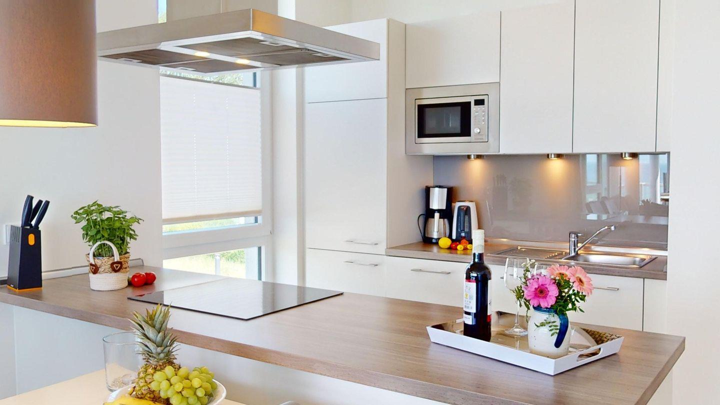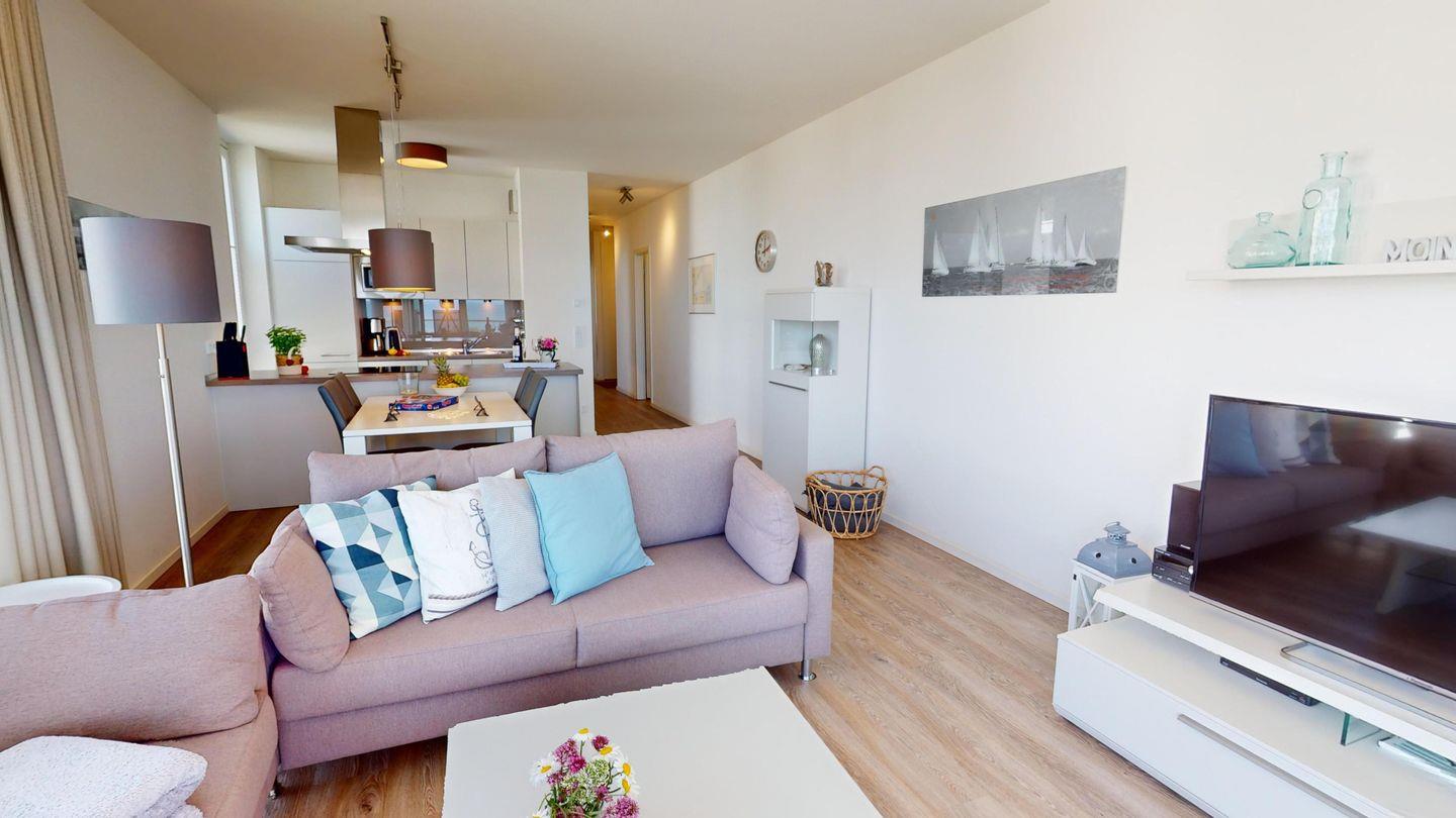 Das offene Wohn- und Esszimmer besticht durch seine Luftigkeit und hat eine voll ausgestattete, offene Küche sowie eine gemütliche und moderne Einrichtung.