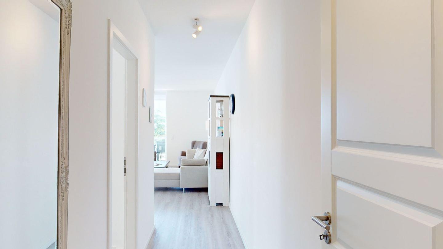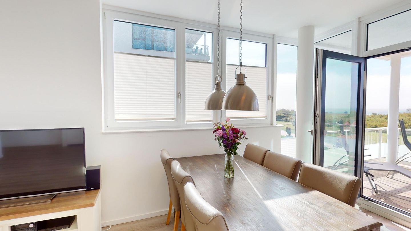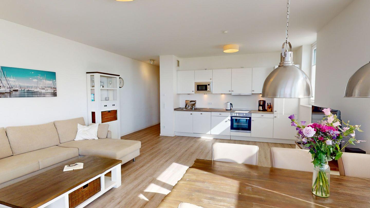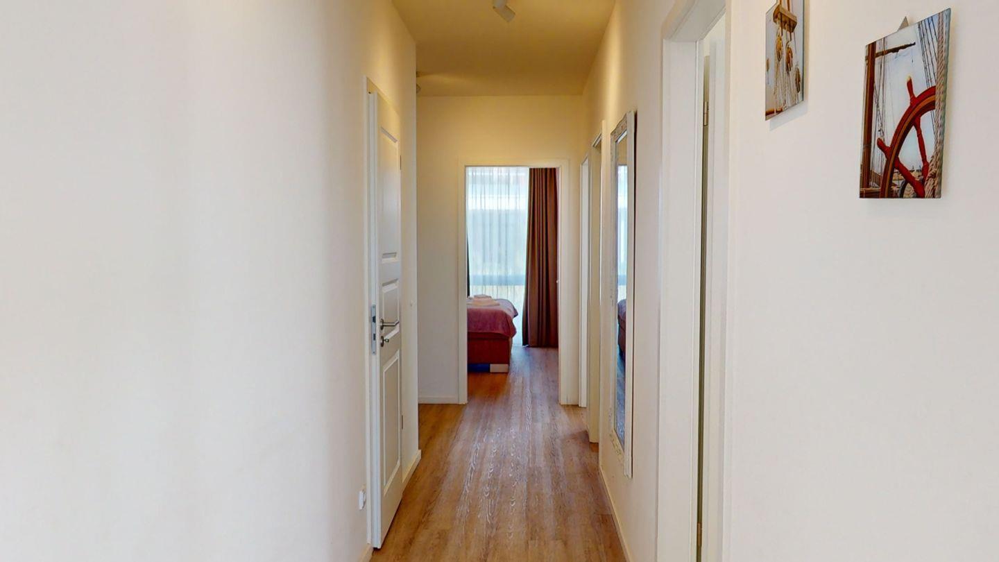 Die 4-Zimmer-Wohnung im ersten Obergeschoss ist mit 99 m² für sechs Personen ausgerichtet. Im großen Wohnzimmer mit Küchenzeile genießen Sie Ihre Mahlzeiten und können gesellschaftliche Abende verbringen. Drei Schlafzimmer für je zwei Personen, dazu zwei Bäder (je eines mit Dusche und eines mit Badewanne) bieten größtmöglichen Komfort. Zwei der Schlafzimmer sind mit einem komfortablen Boxspringbett ausgestattet, das zweite Schlafzimmer verfügt über ein Einzelbett und ein ausziehbares "Kojenbett". Vom Balkon haben Sie den perfekten Meerblick über die Lübecker Bucht.