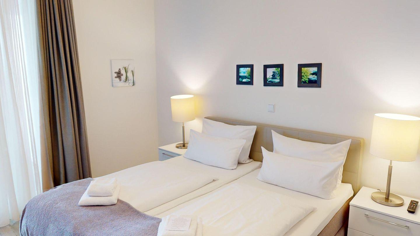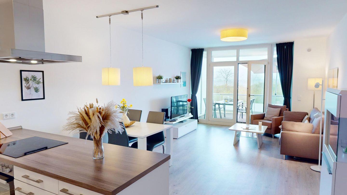Der Eingangsbereich empfängt Sie mit einem großen Ganzkörperspiegel sowie Garderobenschrank und führt Sie geradeaus in den modernen und lichtdurchfluteten Wohnbereich. Die offene, voll ausgestattete Einbauküche, ein einladender Essplatz und ein gemütlicher Sofabereich, mit großem Flachbildfernseher machen das Urlaubsgefühl perfekt! Genießen Sie vom Sofa aus, den einmaligen Blick auf die Ostsee! Das Sofa bietet eine bequeme Schlaffunktion für eine Person. Rechterhand vom Wohnbereich gelangen Sie einerseits in das Badezimmer, mit Badewanne und Dusche und durch eine weitere Tür in das komfortable Schlafzimmer. Ein tolles Boxspring-Doppelbett, ein weiterer Flachbildfernseher und ein geräumiger Kleiderschrank gehören zur Ausstattung. Sowohl über das Wohnzimmer, als auch über das Schlafzimmer können Sie den großzügigen Balkon betreten. Ein Tisch mit vier Stühlen sowie zwei Sonnenliegen laden Sie ein, den fantastischen Ostseeblick zu genießen!