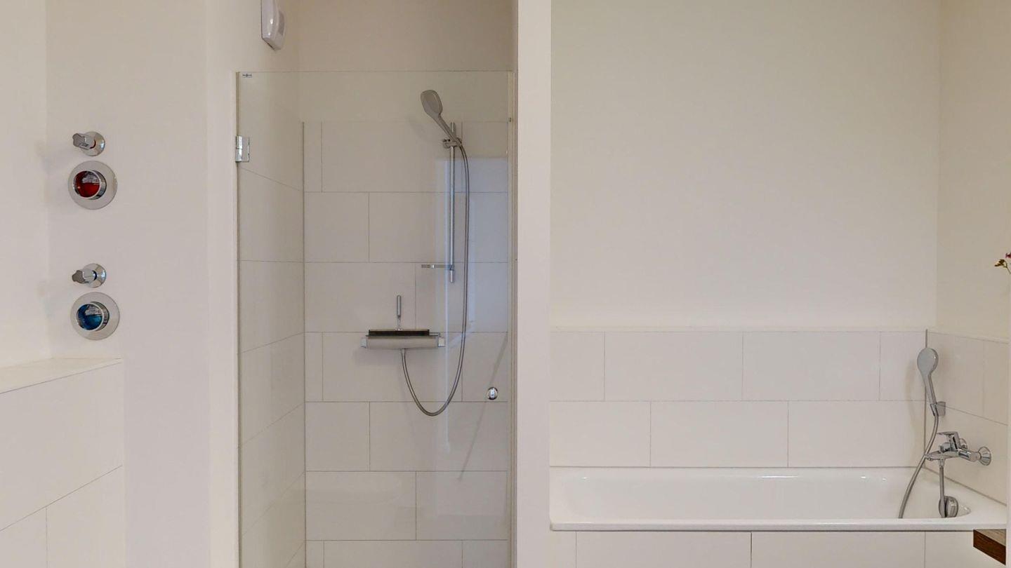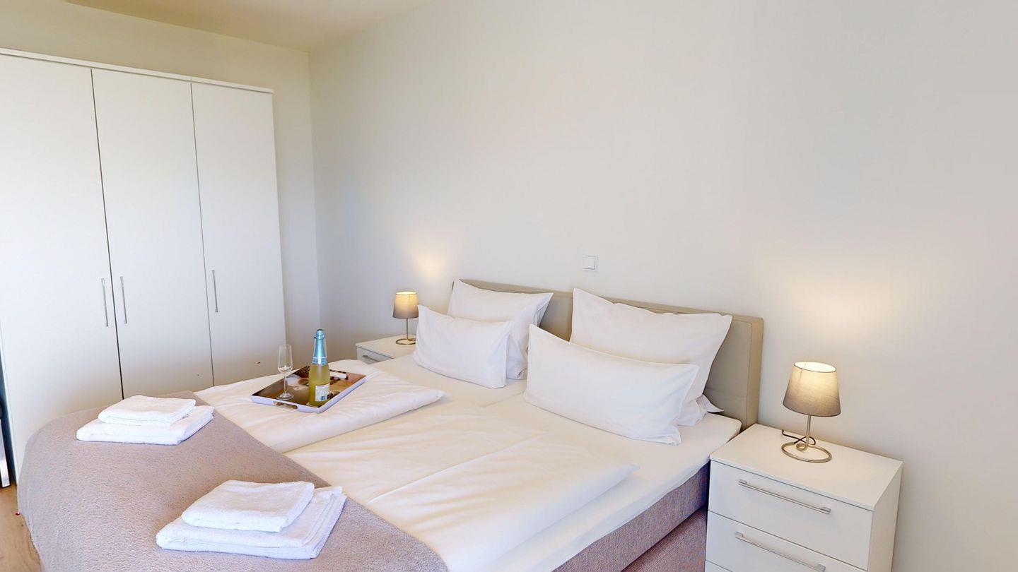 Die Wohnung hat außerdem ein getrenntes Schlafzimmer mit gemütlichem Boxspring-Doppelbett, ein modernes Bad mit Dusche und Badewanne sowie ausreichend Platz für Ihre Garderobe.