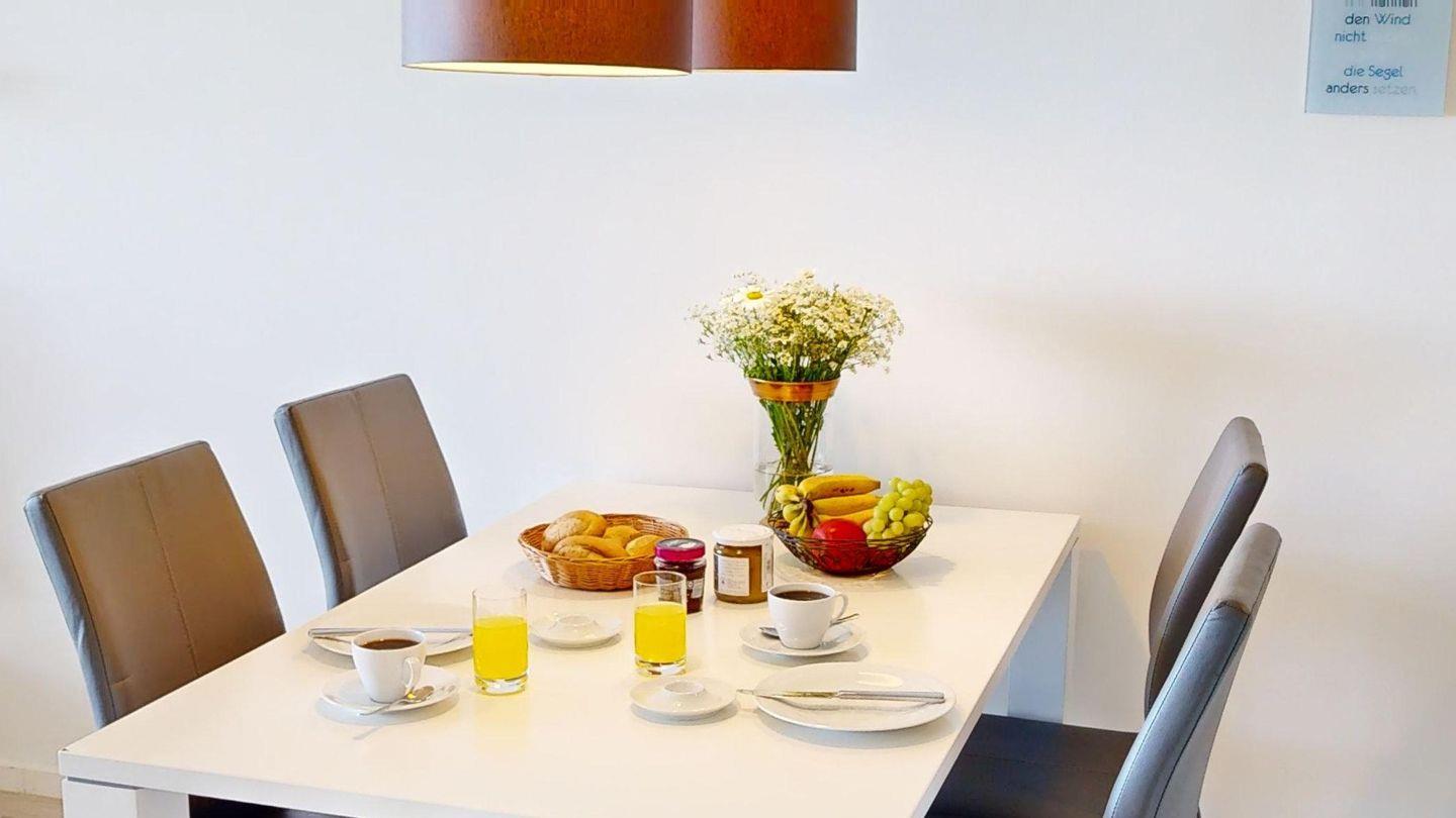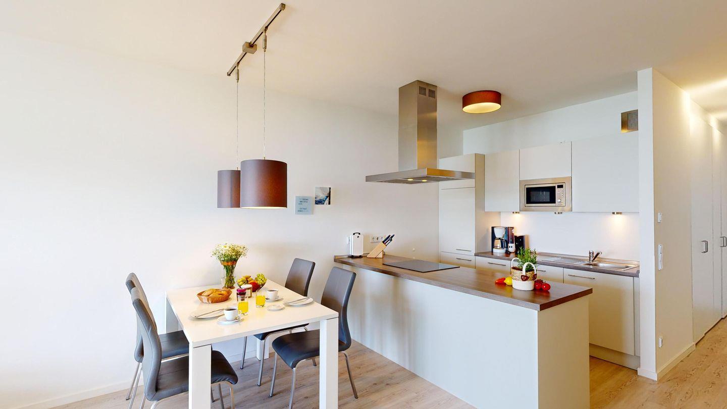 Der helle und offene Wohn- und Essbereich mit offener, voll ausgestatteter Küche sind das Herzstück der Wohnung. Sowohl aus der Küche als auch vom Sofa aus schauen Sie aufs Wasser. Das Sofa im Wohnzimmer kann als Schlafsofa genutzt werden und bietet zwei Schlafplätze.
