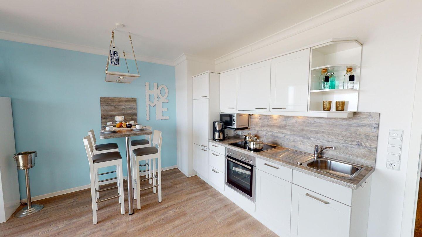 Das moderne Bad mit Dusche, das Schlafzimmer mit Doppelbett, der helle und offene Wohn-/Essbereich mit einem gemütlichen Sofa mit Schlaffunktion und atemberaubendem Meerblick sowie die voll ausgestattete Küchenzeile werden Sie begeistern! Ein Highlight ist der möblierte, halb überdachte Balkon - genießen Sie den Osteeblick und Sonne den ganzen Tag!