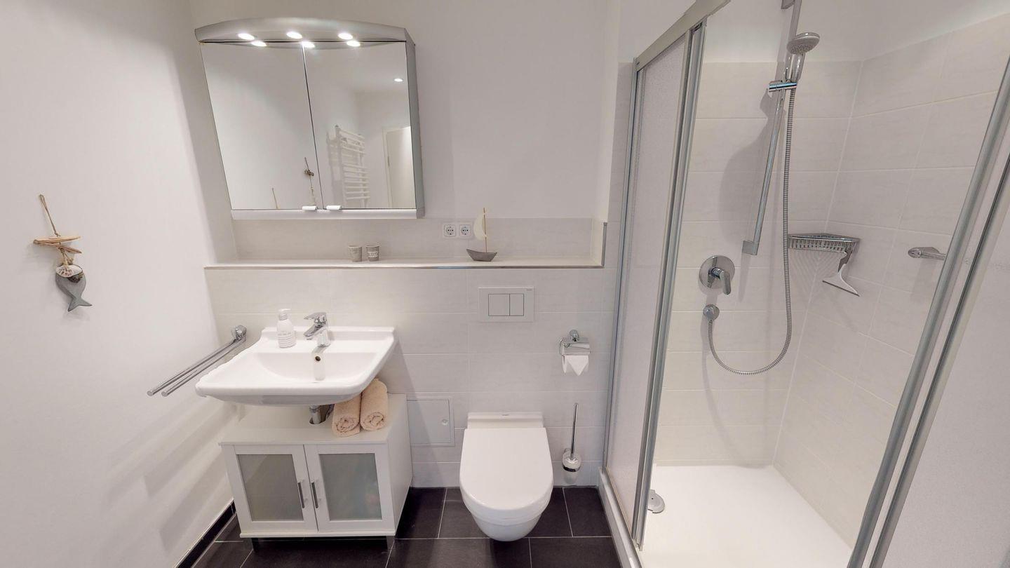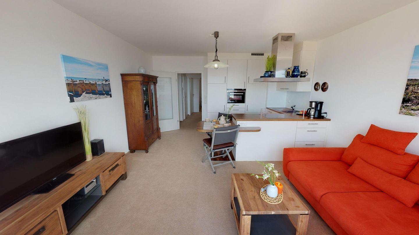Sie erwartet ein gemütliches Schlafzimmer mit Doppelbett, ein modernes Duschbad mit Waschmaschine sowie ein heller Wohnbereich mit Schlafsofa. Die offene Küche ist voll ausgestattet und lädt zum gemeinsamen Kochen ein. Der möblierte Balkon mit Meerblick ist das Highlight der Wohnung – perfekt für entspannte Abende oder das Frühstück mit Sonnenaufgang.