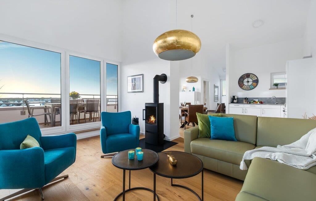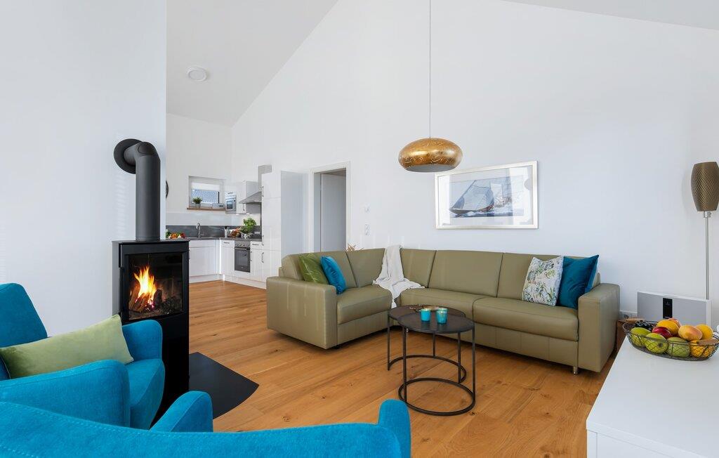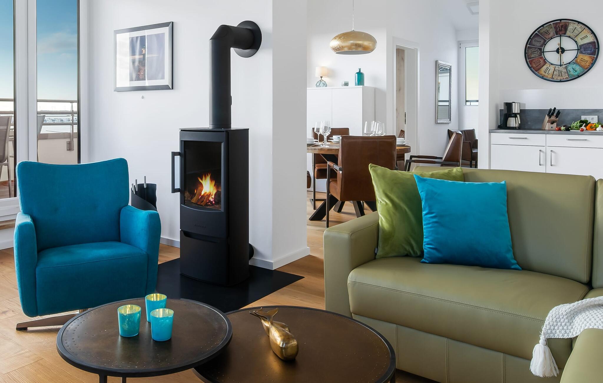 Die moderne und gemütliche Einrichtung mit ihren liebevoll gestalteten maritimen Details lässt einen schnell den Alltag vergessen. Neben Fernsehern und dem Kaminofen für die kühlere Jahreszeit ist alles vorhanden, um sich rundum wohlzufühlen. Das Bluetooth-Musiksystem sorgt für entsprechende Stimmung mit eurer Lieblingsmusik. Und wenn ihr das bequeme L-Sofa der Wohnlandschaft für euch entdeckt habt, wollt ihr bestimmt nicht so schnell wieder aufstehen.