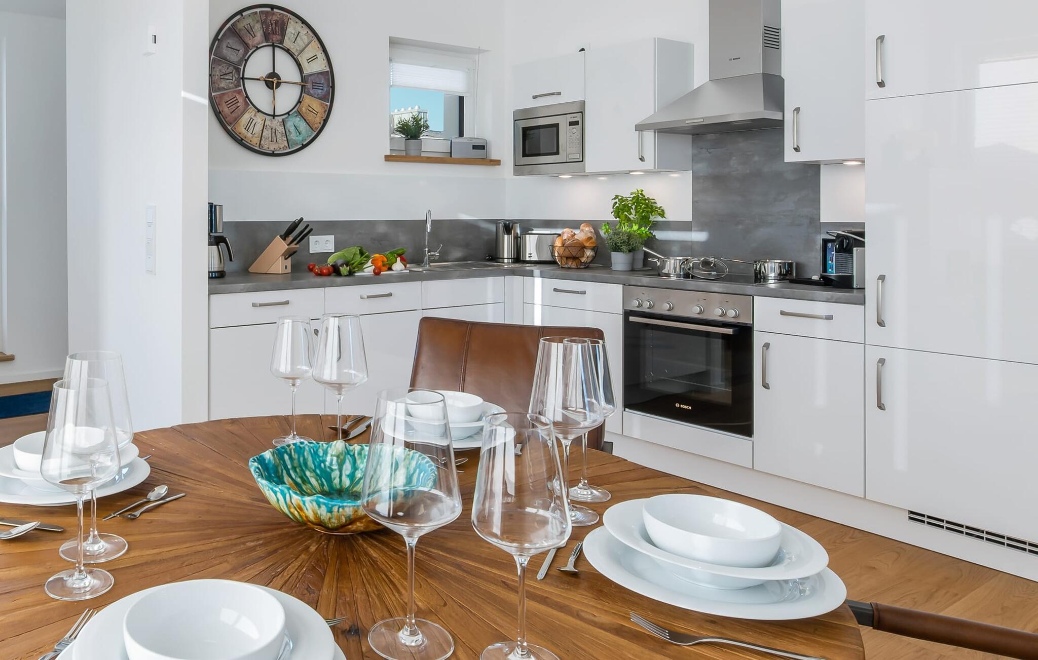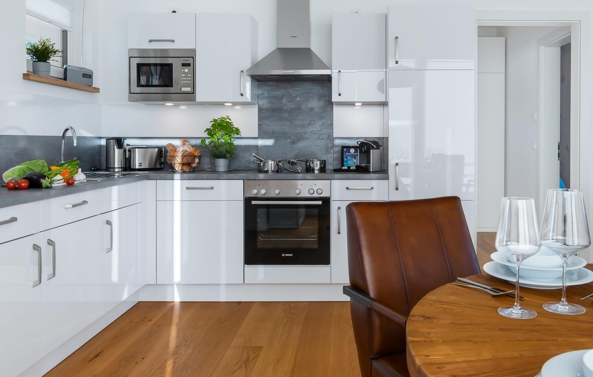 Und was gibt es Schöneres als die zubereiteten Speisen auf der angrenzenden großzügigen Loggia einzunehmen mit Blick auf das bunte Treiben im Marina-Areal. Mit dem Elektrogrill kommen auch Barbecue-Freunde auf ihre Kosten und das mit Blick auf den Sonnenuntergang über der Schlei, vielleicht ein Glas Wein dazu?