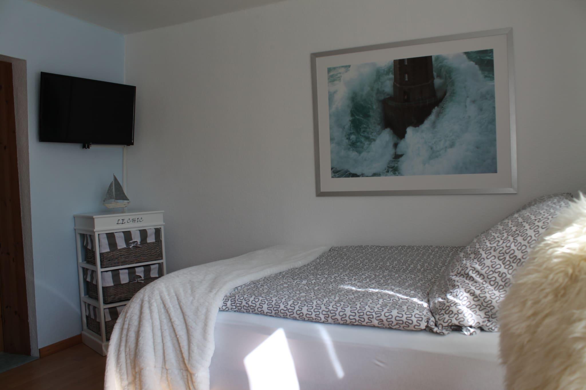 Parterre: (Eingangshalle(Gemeinschaftliche Nutzung mit dem Eigentümer), Kochnische(Toaster, Kochherd(4 Kochplatten, Ceranfeld), Kaffeemaschine, Mikrowelle, Kühlschrank(+ Gefrierfach)), Wohn-/Schlafzimmer(Doppelbett king size(160 x 200 cm), TV(Flatscreen), Esstisch(4 Personen), Sitzecke, DVD-Spieler, Radio, CD-Spieler), Schlafzimmer(Etagenbett), Badezimmer(Dusche(ebenerdige Dusche), Waschbecken, Toilette), Heizung) Terrasse(Gemeinschaftliche Nutzung mit dem Eigentümer, überdacht), Garten(Gemeinschaftliche Nutzung mit dem Eigentümer, umzäunt), Fahrradabstellraum, Gartenmöbel, Grill, Parkplatz, Liegestühle, Sonnenschirm