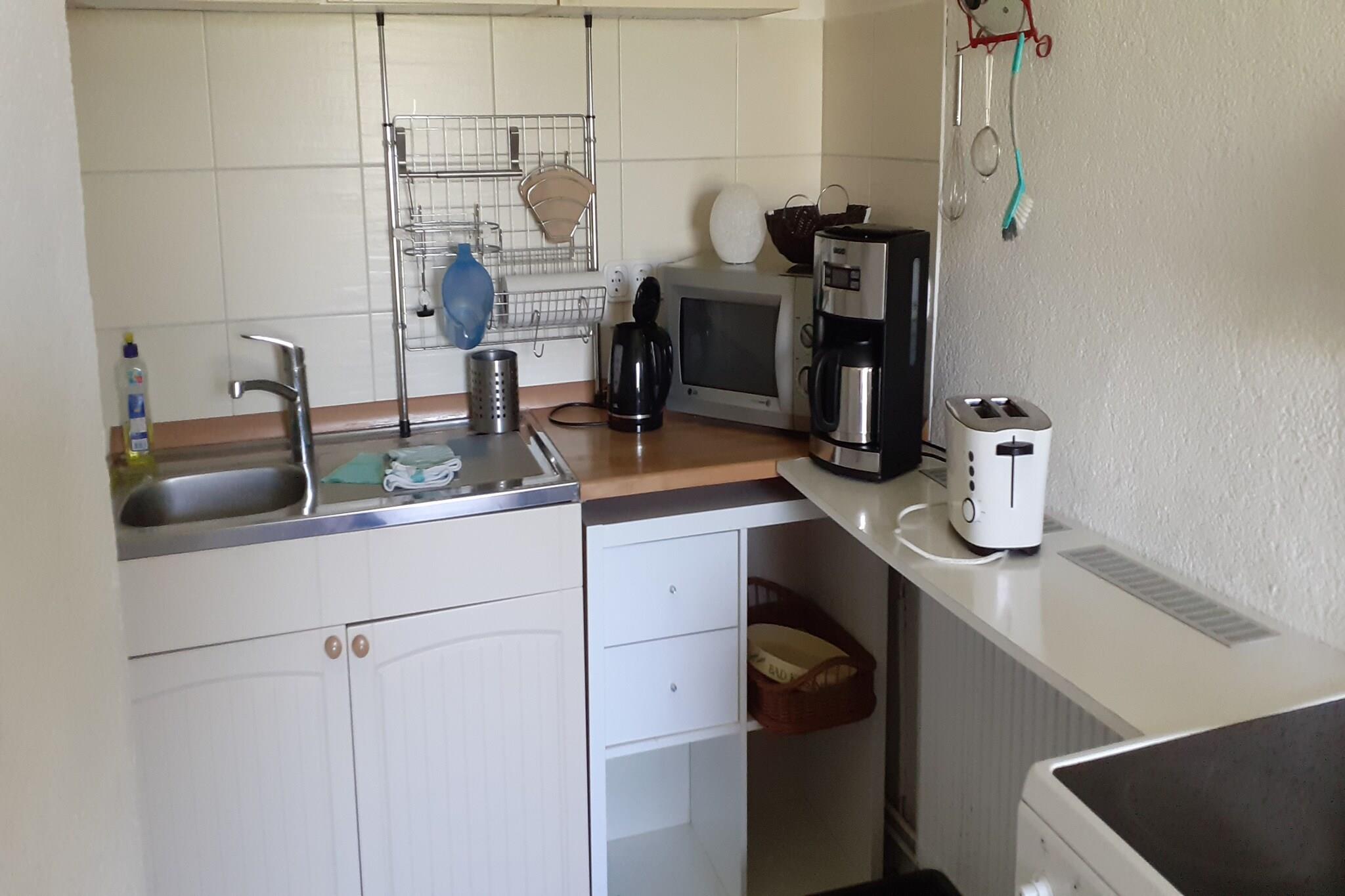 Parterre: (Küche(Wasserkocher, Toaster, Kochherd(4 Kochplatten), Kaffeemaschine, Backofen, Mikrowelle, Kühlschrank(+ Gefrierfach)), Wohn-/Schlafzimmer(Doppelschlafcouch, TV(Flatscreen), Esstisch(4 Personen), Sitzecke, Radio), Schlafzimmer(Doppelbett king size), Badezimmer(Dusche, Waschbecken, Toilette), Heizung, Hochstuhl) Terrasse, Garten(Gemeinschaftliche Nutzung mit dem Eigentümer), Gartenmöbel, Grill, Parkplatz, Sonnenschirm