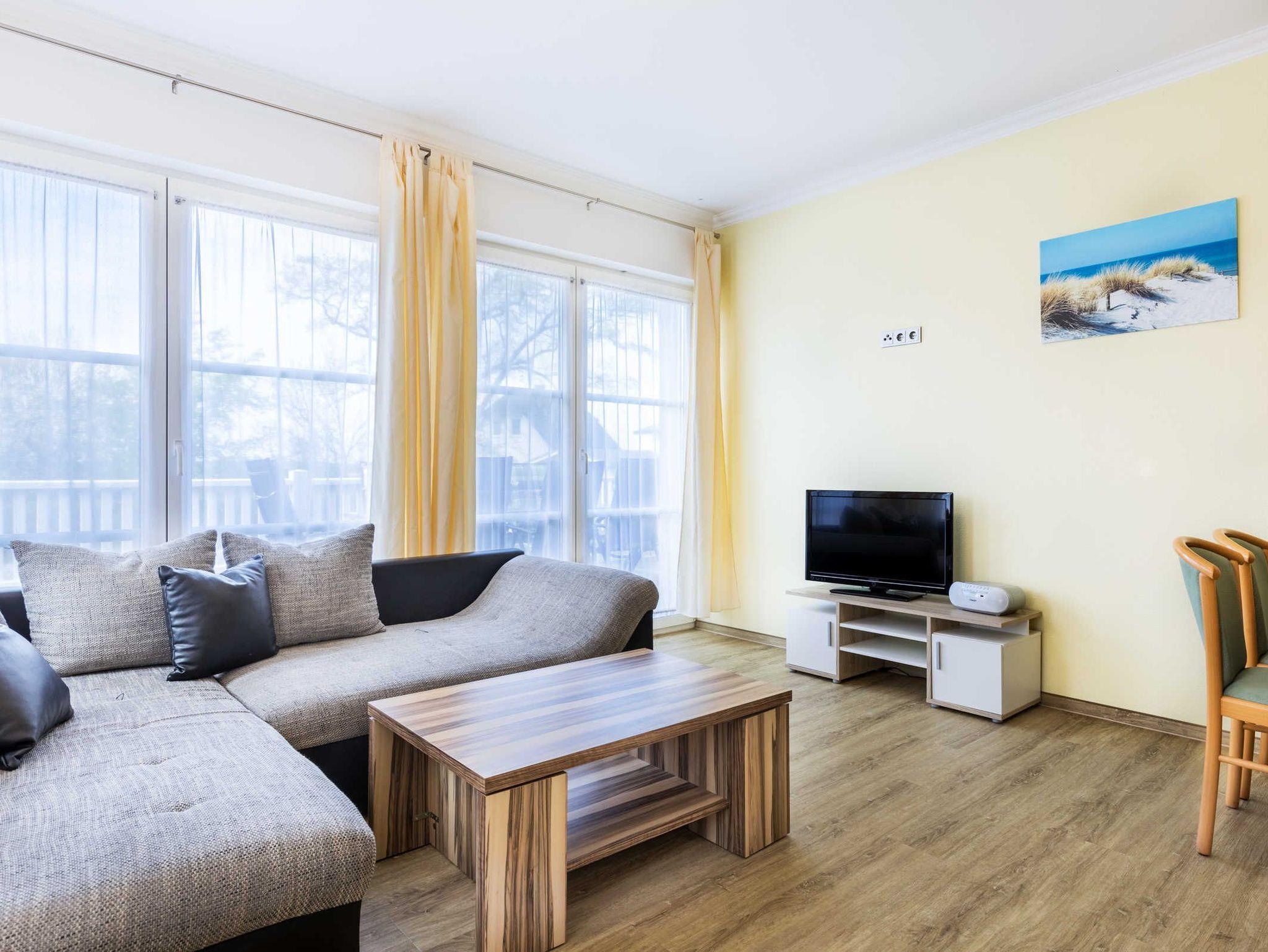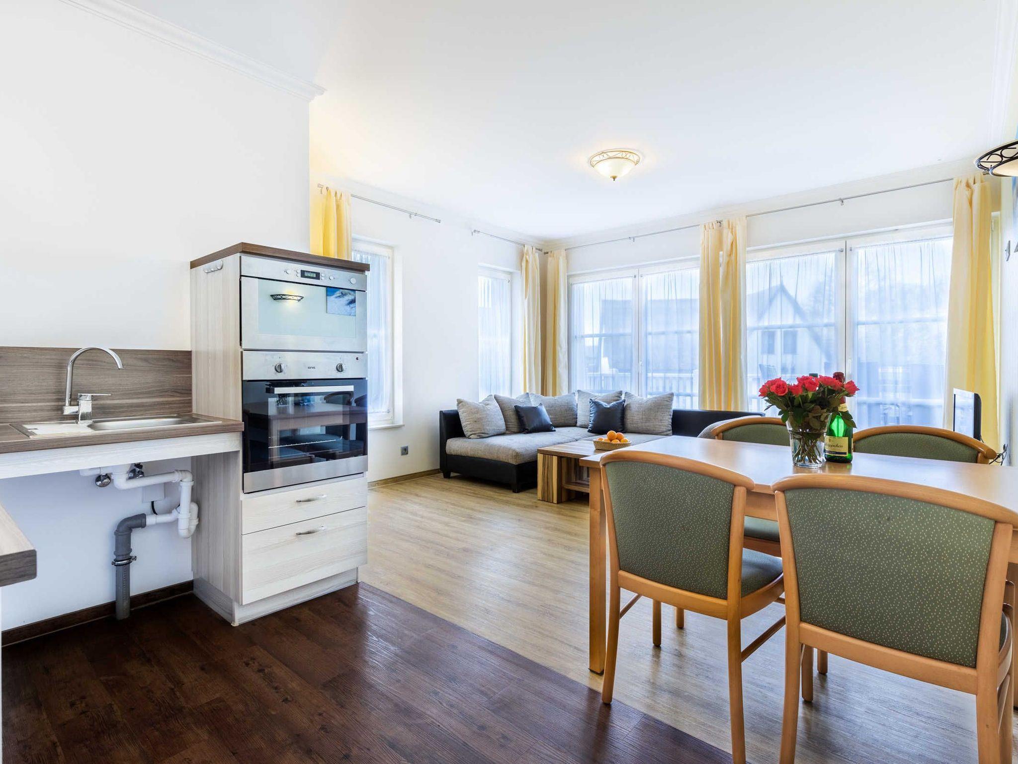 Die Ferienwohnung Barbara ist ganz und gar rollstuhlgrecht eingerichtet und bietet somit auch ein perfektes Feriendomizil für Rollifahrer. Die Ferienwohnung verfügt über zwei separate Schlafzimmer je mit Doppelbett und Kleiderschrank sowie einen komfortablen Wohn- und Essbereich mit unterfahrbarer Küchenzeile (Kühlschrank, Gefrierfach, Kaffeemaschine, Toaster, Wasserkocher). Der Esstisch sowie die Sitzecke mit bequemer Schlafcouch bieten ausreichend Platz zum Wohlfühlen. Aus dem Wohnzimmer gelangen Sie direkt auf die Holzterrasse mit dem Blick auf die Ferienanlage und in die grüne Salzhafflandschaft. Das Bad mit Dusche und WC ist barriefrei gestaltet.