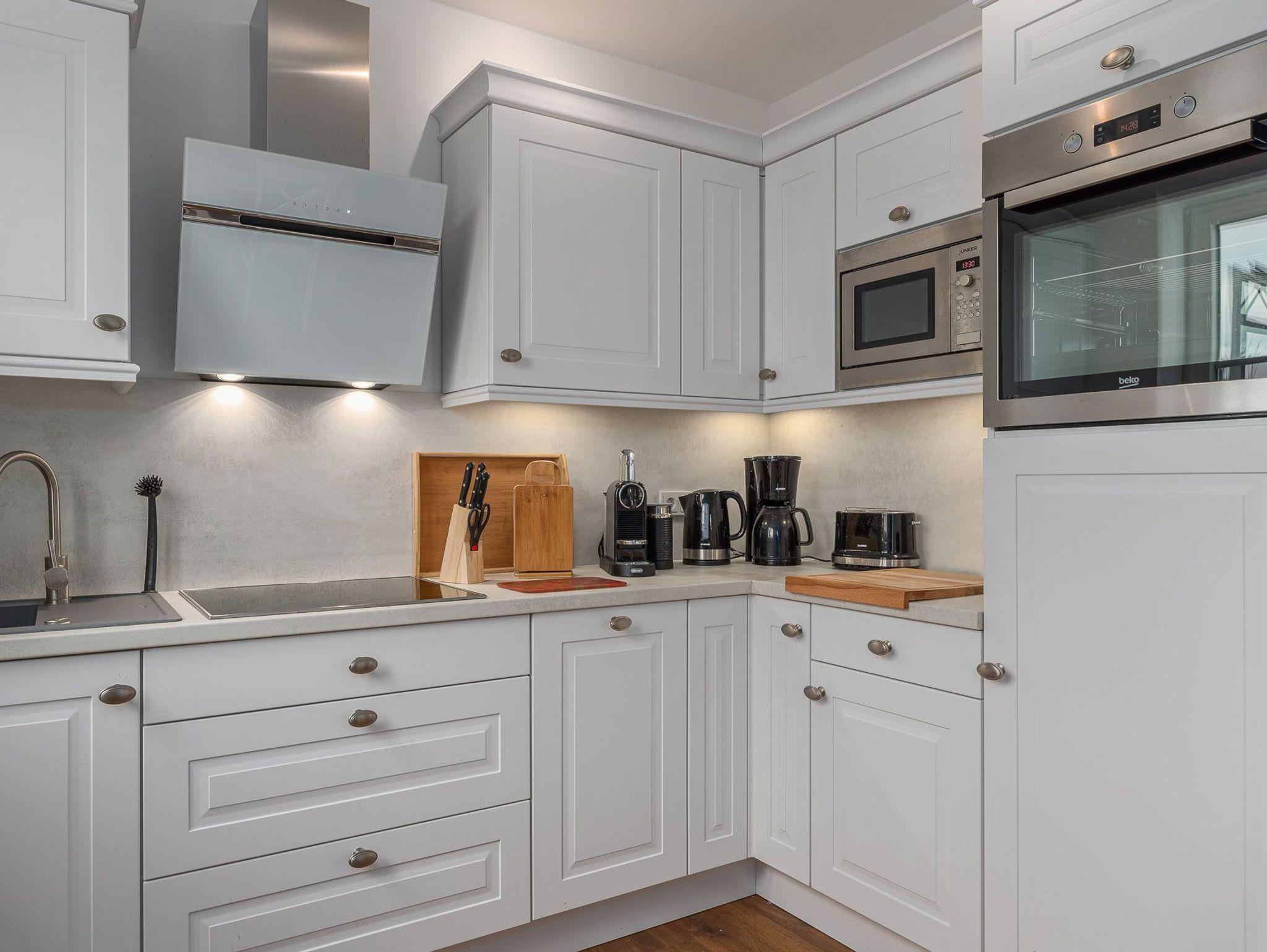 Das Ferienhaus ist 2020 neu erbaut worden. Es verfügt über eine hochwertige Ausstattung im Landhausstil mit Fußbodenheizung. Der Wohn-/Essbereich ist ausgestattet mit einem Kaminofen (exklusive Brennholz), Flachbildschirm mit Sat/TV, Ecksofa und 2 Sesseln, Esstisch mit 6 Stühlen, eine top eingerichtete Küche mit Geschirrspüler, Cerankochfeld, Backofen, Kühlschrank mit Eisfach, Mikrowelle, Espresso-Maschine (Nespresso), Rührgerät, Toaster,[nbsp] Wasserkocher, Filter Kaffeemaschine