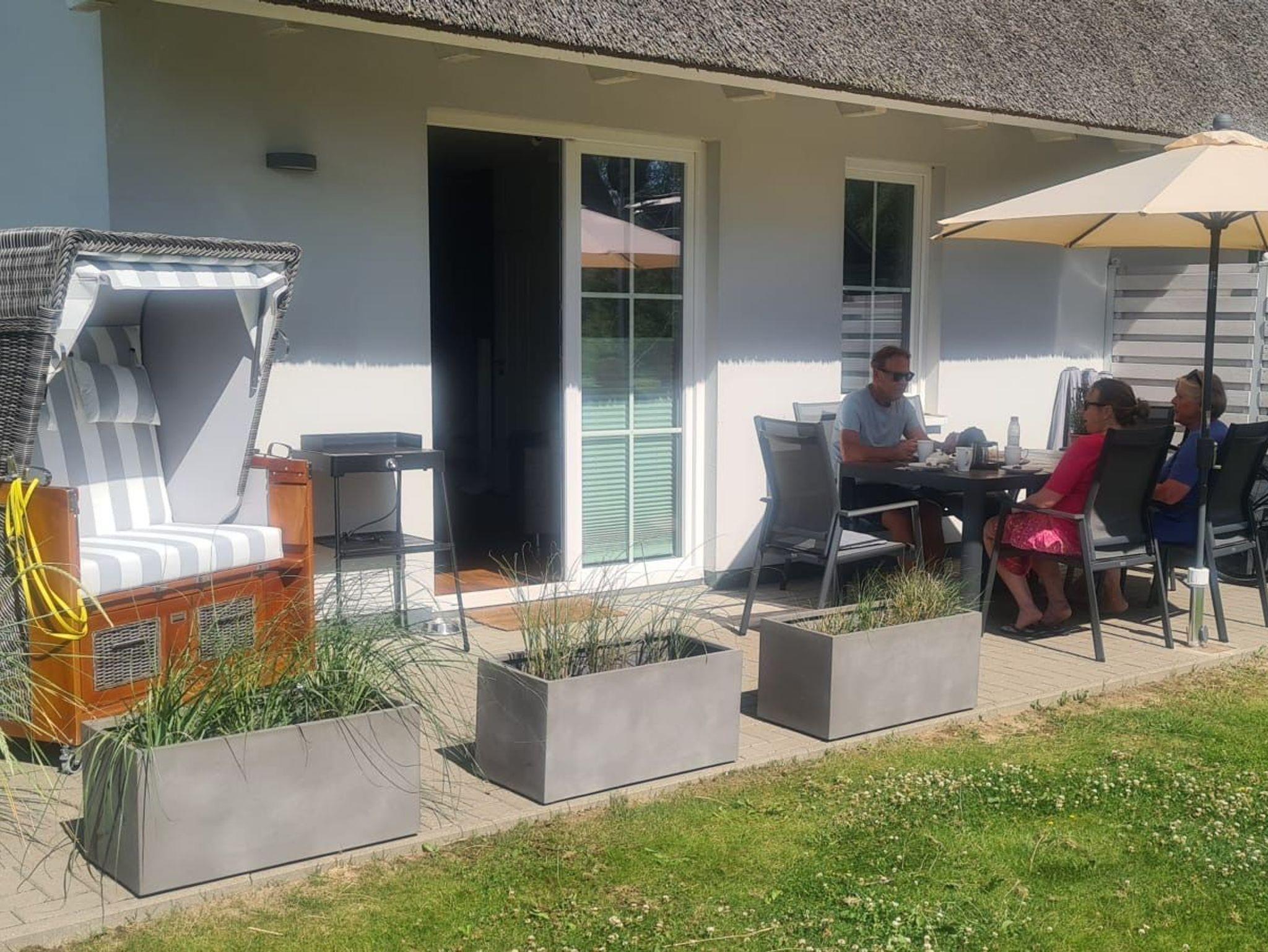 Für die Terrasse ist 1 Tisch mit 6 Stühlen, Strandkorb und für die Seitenterrasse 1 Tisch mit 2 Stühlen vorhanden.