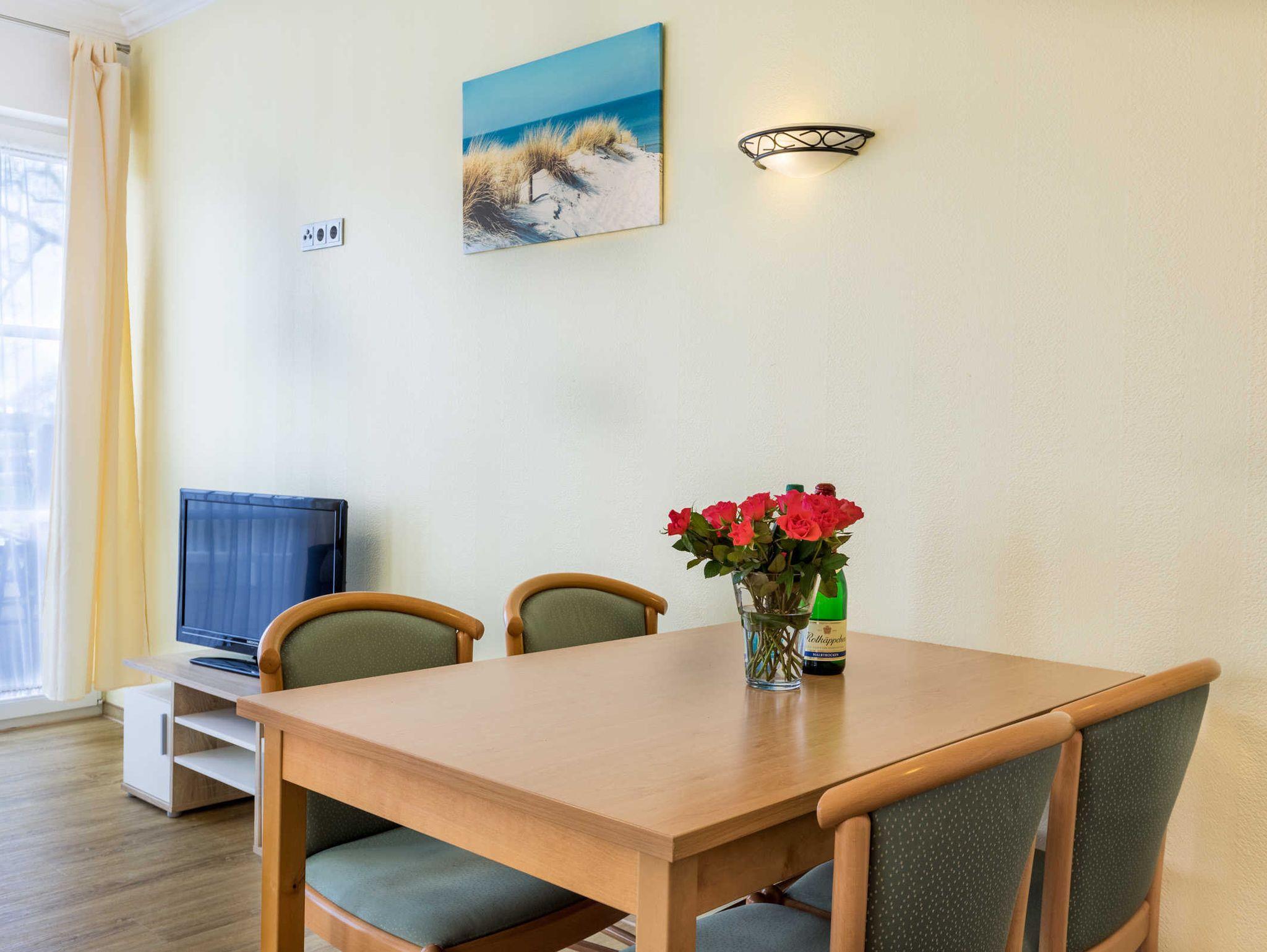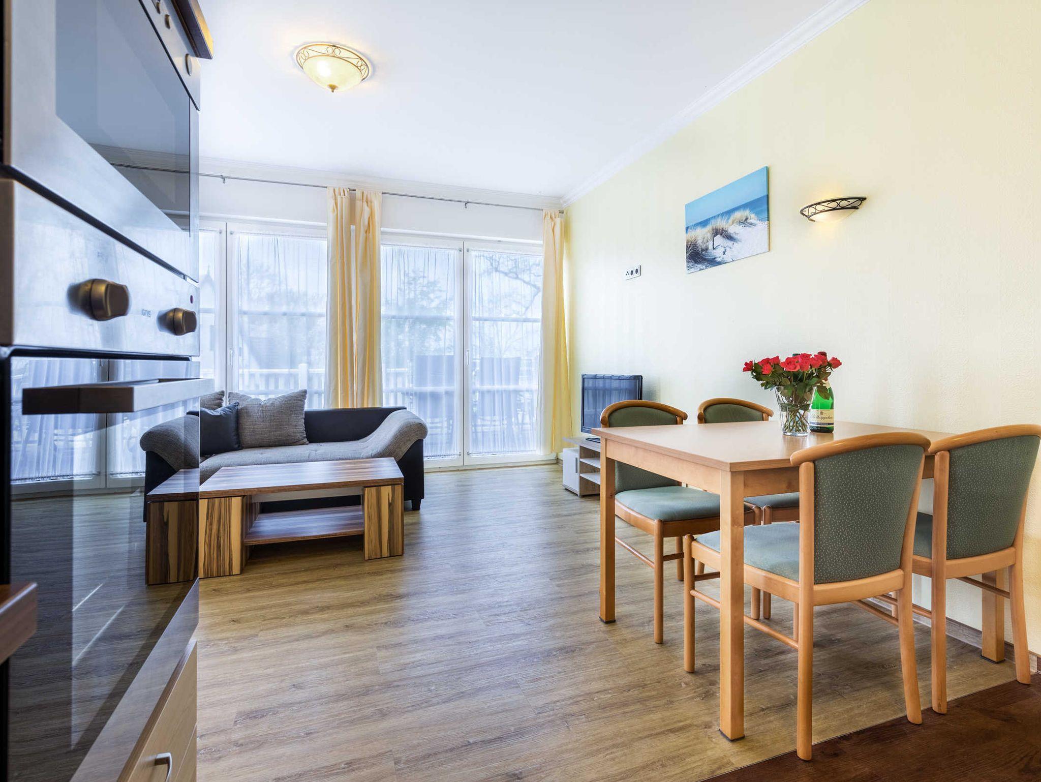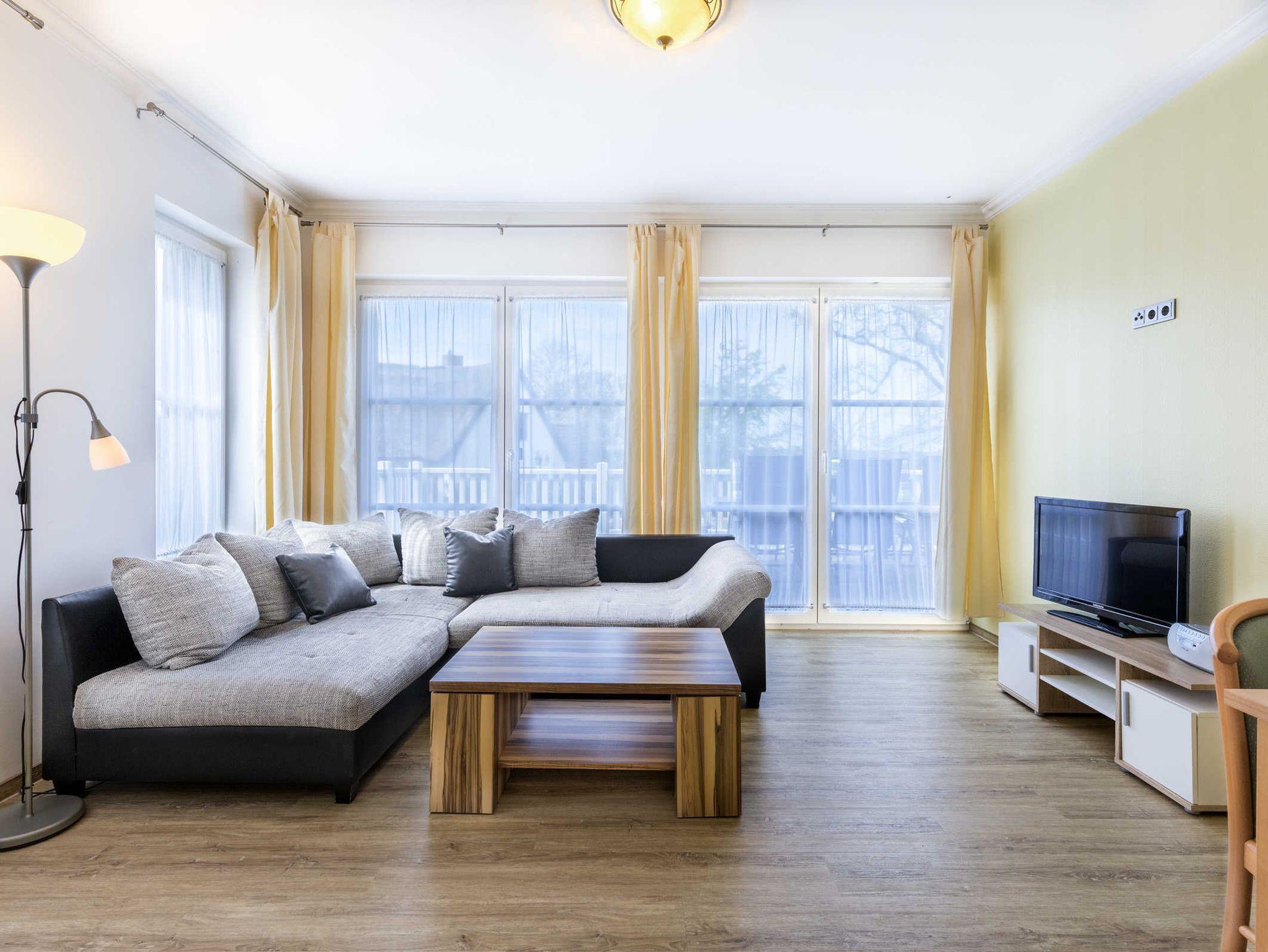Die großzügige und ebenerdige Ferienwohnung Günter befindet sich im Ergeschoss des Ostseeferienhauses Drachenflieger. Die Ferienwohnung verfügt über ein separtes Schlafzimmer mit Doppelbett und Kleiderschrank, einen Wohn- Essbereich mit umfangreich ausgestatteter Küchenzeile (Kühlschrank mit Gefrierfach, 4- Platten- Herd, Backofen, Kaffeemaschine, Wasserkocher, Toaster) sowie einen Essbereich und Sitzecke mit ausziehbarer bequemer Schlafcouch. Vom Wohnbereich gelangen Sie auf die eigene angeschlossene Terrasse. In diesem Wohbereich lässt sich aufgrund der Raumgröße ein großer Essbereich für alle Gäste dieser Kombibuchung gestalten. Bad mit Dusche und WC.