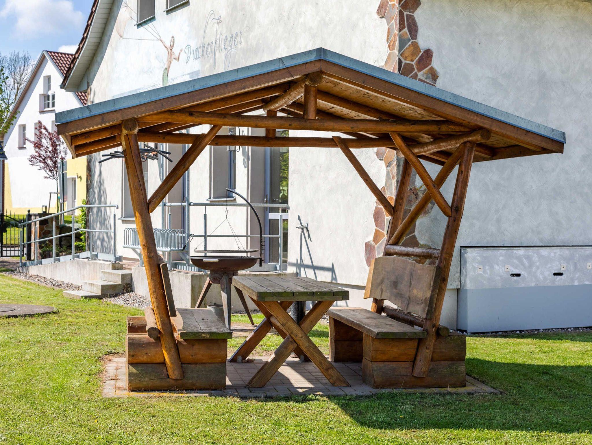 Abschließbarer Fahrradschuppen, Unterstellmöglichkeit sowie Wasch- und Trockenplatz für Wassersportzubehör, wie Surfbretter, Neos oder Tauchausrüstung.