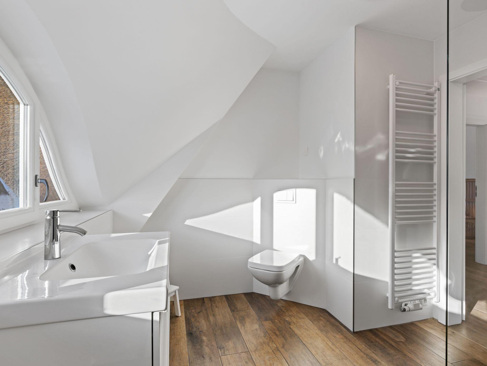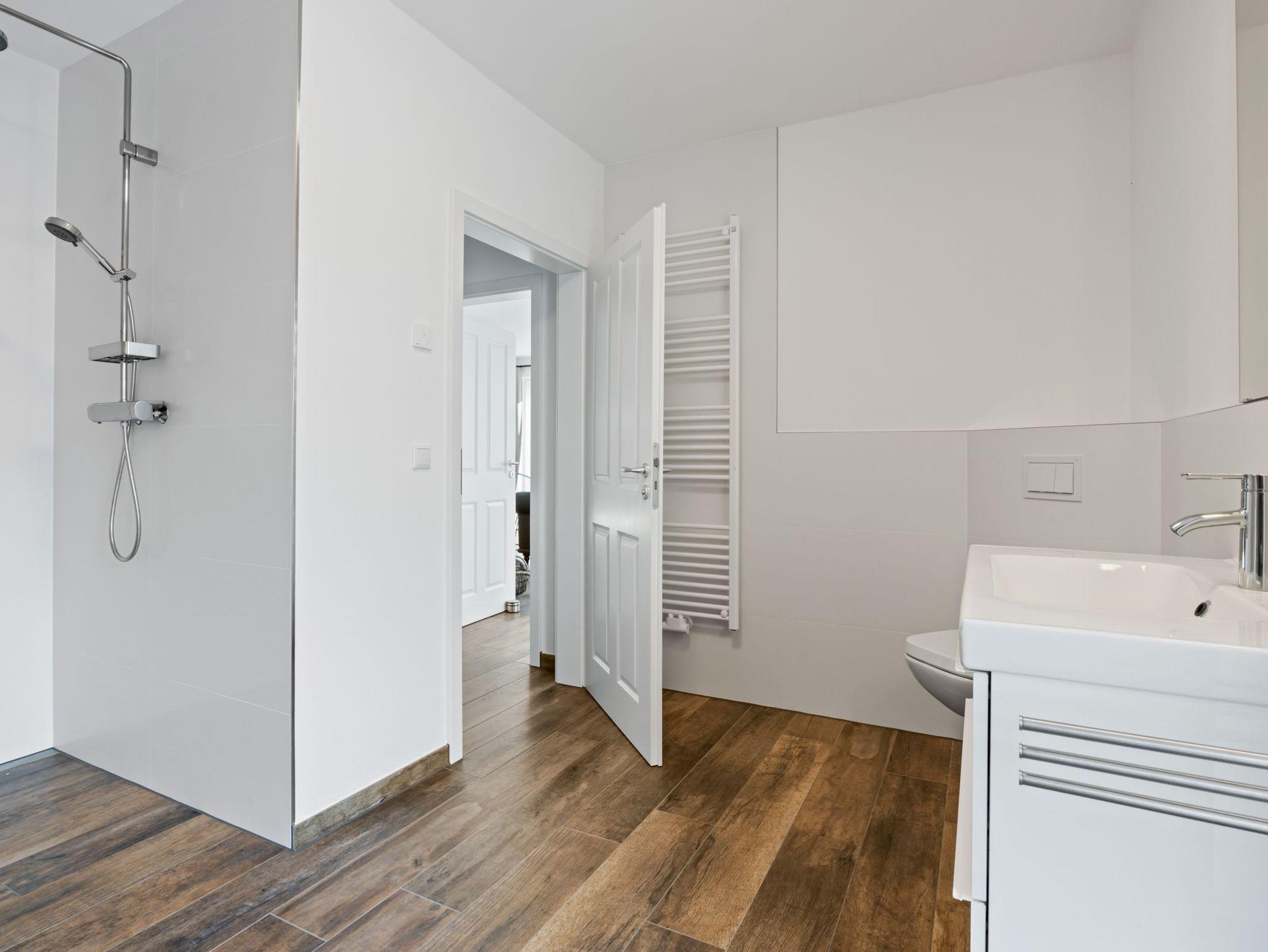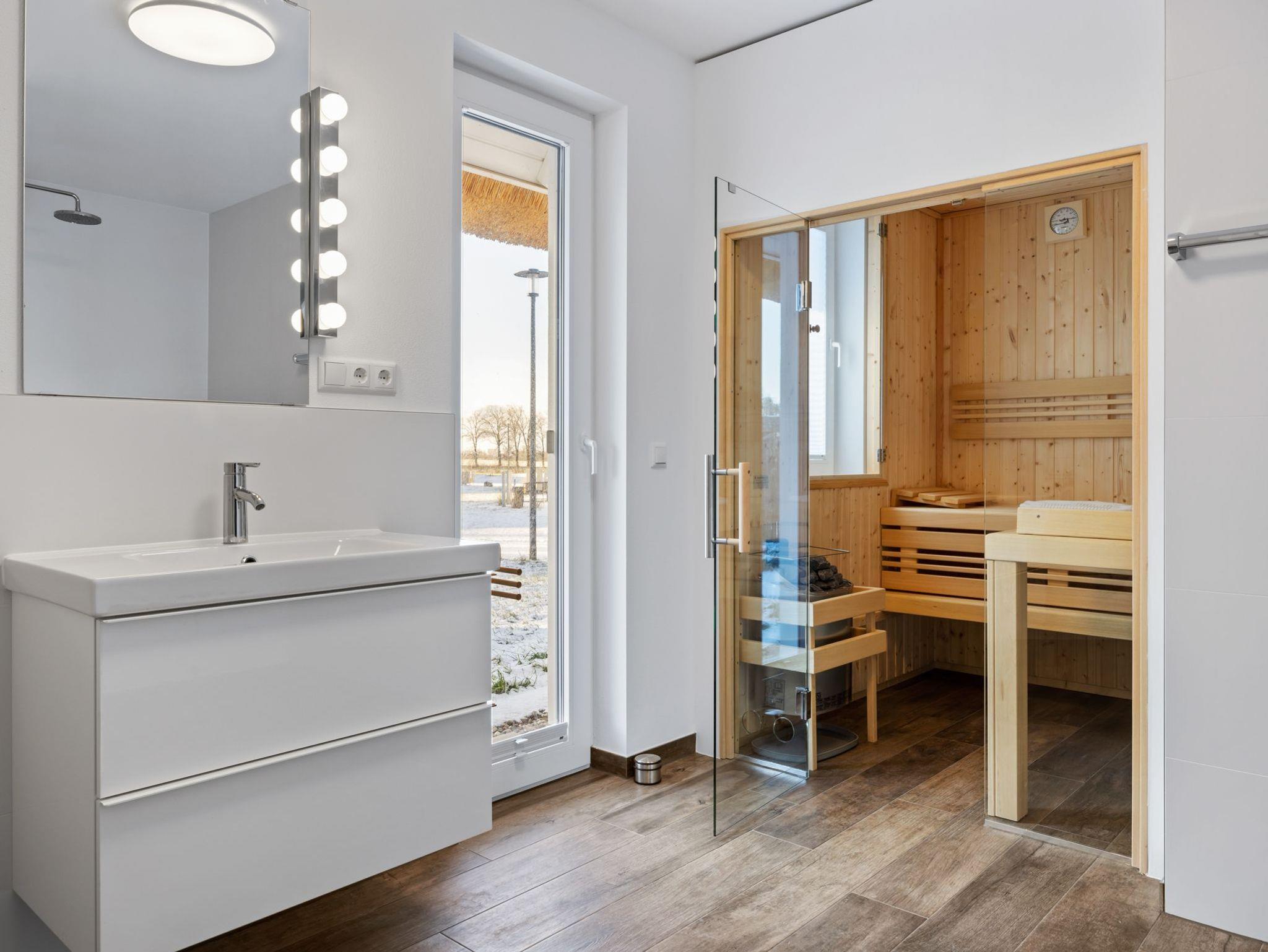 Bad mit großer ebenerdiger Rainshower- Dusche und Sauna sowie direkter Zugang zum Garten.