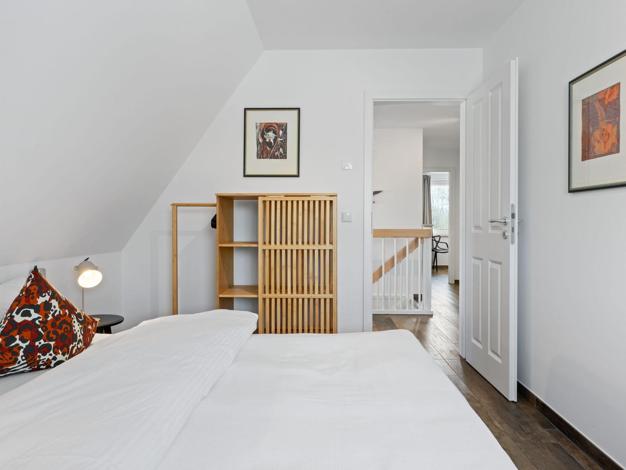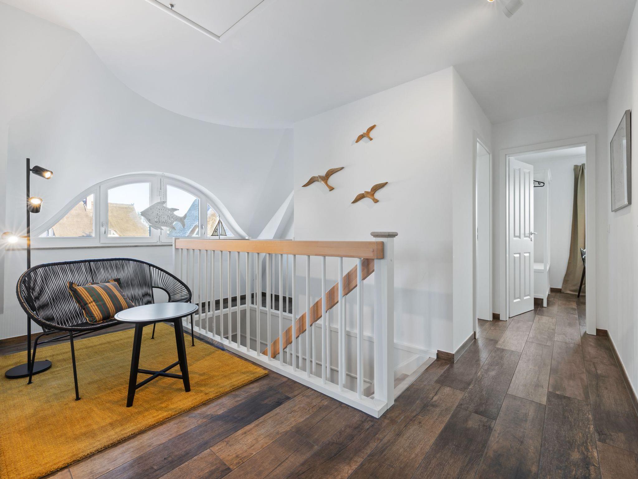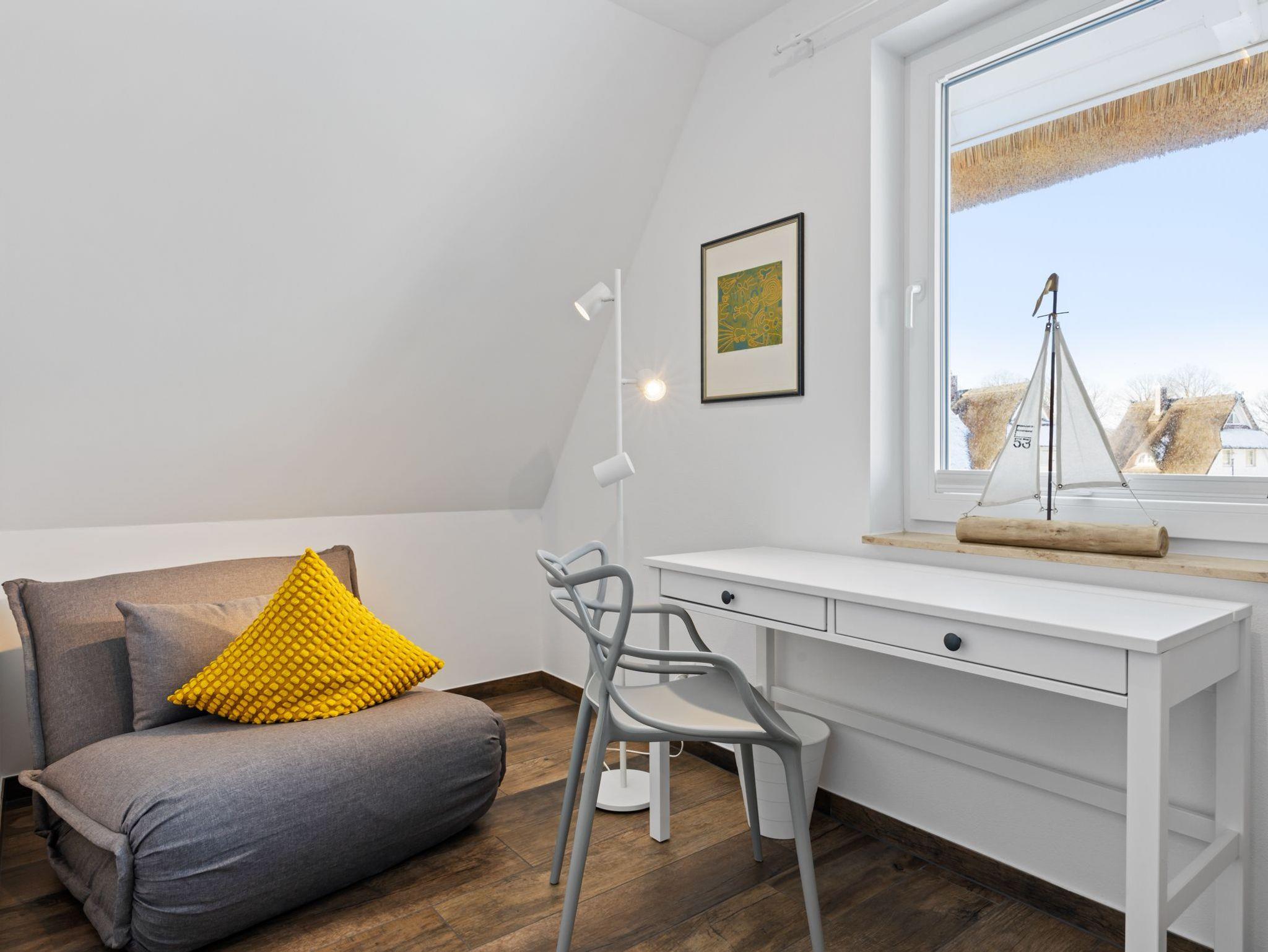 Im Obergeschoss befinden sich drei weitere Schlafzimmer sowie ein Arbeitszimmer als Rückszugort. Schlafzimmer 2 mit Doppelbett (1,80 x 2,00m), offenem Kleiderschrank. Schlafzimmer 3 mit Doppelbett (1,60 x 2,00m), und offenem Kleiderschrank, Schlafzimmer 4 mit Doppelbett (1,40 x 2,00m) und Kleiderkommode. Zimmer 5 mit Arbeitsbereich und herrlichem Ausblick vom Schreibtisch. In der Galerie des OG ist ein chilliger Bereich für die Gäste des Hauses enstanden, somit gibt es viele individuelle Rückzugsorte im haffhouse. Unter der Reetgaube lädt das Wohlfühlbad mit Rainshower- Dusche zu kleinen Wellnesseinheiten ein. Ein weiteres Gäste WC ist ebenso im OG vorhanden sowie Waschmaschine und Trockner im Flurbereich.