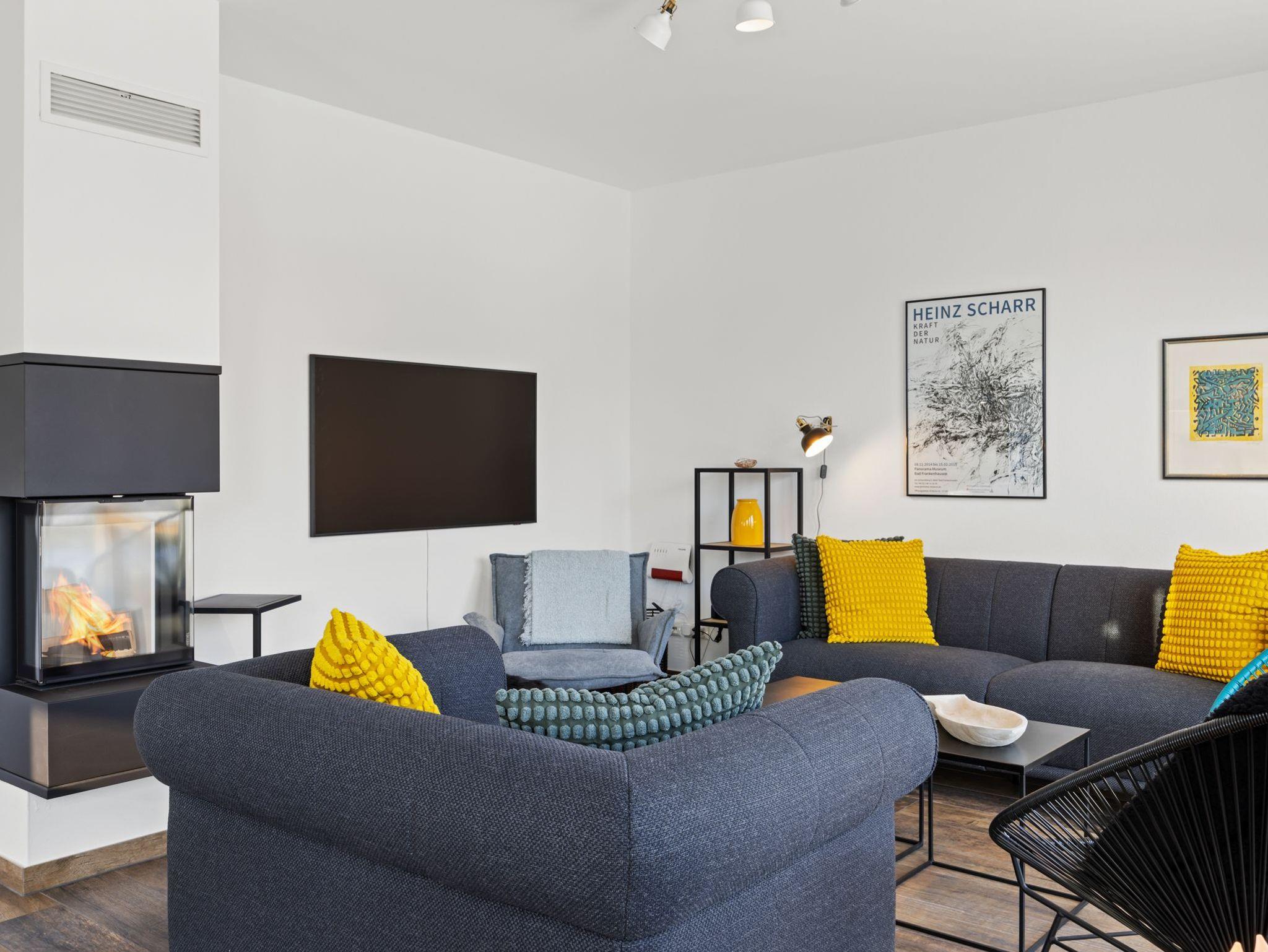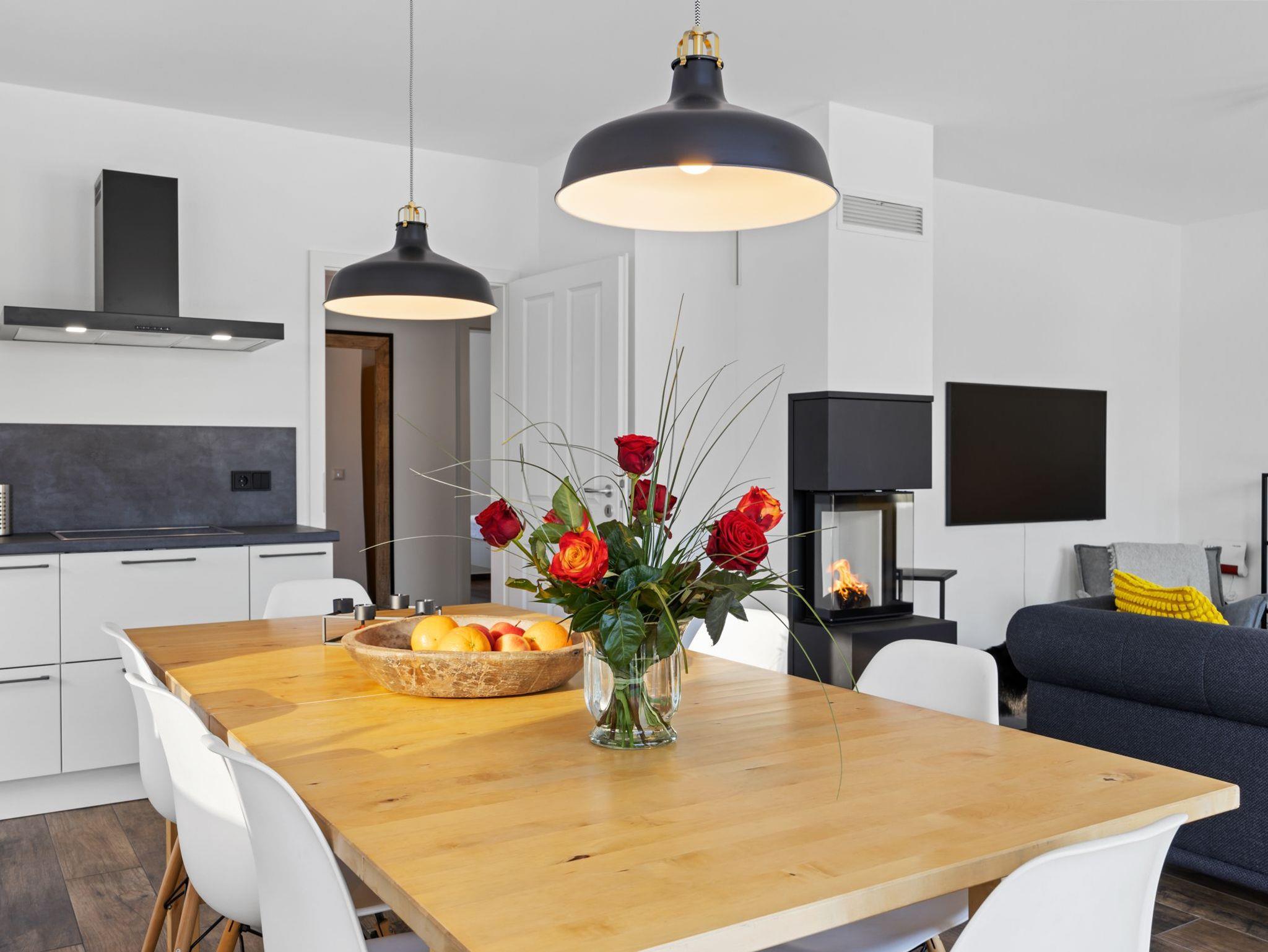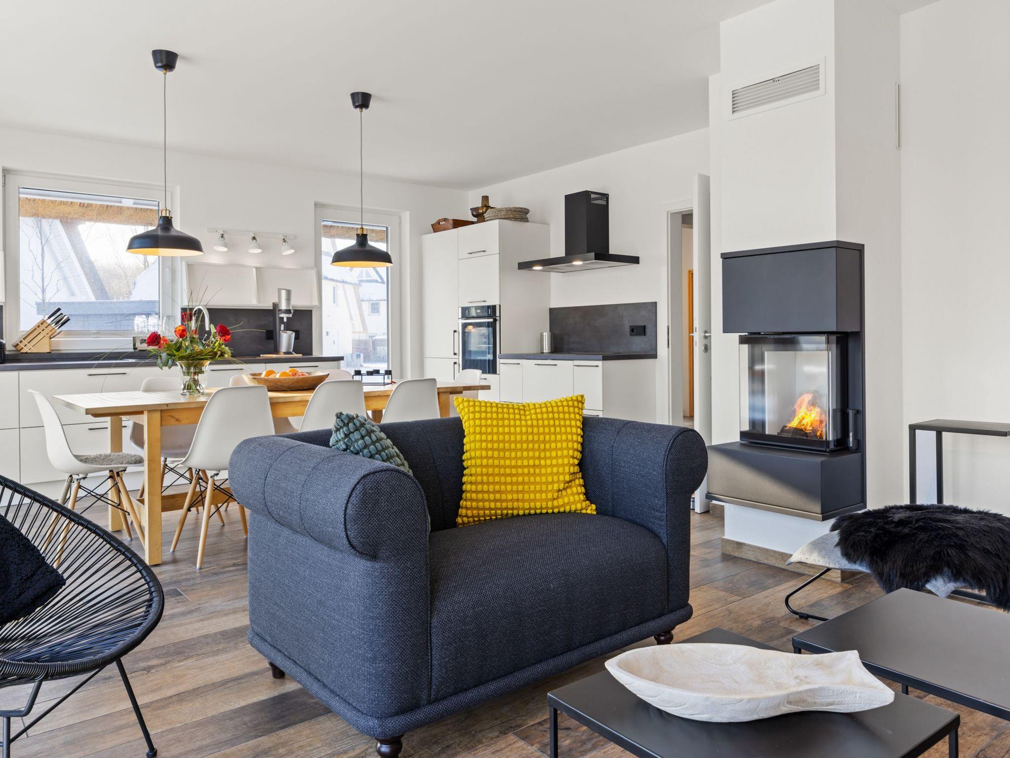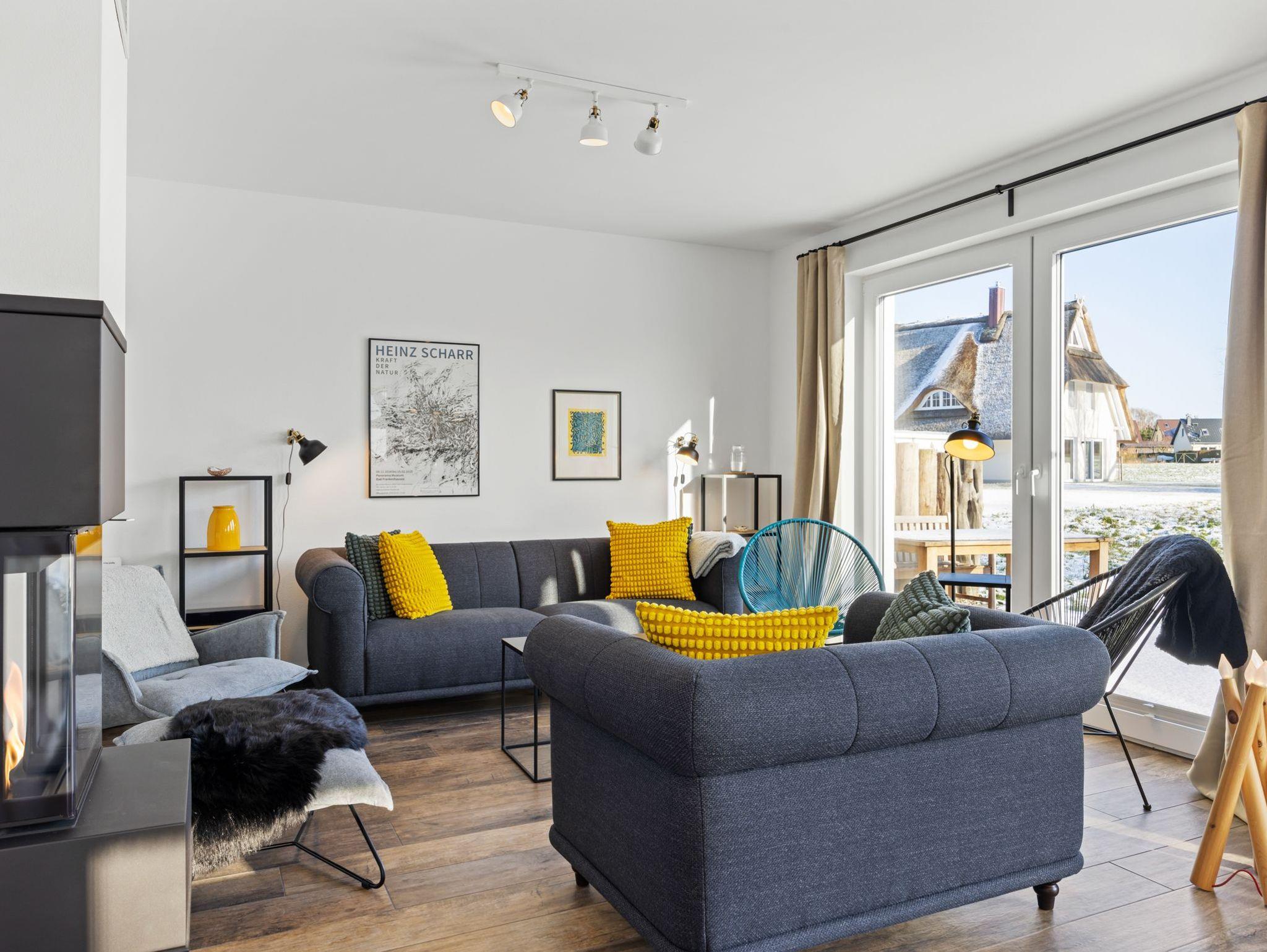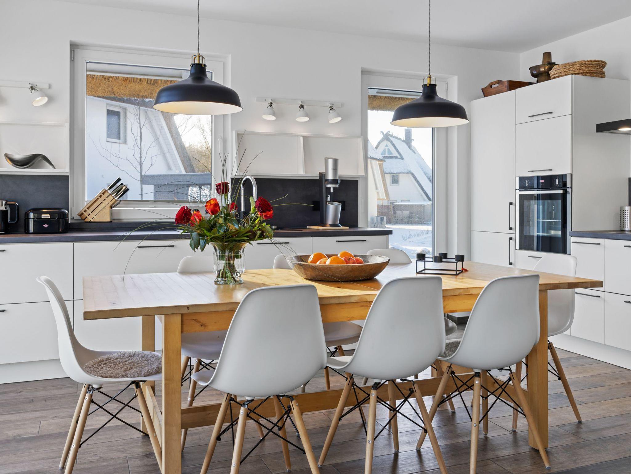 Weitläufiger Flur zum entspannten Ankommen für alle Urlaubsgäste. Großzügiger, stylisch und urgemütlich eingerichteter Wohn- Essbereich mit Sofaecke und Kamin sowie Smart TV. Die Küche verfügt über einen großen Esstisch für 8 Personen und eine umfangreiche Ausstattung mit Geschirrspüler, Backofen, Herd mit 4 Kochfeldern, Mikrowelle, Wasserkocher, Filterkaffeemaschine, Pad Maschine, Fondue und jede Menge weitere Küchenutensilien. Aus der Küche gelangt man direkt auf den schönen großen Terrassenbereich mit Blick in die freie und unverbaute Natur der Salzhaffregion. Hier kann man ebenso wunderbar den klaren Ostseehimmel genießen und einfach die Seele baumeln lassen