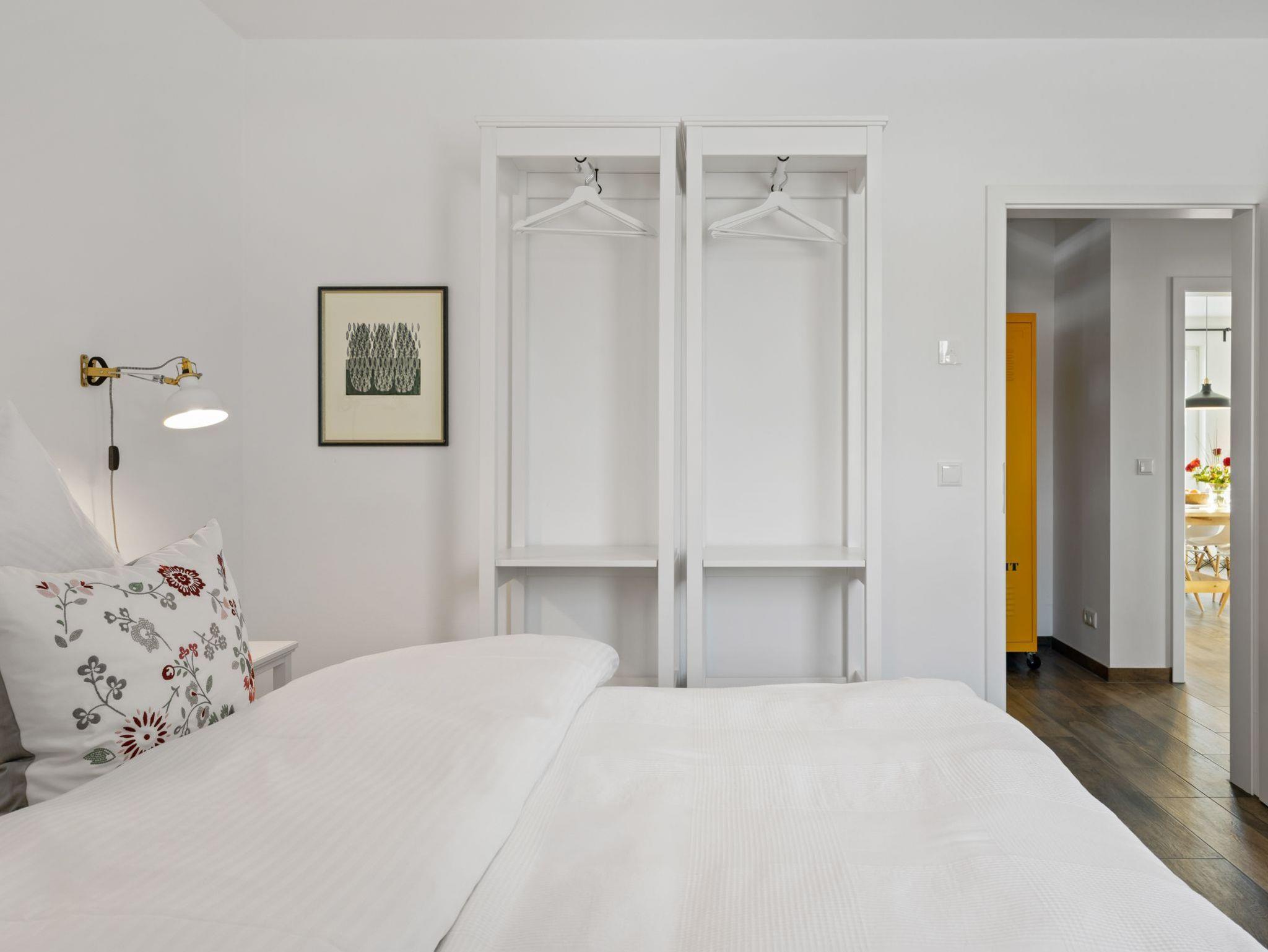 Schlafzimmer 1 im EG mit Doppelbett (1,80 x 2,00m), offenem Kleiderschrank.