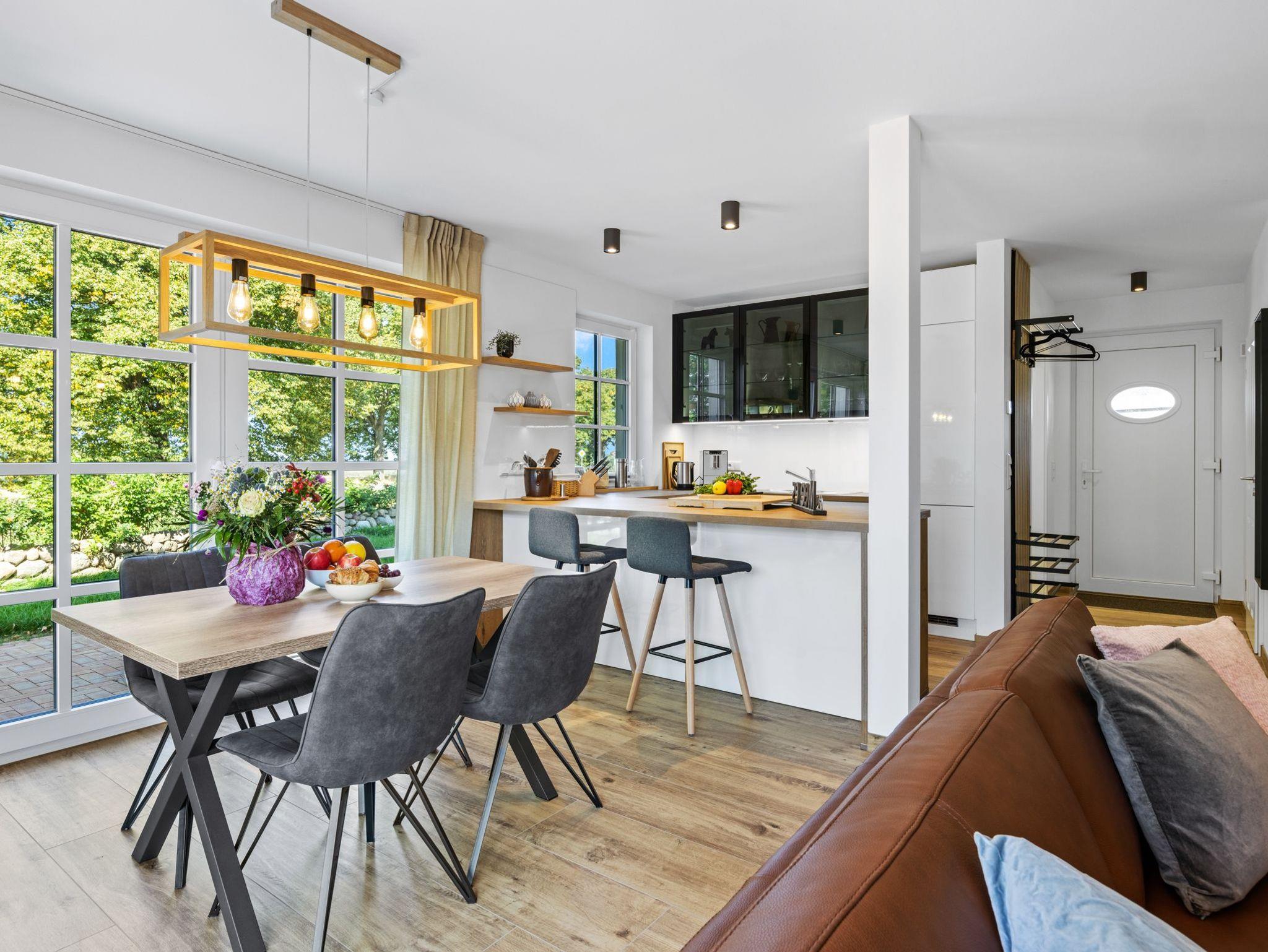 Ein kleiner Flur mit Blick in den offenen Wohnbereich zum entspannten Ankommen für alle Urlaubsgäste. Am Flur angrenzend befindet sich das erste Badezimmer mit ebenerdiger Dusche. Ein kleiner Hauswirtschaftsraum bietet Platz für die Waschmaschine. Großzügiger, stylisch und urgemütlich eingerichteter Wohn- Essbereich mit Ledersofa, Sessel und Kamin sowie Smart TV. Der Küchenbereich verfügt über einen großen Esstisch für 4, bzw. 6 Personen und eine umfangreiche Ausstattung mit Geschirrspüler, Backofen, Herd mit 4 Kochfeldern, Wasserkocher, Kaffeevollautomat und jede Menge weitere Küchenutensilien. Aus dem offenen Küchen-Wohnbereich gelangt man direkt auf den schönen Terrassenbereich mit Blick in die freie und unverbaute Natur der Salzhaffregion. Hier kann man ebenso wunderbar den klaren Ostseehimmel genießen und einfach die Seele baumeln lassen.