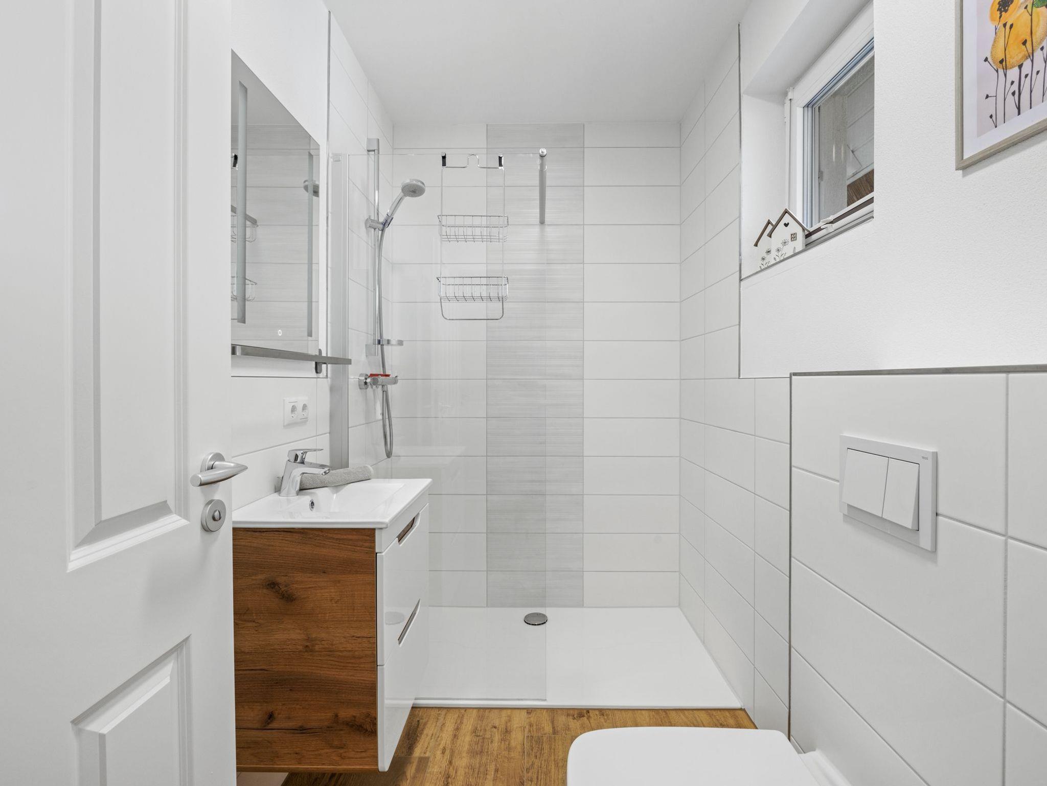 Das zweite Bad mit großer ebenerdiger Dusche und freiem Blick in die Natur bietet echtes Salzhaff Urlaubsfeeling.
