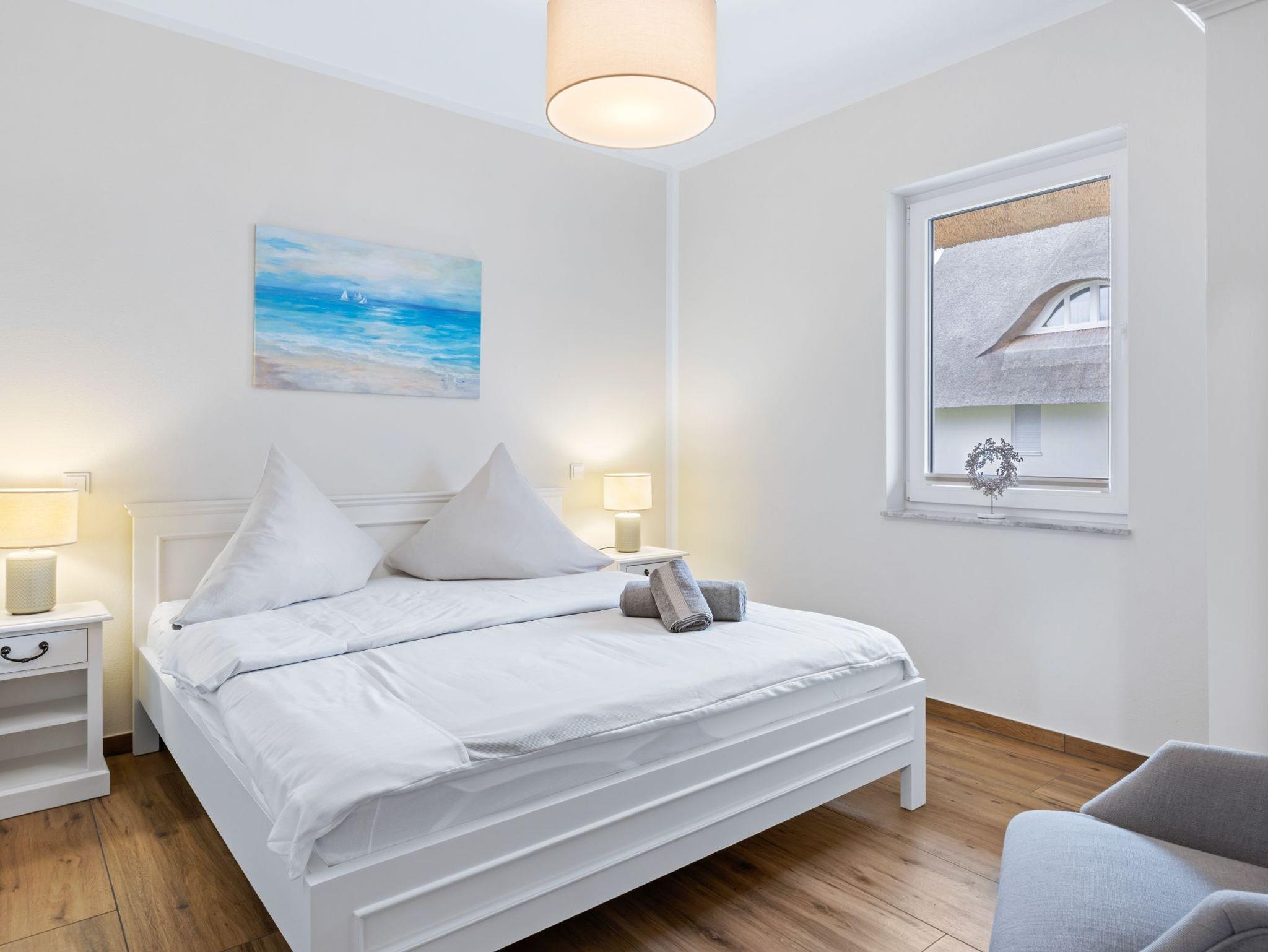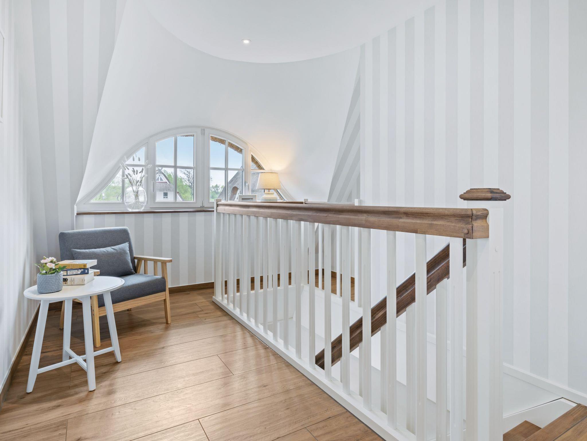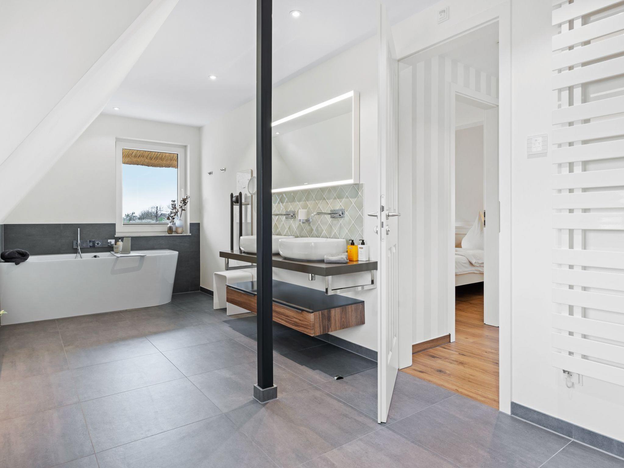 Im Obergeschoss befinden sich zwei weitere wunderschöne Schlafzimmer. Schlafzimmer 2 mit Doppelbett (1,80 x 2,00m), begehbarem Kleiderschrank und Homeoffice-Bereich. Schlafzimmer 3 mit Doppelbett (1,80 x 2,00m) und großem Kleiderschrank. Jedes der drei Schlafzimmer ist mit einem Smart-TV ausgestattet. In der Galerie des Obergeschosses lädt unter der wunderschönen Gaube ein gemütlicher Sessel mit Lesemöglichkeit zum Verweilen ein, somit gibt es viele individuelle Rückzugsorte in diesem hoch modernen und doch klar gemütlichen Haus unter Reet. Unter der Reetgaube öffnet sich das große Wellness-Wohlfühlbad mit begehbarer, ebenerdiger Dusche und Badewanne mit einem herrlichen Blick auf das Salzhaff. Besondere Highlights sind die großen Duschköpfe mit Regen- und Massagefunktionen, die das Duschen zu einem wahren Wohlfühlmoment werden lassen. Das Badezimmer verwöhnt unsere Gäste weiterhin mit einem Dusch-WC und einem Infrarot-Strahler, welcher zur Muskelentspannung dient.