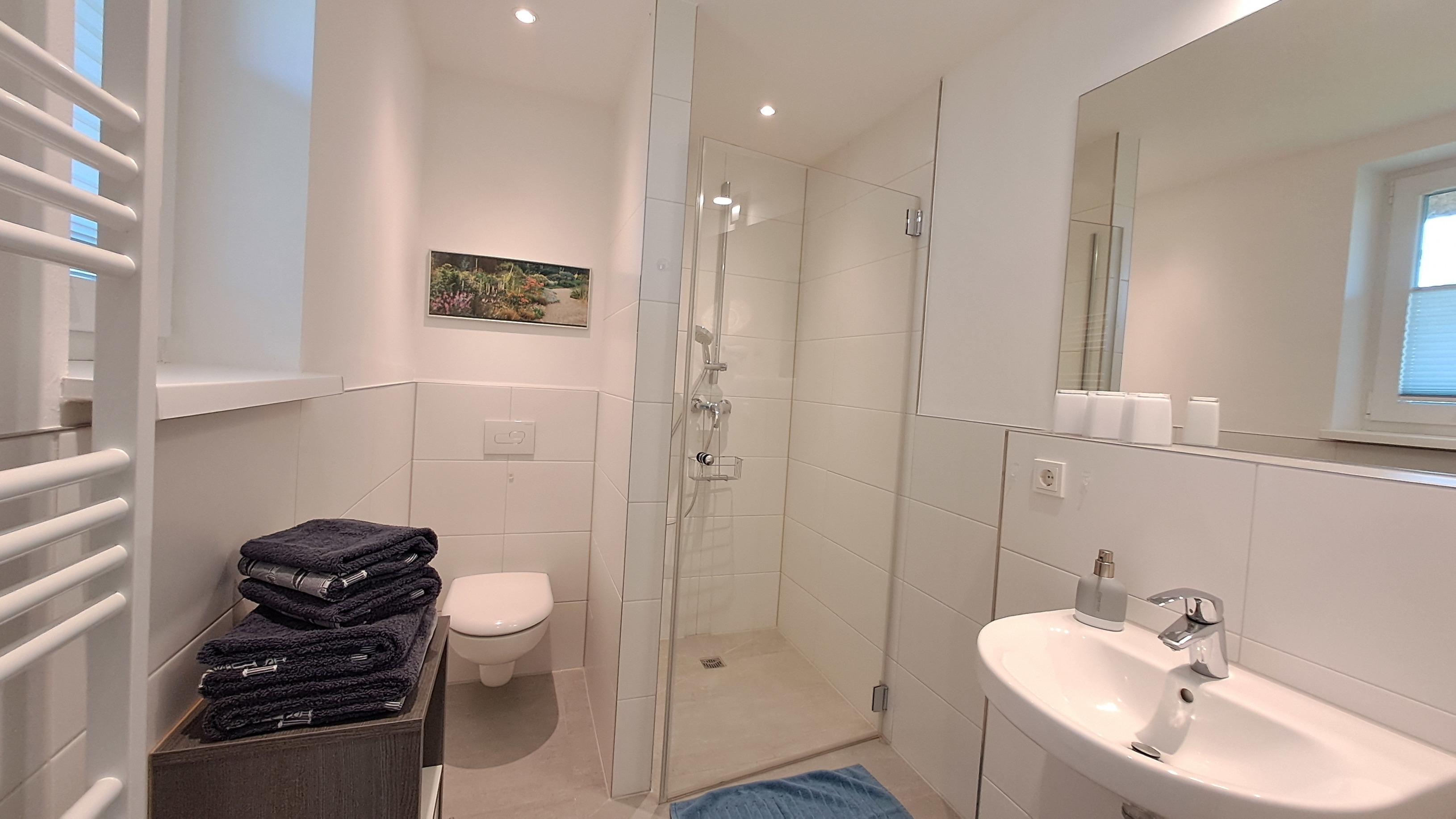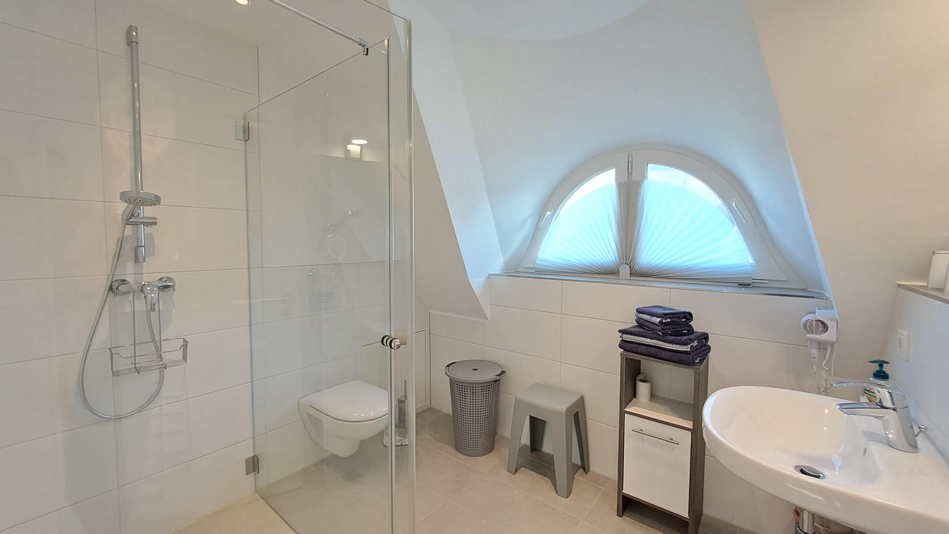 - Mit Fenster, bodengleicher Dusche, Handtuchwärmer, Spiegel, Waschbecken und WC sowie Ablagefläche und Föhn