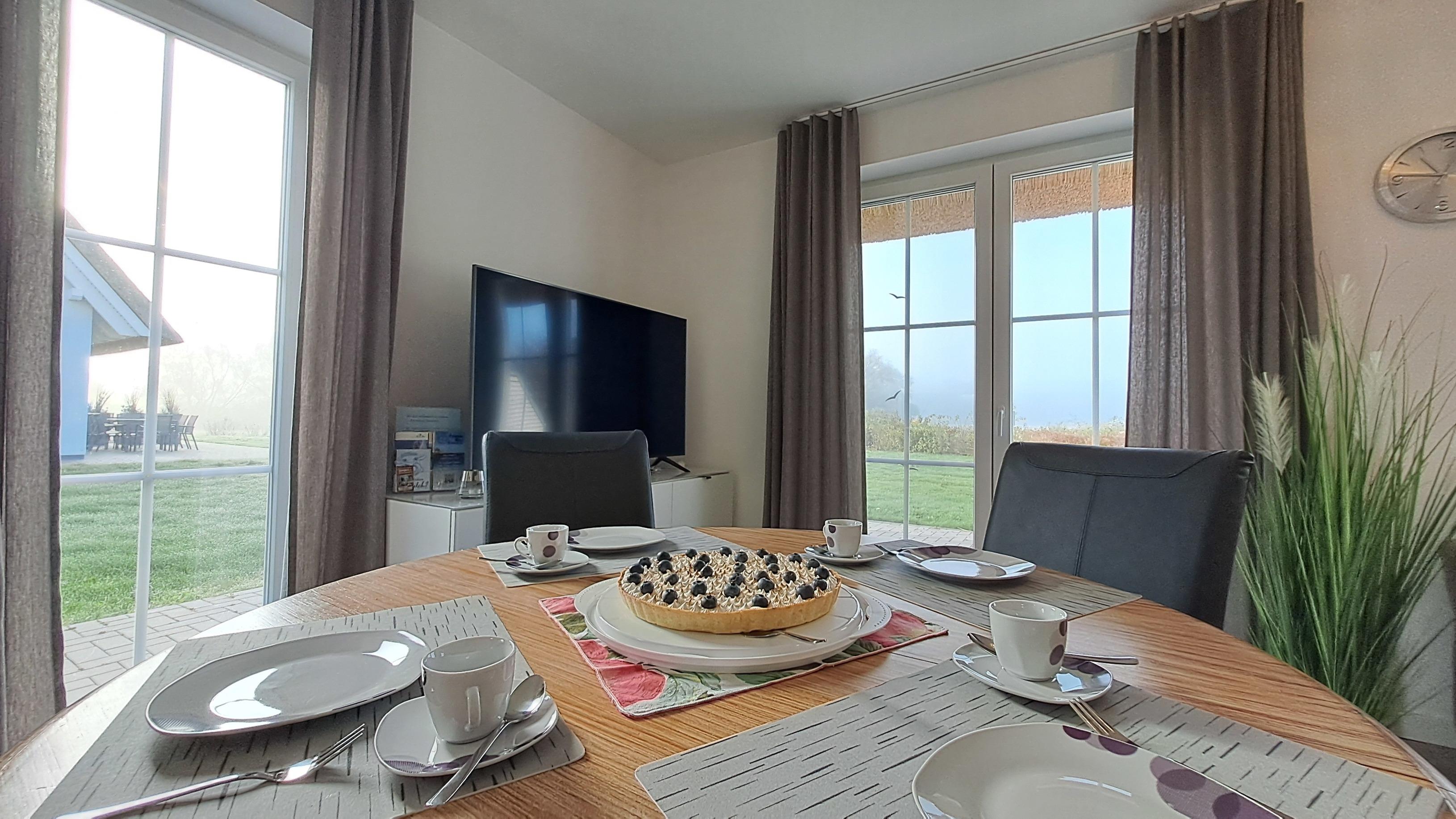 Die komfortable Doppelhaushälfte mit großer Wiese und Blick ins Grüne verspricht einen traumhaften Urlaub am Salzhaff. Auf der SÜDWEST-TERRASSE verbringen Sie laue Sommerabende mit Familie und Freunden. Terrassentisch/-stühle, Sonnenschirm/-liegen und ein Weber-Gasgrill laden zu jeder Tageszeit zur Erholung ein. Lassen Sie den Blick über die angeschlossene Wiese ins Grüne schweifen und die Seele baumeln.