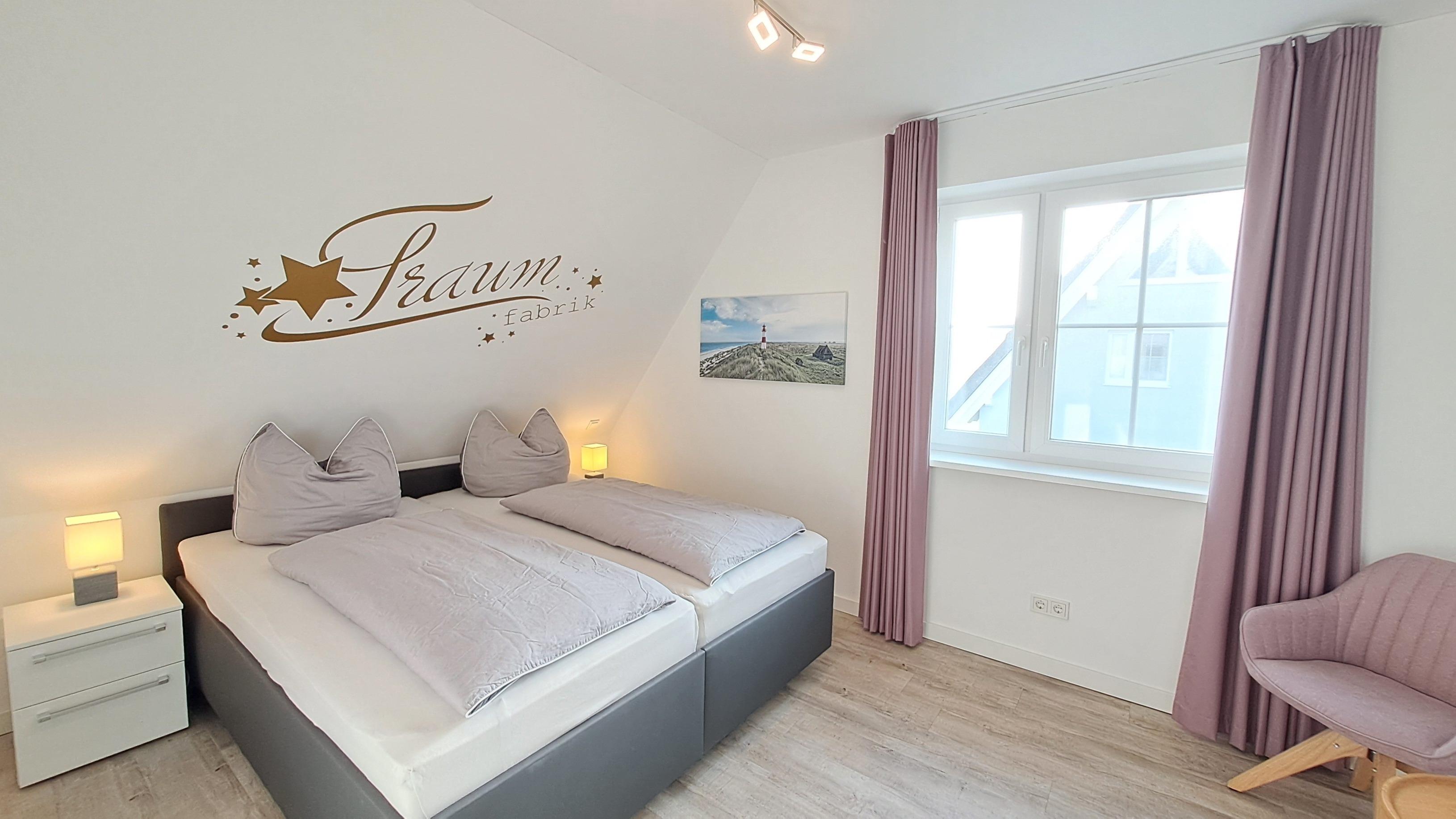 Es gibt insgesamt 2 SCHLAFZIMMER im 1. OG jeweils mit Doppelbett (180x200 cm), Kleiderschrank/Kommode, Flachbild-TV sowie 1 bzw. 2 Sessel und einem Beistelltisch.