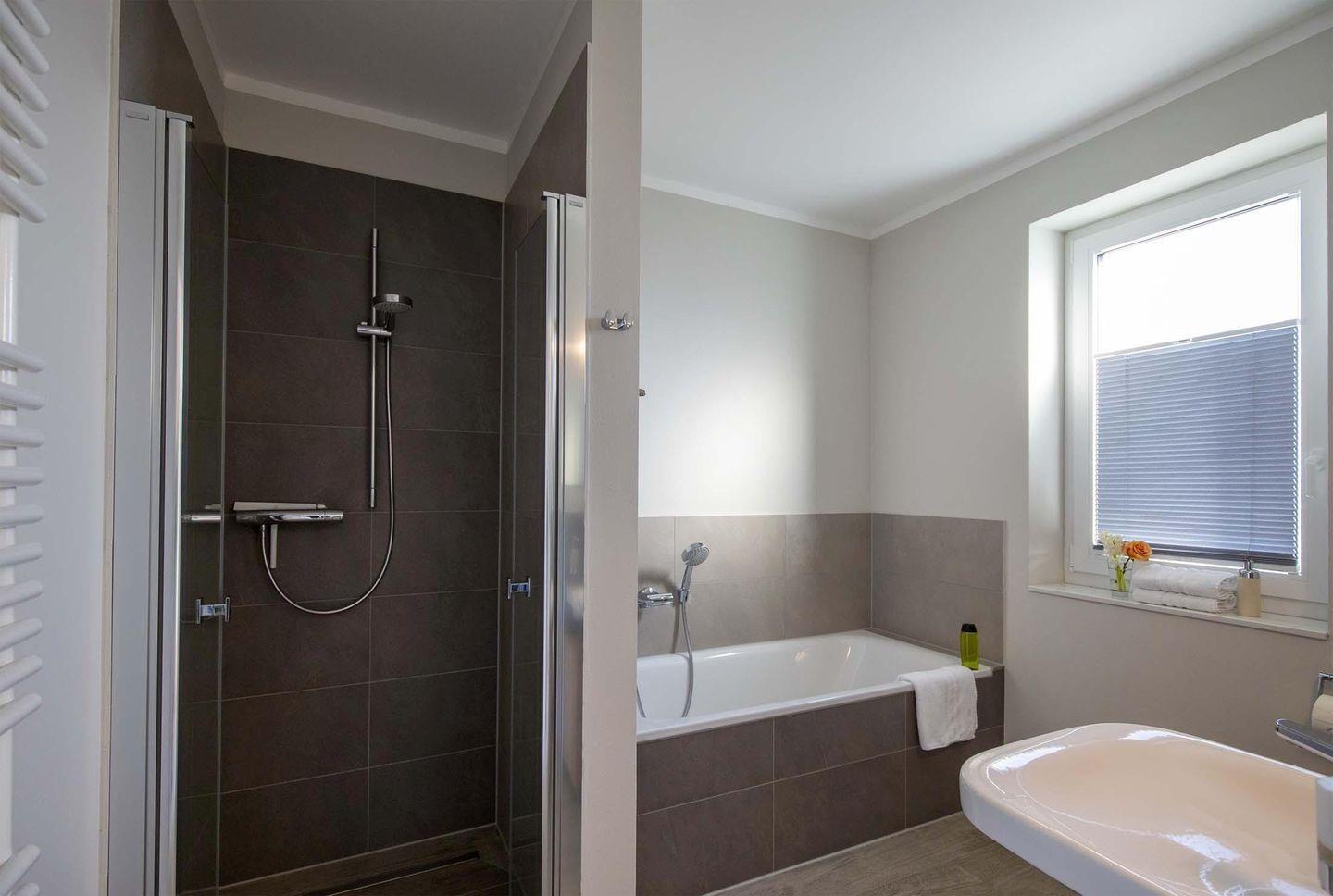 Das Bad besitzt eine ebenerdige breite Dusche mit einer ca. 90cm breiten Tür und eine Badewanne.