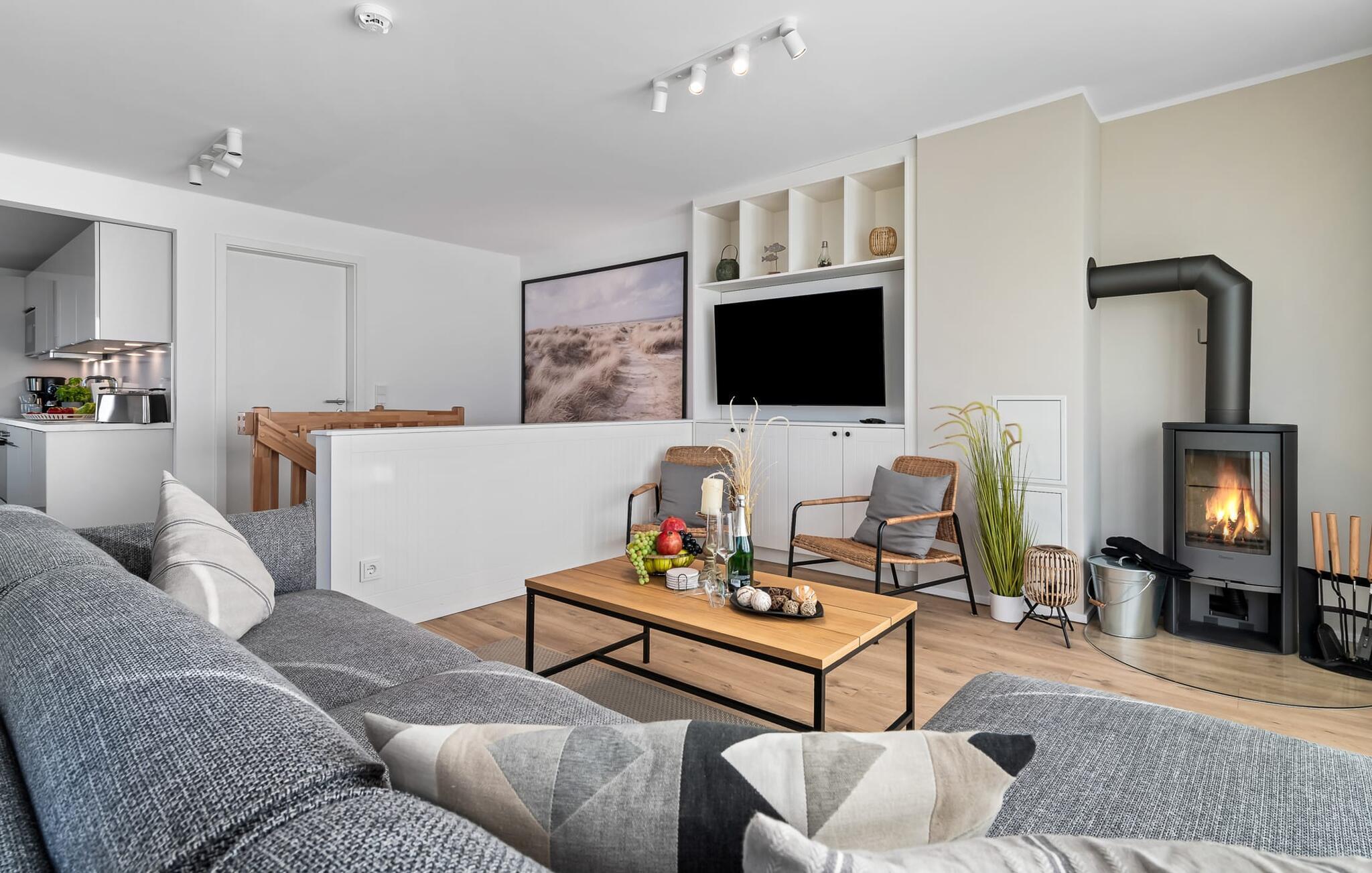 Unser Lieblingsplatz: nach einem Strandtag den Tag auf der großen Sofalandschaft vor dem Kamin ausklingen lassen.